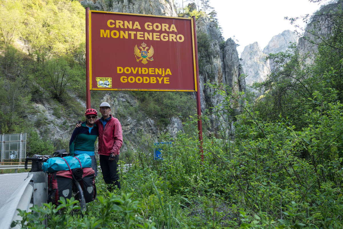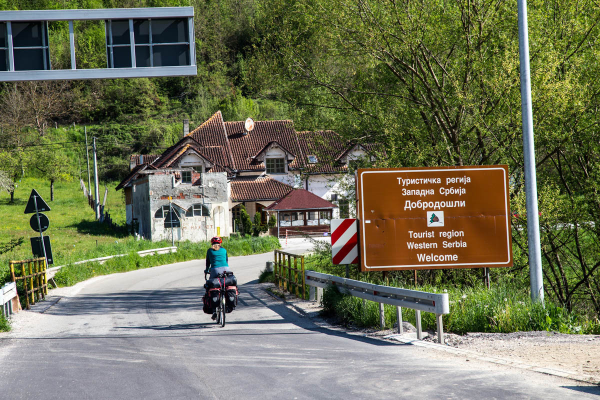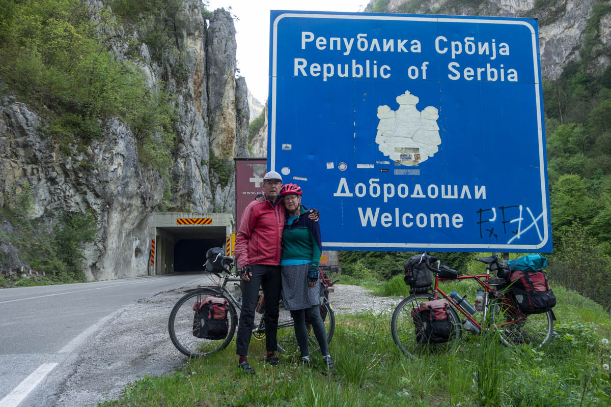 The road continues following the Lim River. As we near the Montenegro – Serbia border we see the mountains closing in. Through Montenegro immigration, then a long section of no-man's land. In the middle are two nice signs welcoming you to the country, we stop and take pictures. Then we ride through the tunnel and down a spectacular gorge. Traffic is still pretty light.