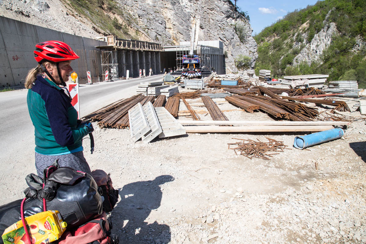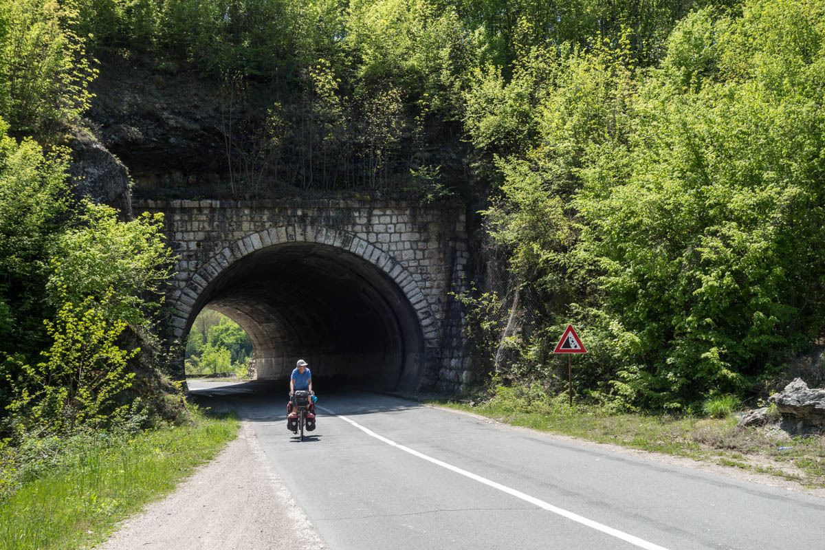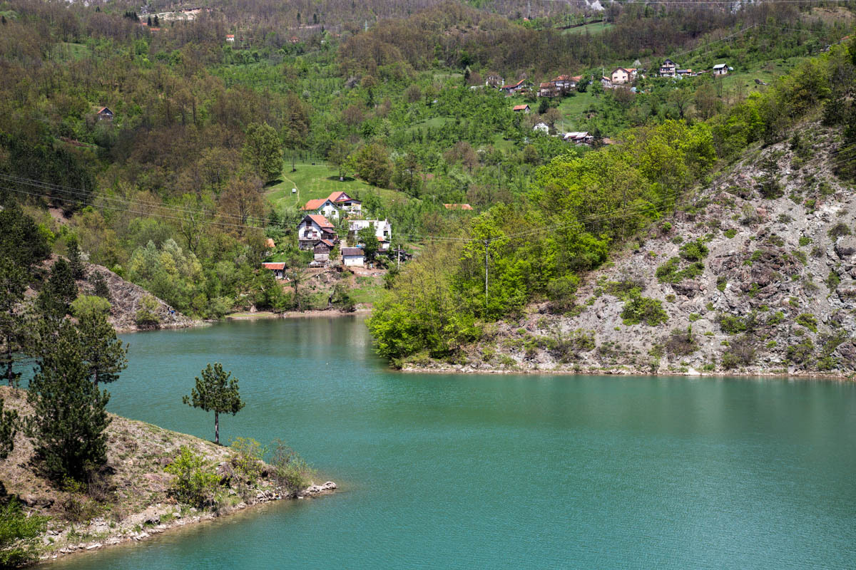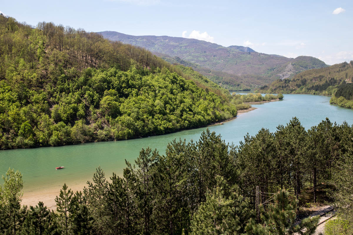 Traffic has been getting steadily worse, there are some trucks and a couple of cars that come too close for comfort. We are happy when we reach the turn-off where our road branches off the main road that goes to Belgrade. We ride along a long reservoir, pass the dam and have a short downhill. Then more ups and downs. 80 kilometers is long today.
