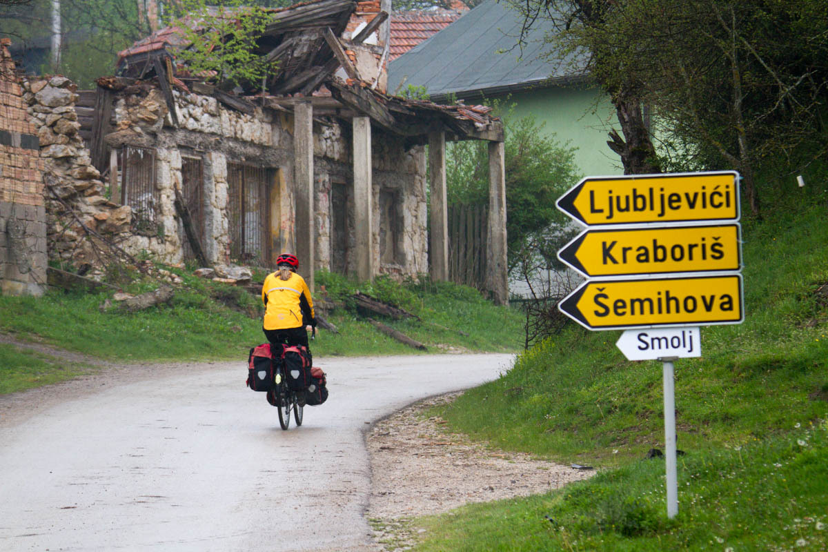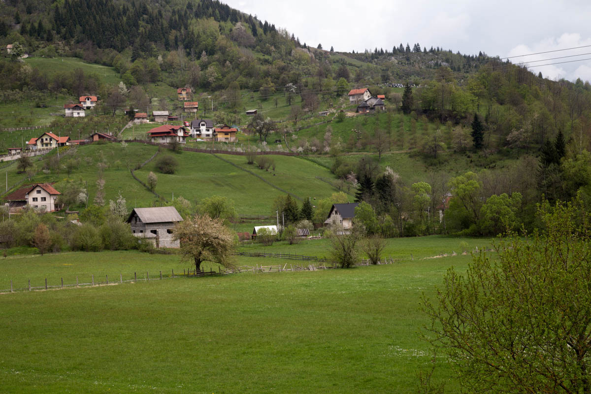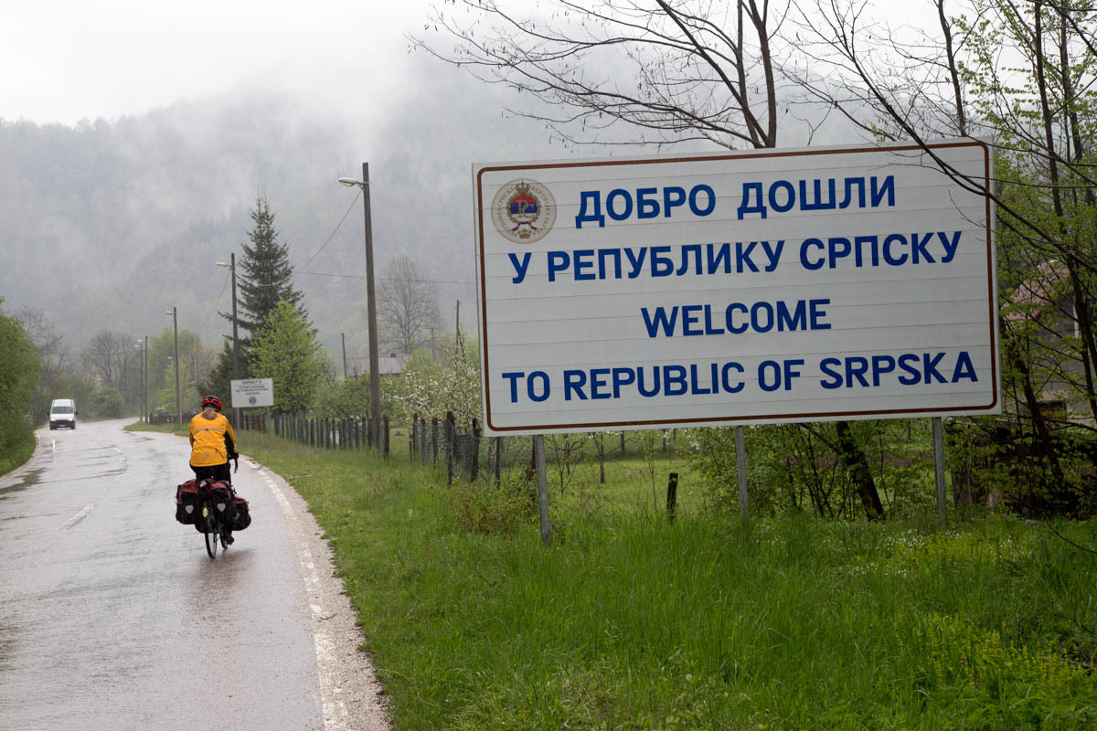 The road follows the boundary between the Federation of Bosnia and Herzegovina and the Republika Srpska, the two entities that make up Bosnia Herzegovina. We first think people in the Republika Srpska are flying the Russian flag, but the colors are reversed.