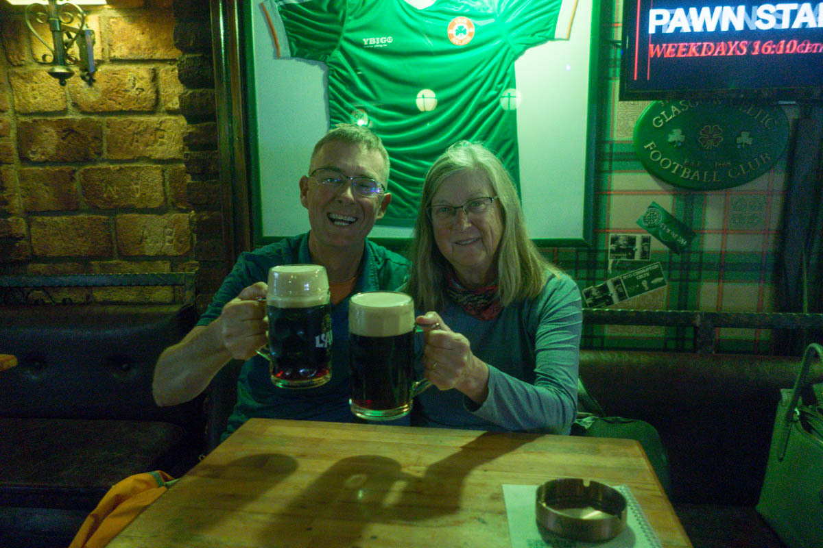 Afterwards we visit the Celtic Pub for a nice dark Czech Budweiser draft beer. The rain has picked up again, we head back to our room and watch a bad movie.