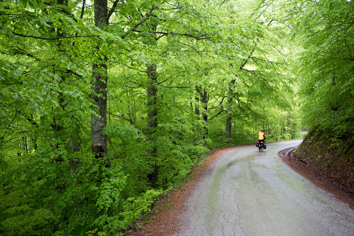 For 13km, the switchbacks take us down through beautiful beech forest. The road flattens out a bit but the rain gets more significant. We stop for coffee in a small town. Men also in the cafe are gambling a popular activity.