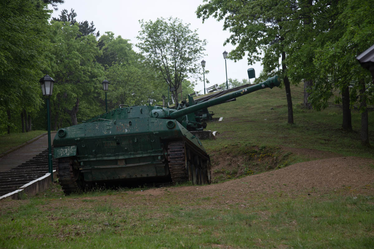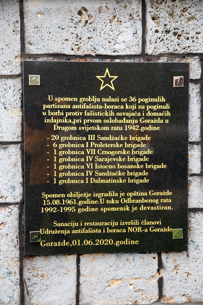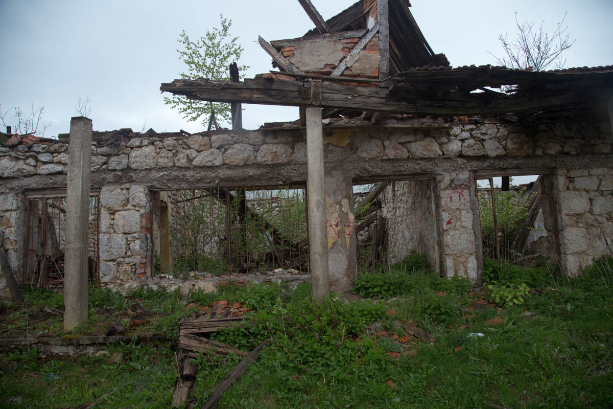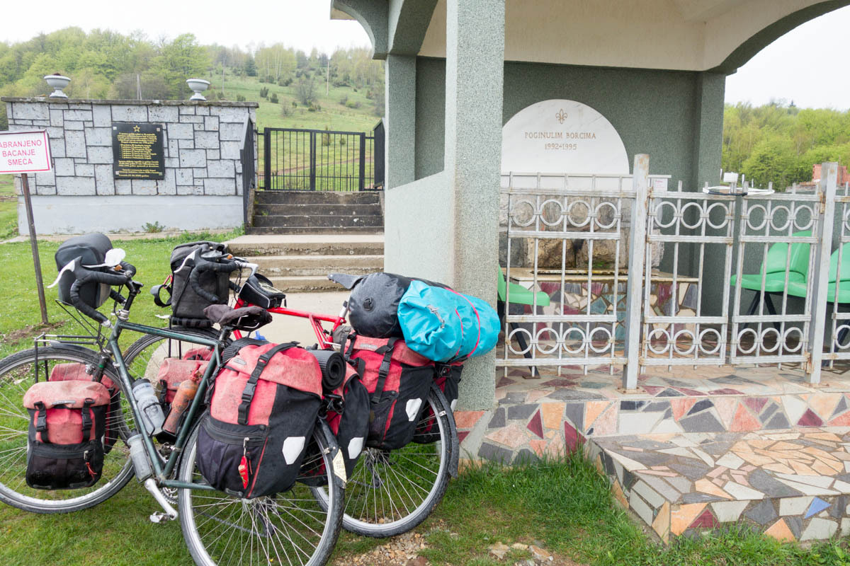 The hotel owner is driving us to the top, we need to remove the front wheels and the bikes and gear get fitted in the back of a station wagon. The driver and Patrick speak French to each other. On our way up the hill we learn more about the seige of Gorazde. On the hill high above Gorazde, the driver explains how snipers, tanks and artillery positioned themselves on the hills around the town pound the residential area. He stops for us to see the memorial park where a Serbian tank is still parked.