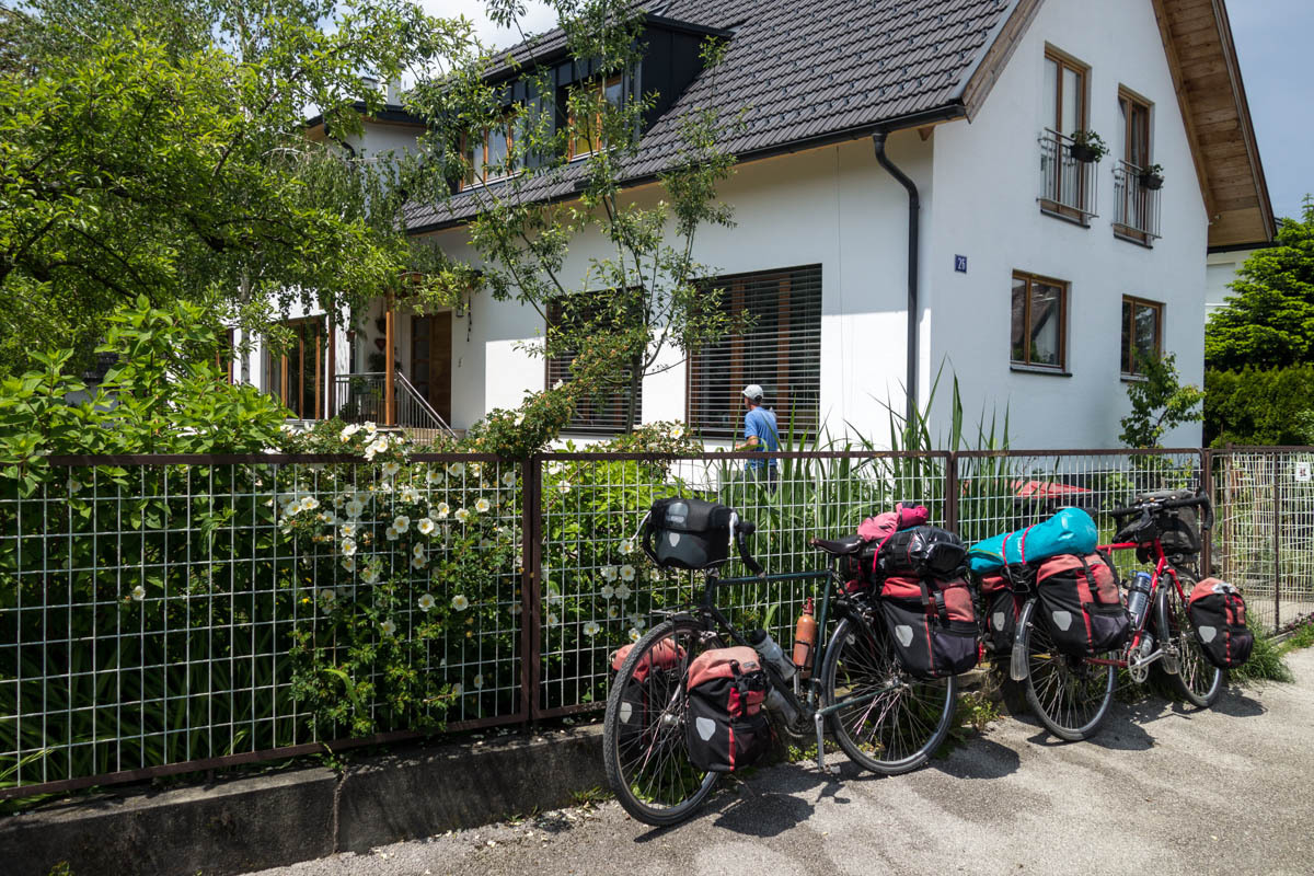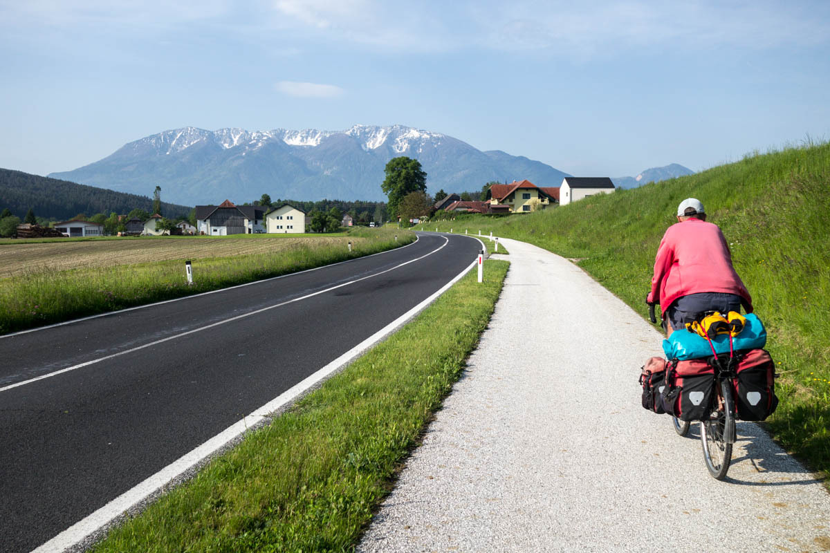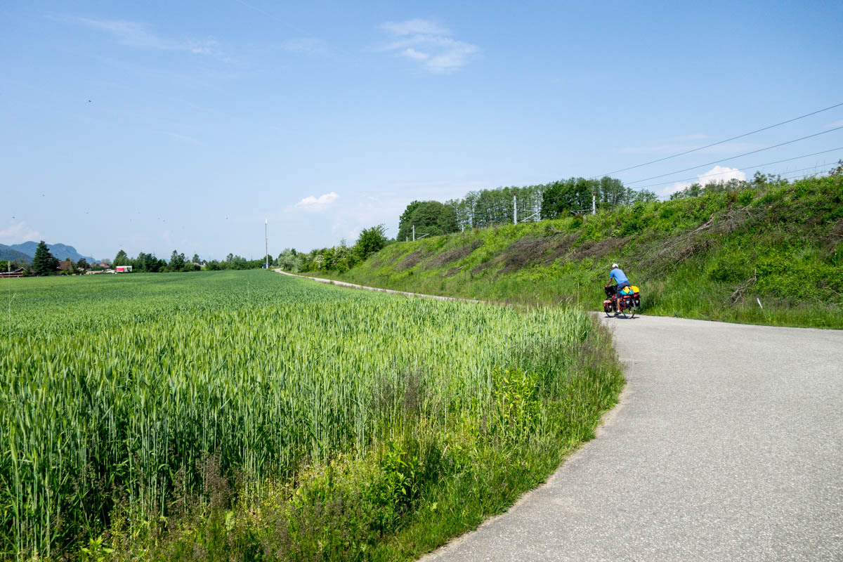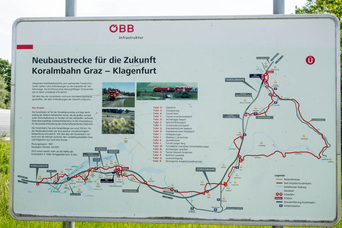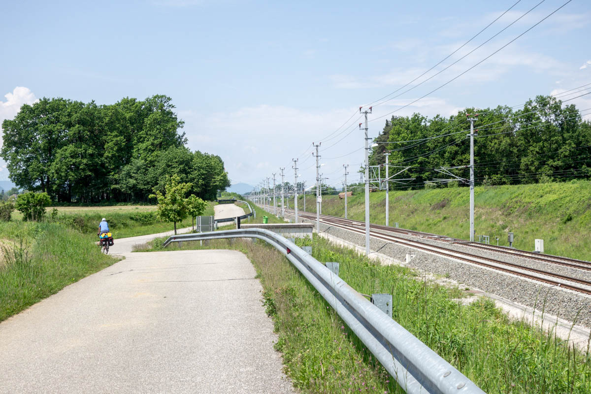 Still, there are no cafes for coffee to be found until we are quite close to Klagenfurt. The last ten kilometers is along a nice trail that follows a new railroad line. We zigzag our way to our Warmshowers host.