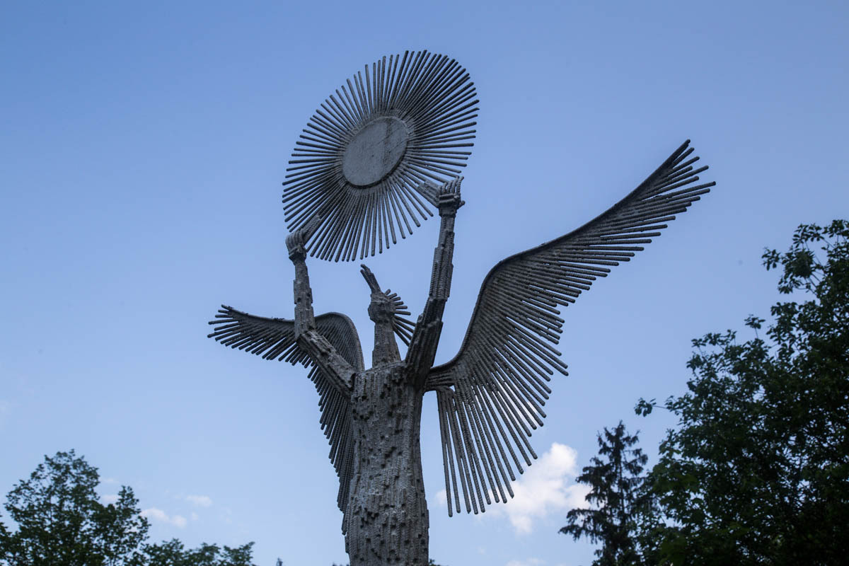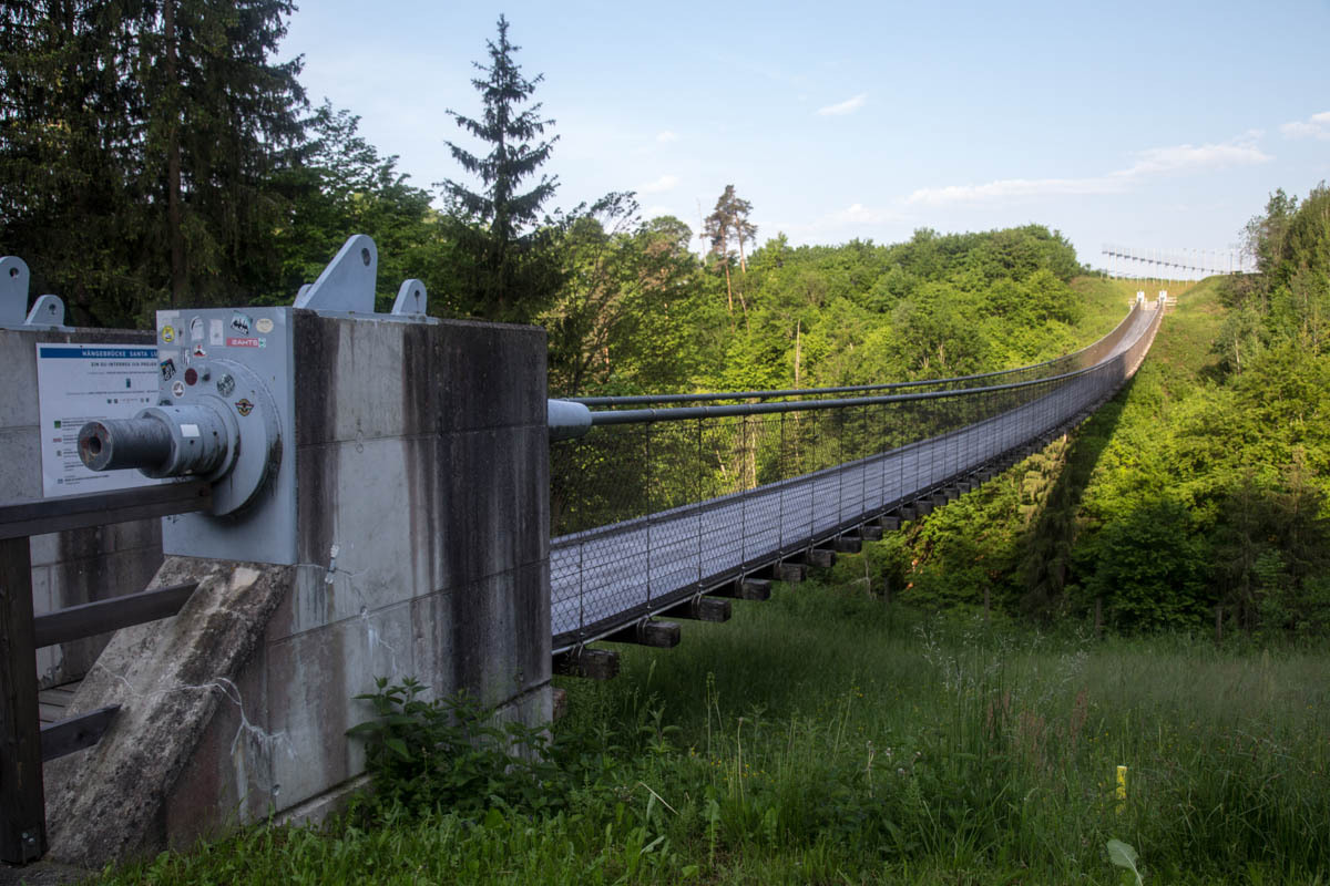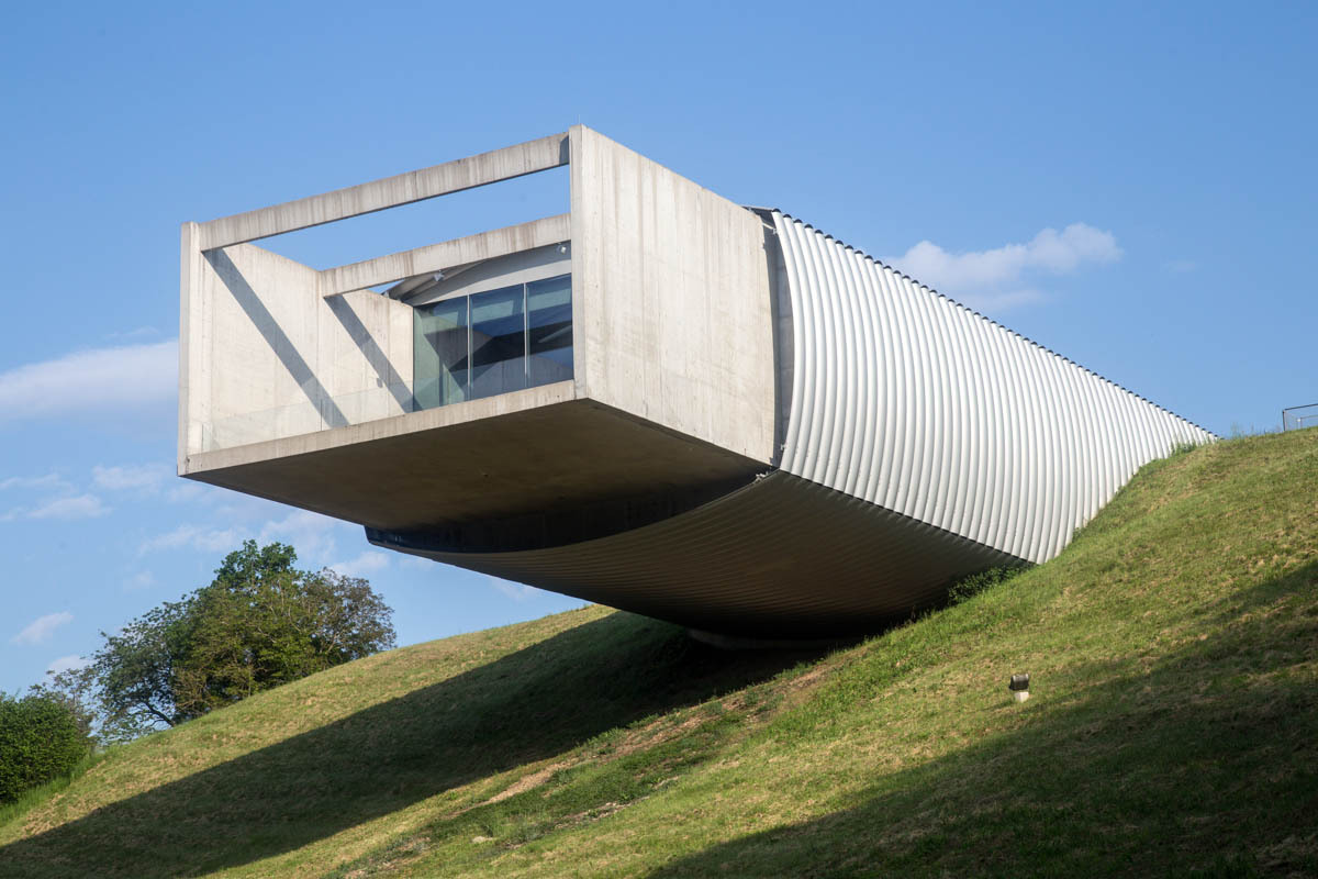We find the bike path that leads us out of town and we start the hill climb past the dam. We come up to a museum that has a strange building overlooking the hillside. It looks like a tunnel sticking out of the hillside: Quite the cantilever action going on.