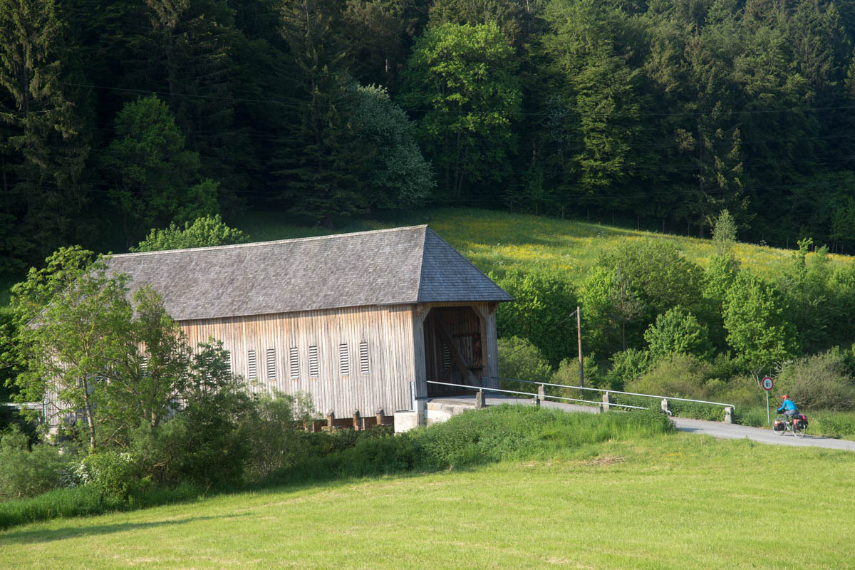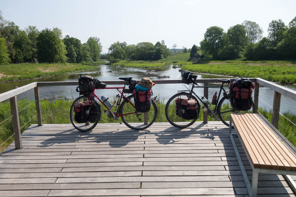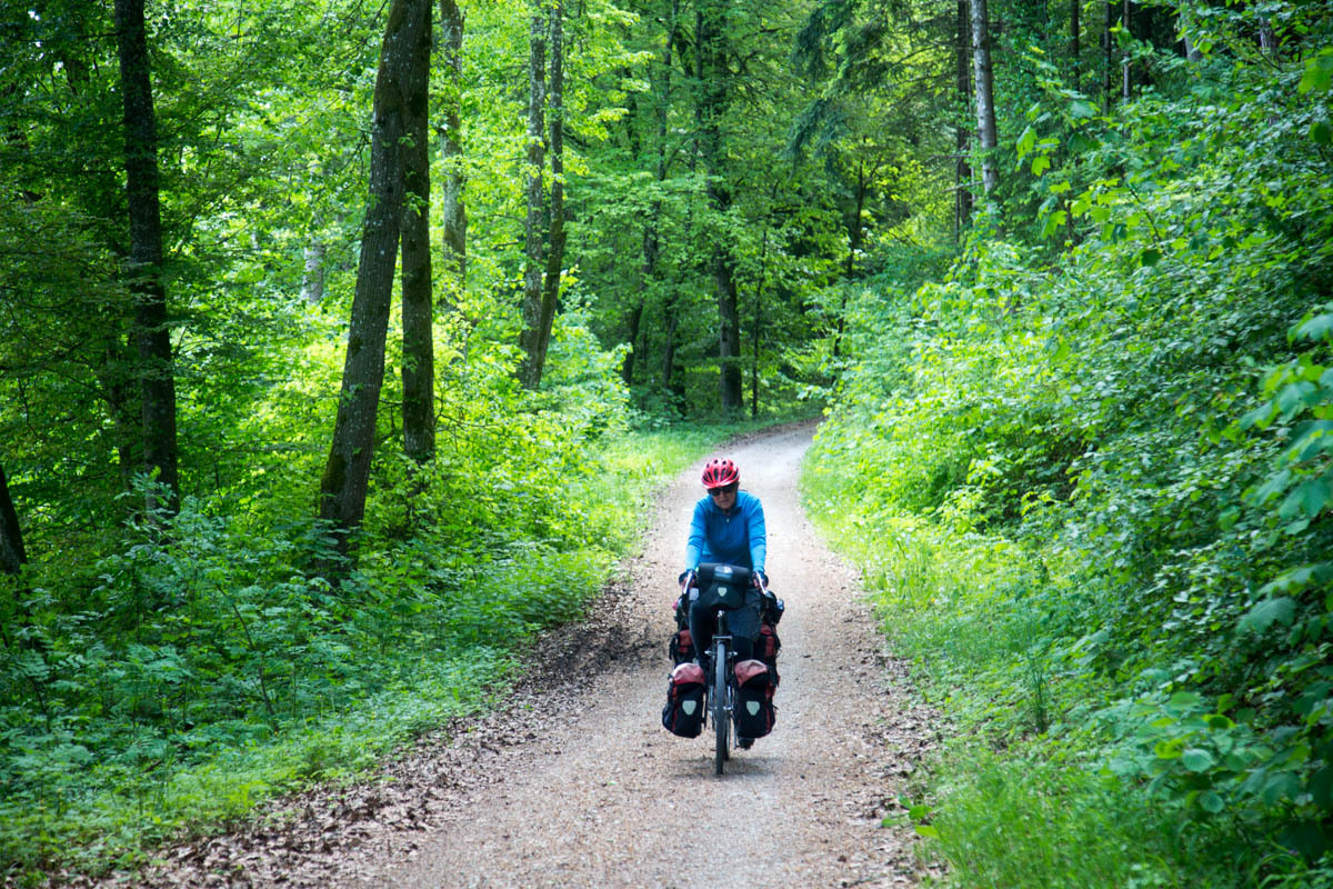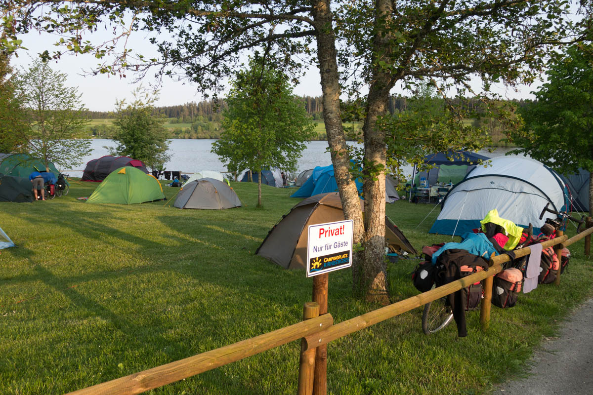 We are aiming for the campground recommended by Maren. It is nicely spread out along a lake. Because we took a wrong turn we approach the lake from the other side though and have to make our way around and climb another hill to get there. The reception is closed for an extended lunch but the tenting area is obvious so we pitch. A German woman who is in the same situation comes and asks us if we think it is okay to pitch without registering first. We reply we are not sure, but why not? She responds with “it is in our DNA to follow the rules” and has a good laugh with us. It is a holiday weekend and the campground gets very busy, but we get to pay for our site (expensive at 33 euros) and receive a key to the showers.