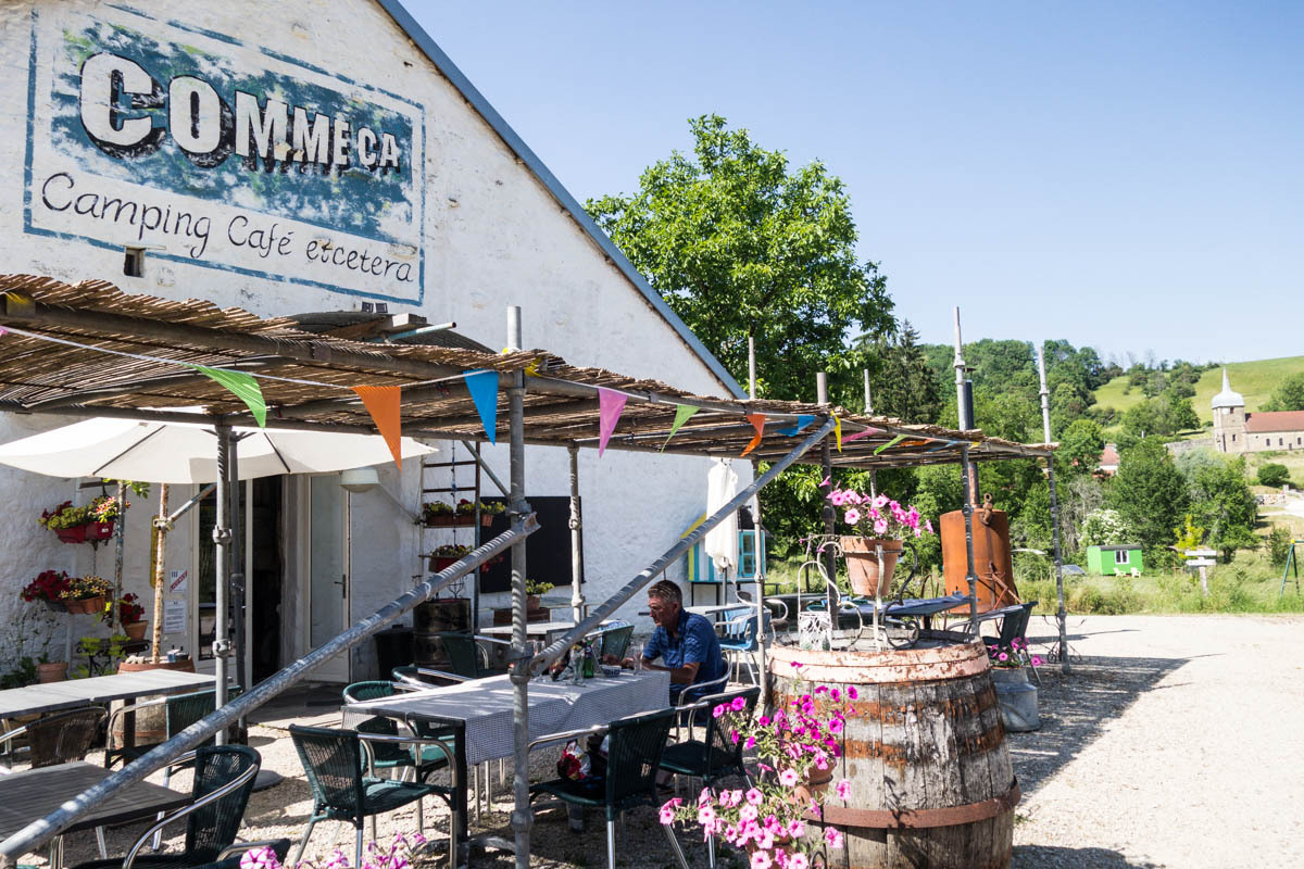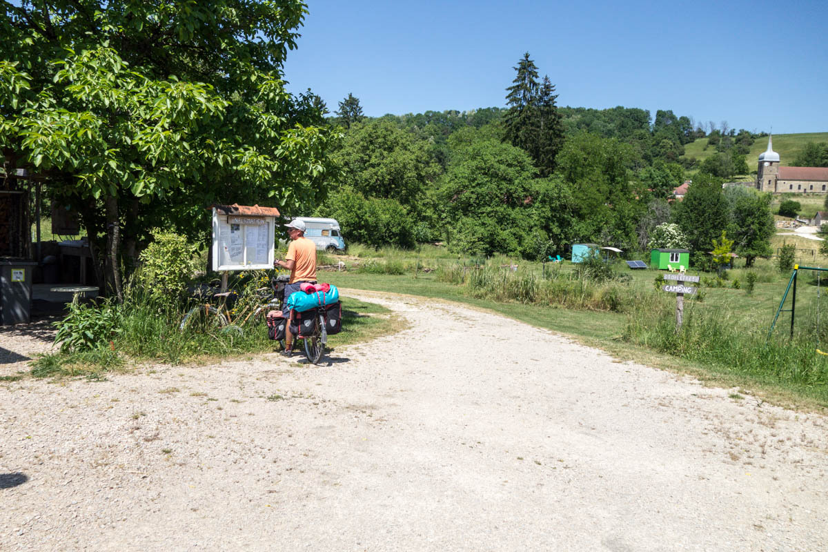 The campground tonight is in a small village with no shops at all. We found it on Googlemaps and are happy that it actually exists. The field is behind a large old farmhouse, there is nobody at the restaurant/reception when we arrive, but plenty of posted instructions. We find shade under a walnut tree and take our showers. A plug-in in the restroom lets us charge our tablet. With the complicated route we are relying on our tablet and GPS, but it has been difficult to find charging places in campgrounds. You either buy electricity for your camper, or there is nothing.