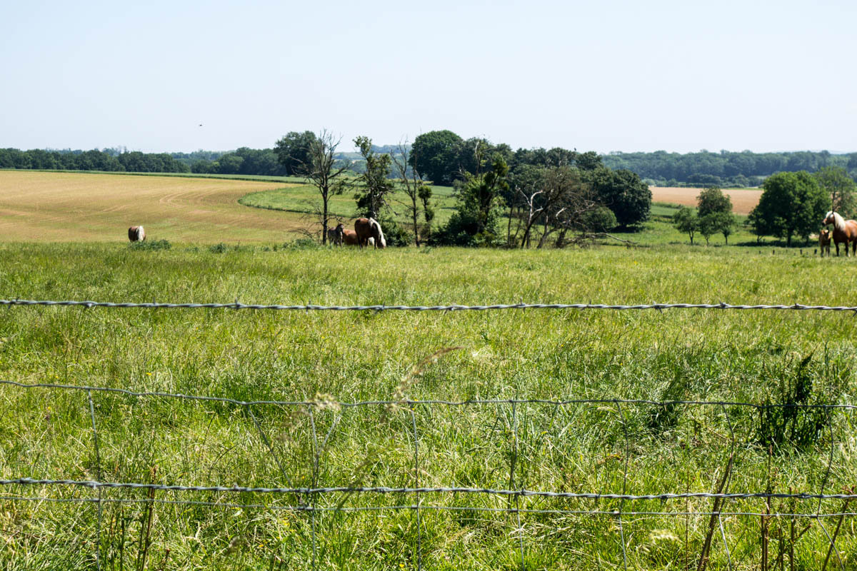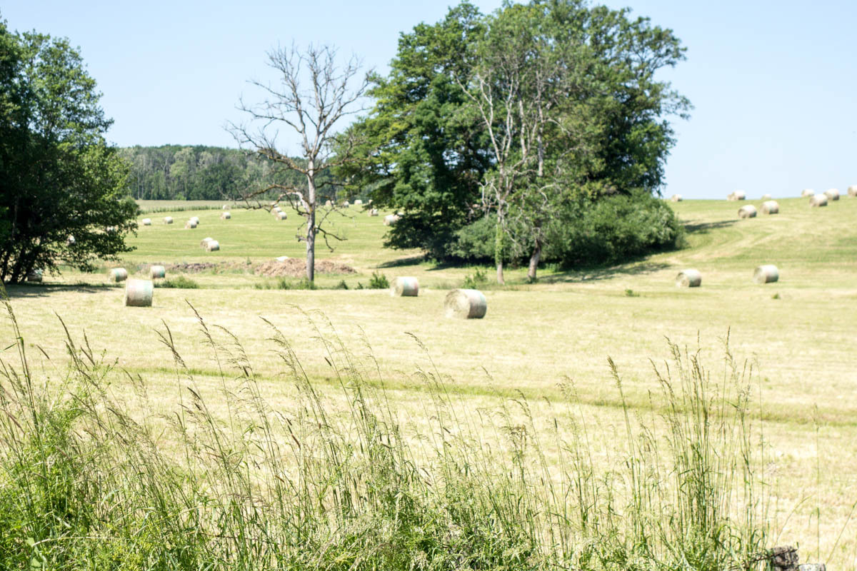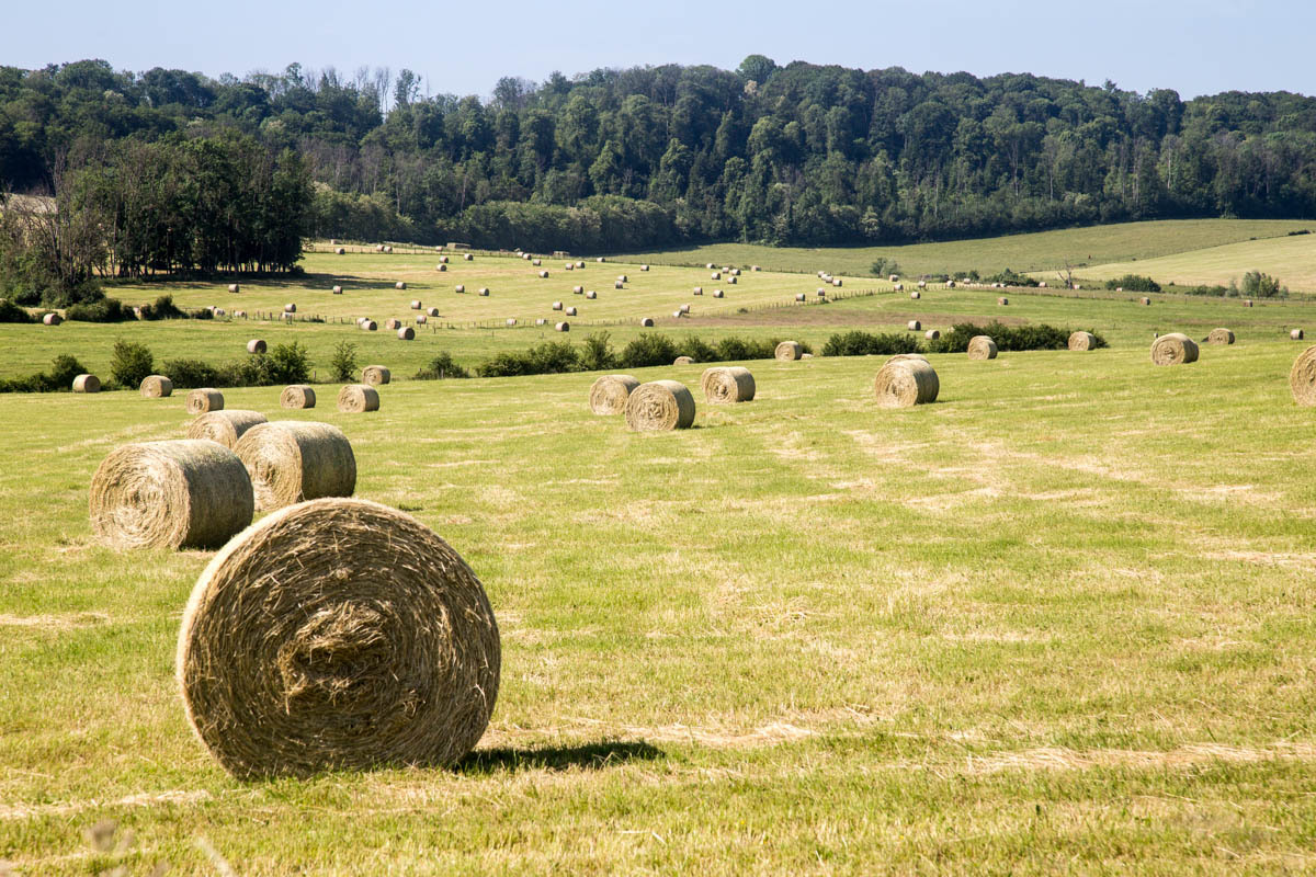 The ride is very nice though, mostly on quiet rural roads, some only a car width wide. We pass through several small towns, none of them have anything except houses and old Chateaus, and in some we don’t even see people. There are a lot of large farmhouses abandoned. “There are hay bales as far as the eye can see,” Patrick declares. Farmers are hard at work mowing, piling the hay in long rows and then rolling into big round bales.