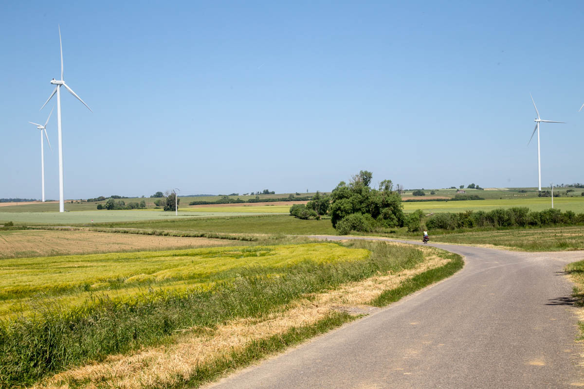 The wind is partly against us today, we struggle for a bit, then get a tailwind, then turn again with a headwind. By the time we get close to our destination it has become tough. RWGPS has given us a very nice route today, except for one hiccough where we are sent into a farmer’s field on a track that dead-ends at a large ditch. We have to backtrack several kilometers.