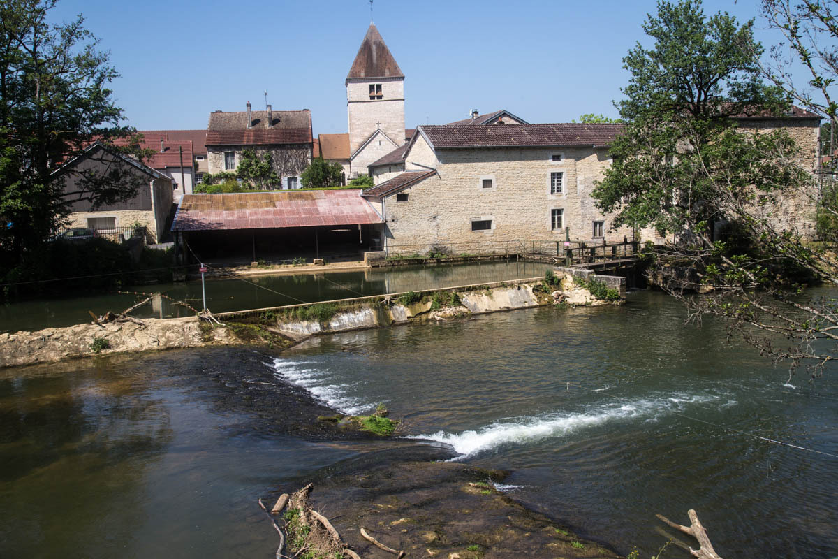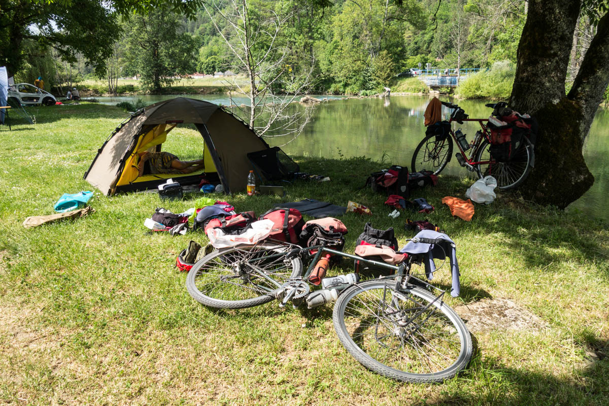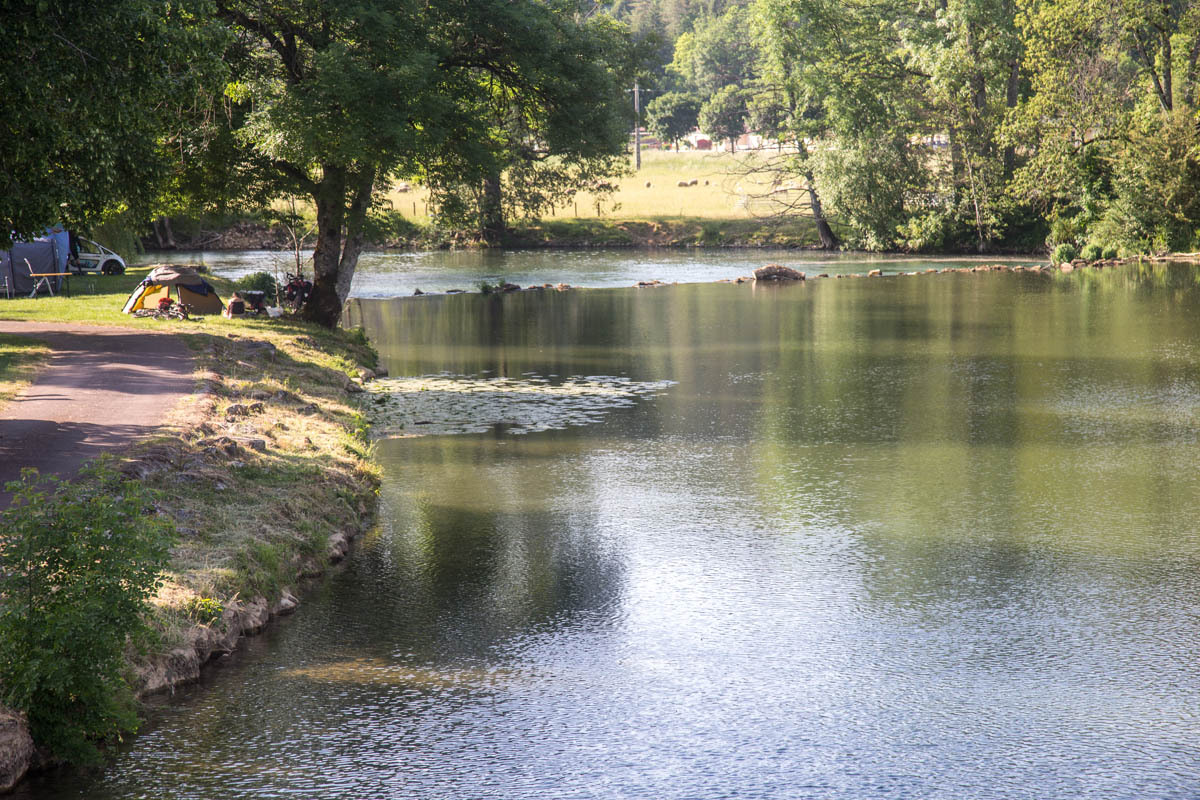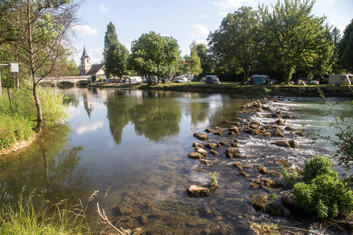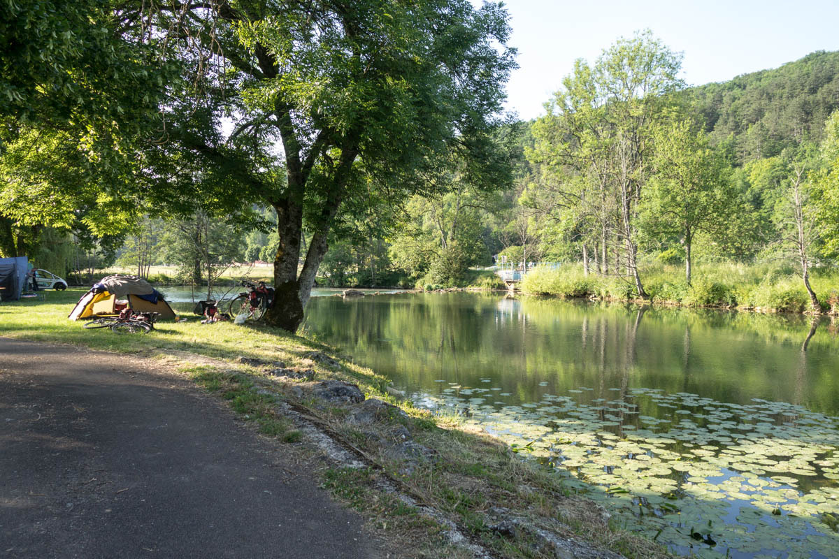 At around noon the temperature is getting warm. We have about 25km to go to our two camping options. Two small towns about 4 km apart each have a highly rated municipal campground right along the Marne river. We check out the first one in Vouecourt. There is good shade and lawn right on the river’s edge, so we go no further. The campers seem to be mostly Dutch. One brave camper is flying a French flag.