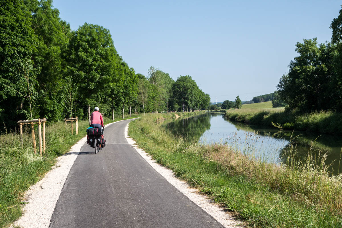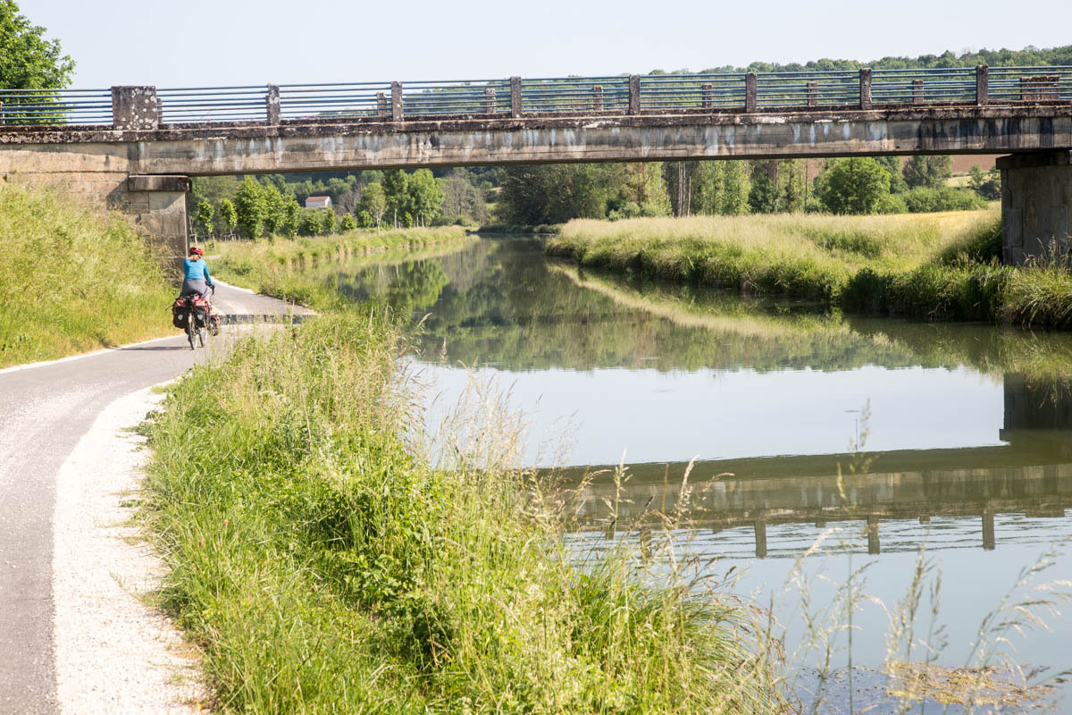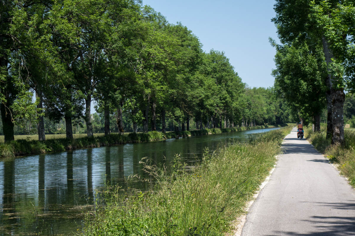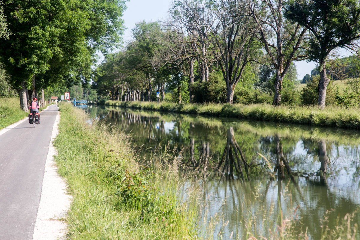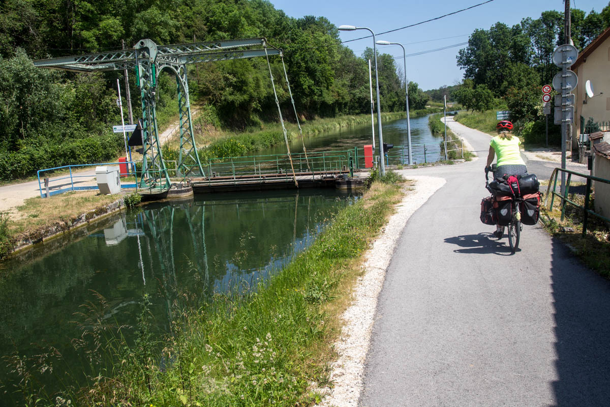 Coffee is good, but we are surprised at the 3 euro plus price tags these days. The bikepath is awesome it follows the canal that’s called the Champagne De Bourgogne Canal. We see a few pleasure boats and also a couple of freighters. Mostly the canal is empty with long stretches of solitude and at least 40 locks that we pass going downhill. The wind picks up in the afternoon, but most of the time we have good cover from the trees along the canal.