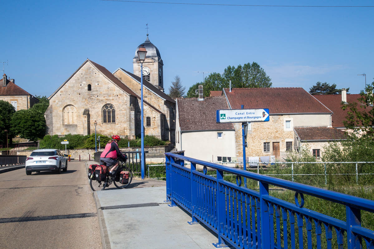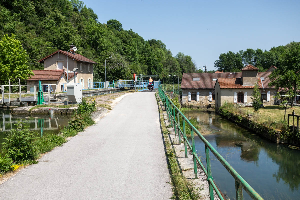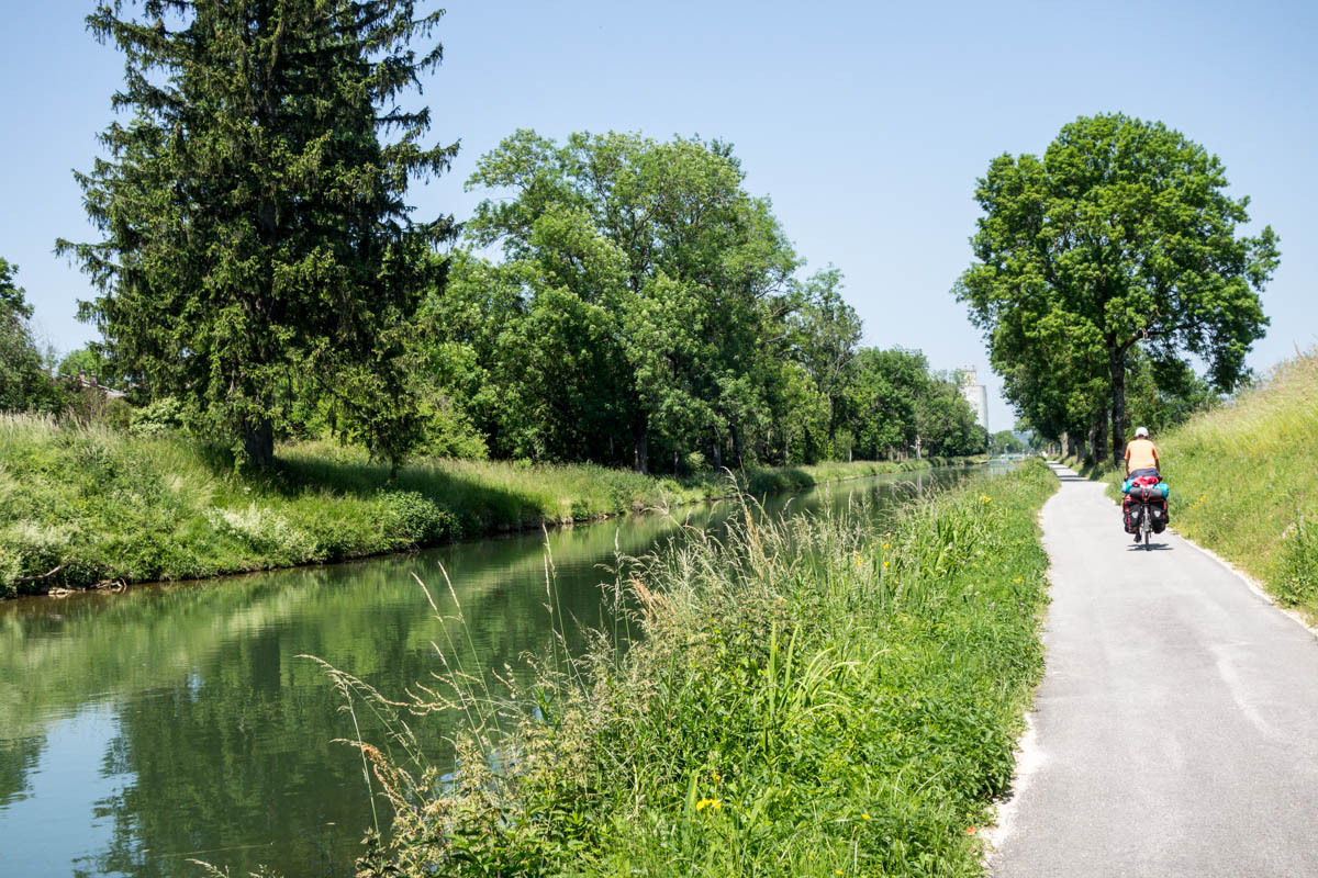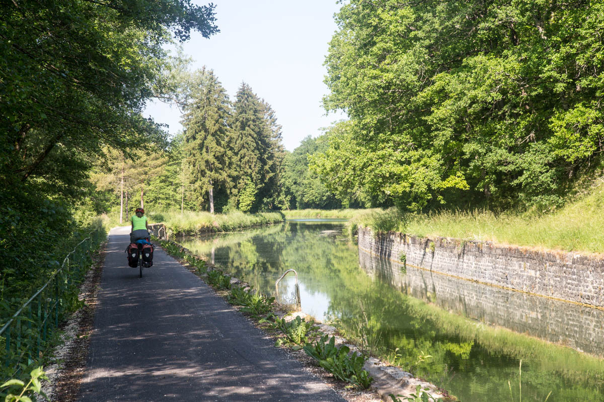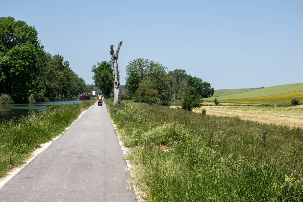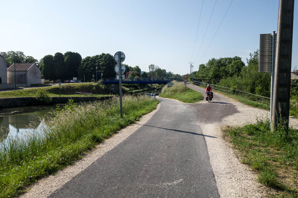 Coffee is good, but we are surprised at the 3 euro plus price tags these days. The bikepath is awesome it follows the canal that’s called the Champagne De Bourgogne Canal. We see a few pleasure boats and also a couple of freighters. Mostly the canal is empty with long stretches of solitude and at least 40 locks that we pass going downhill. The wind picks up in the afternoon, but most of the time we have good cover from the trees along the canal.