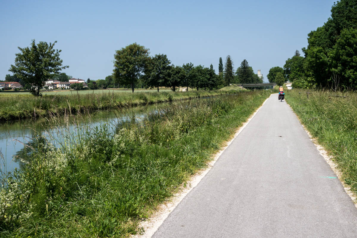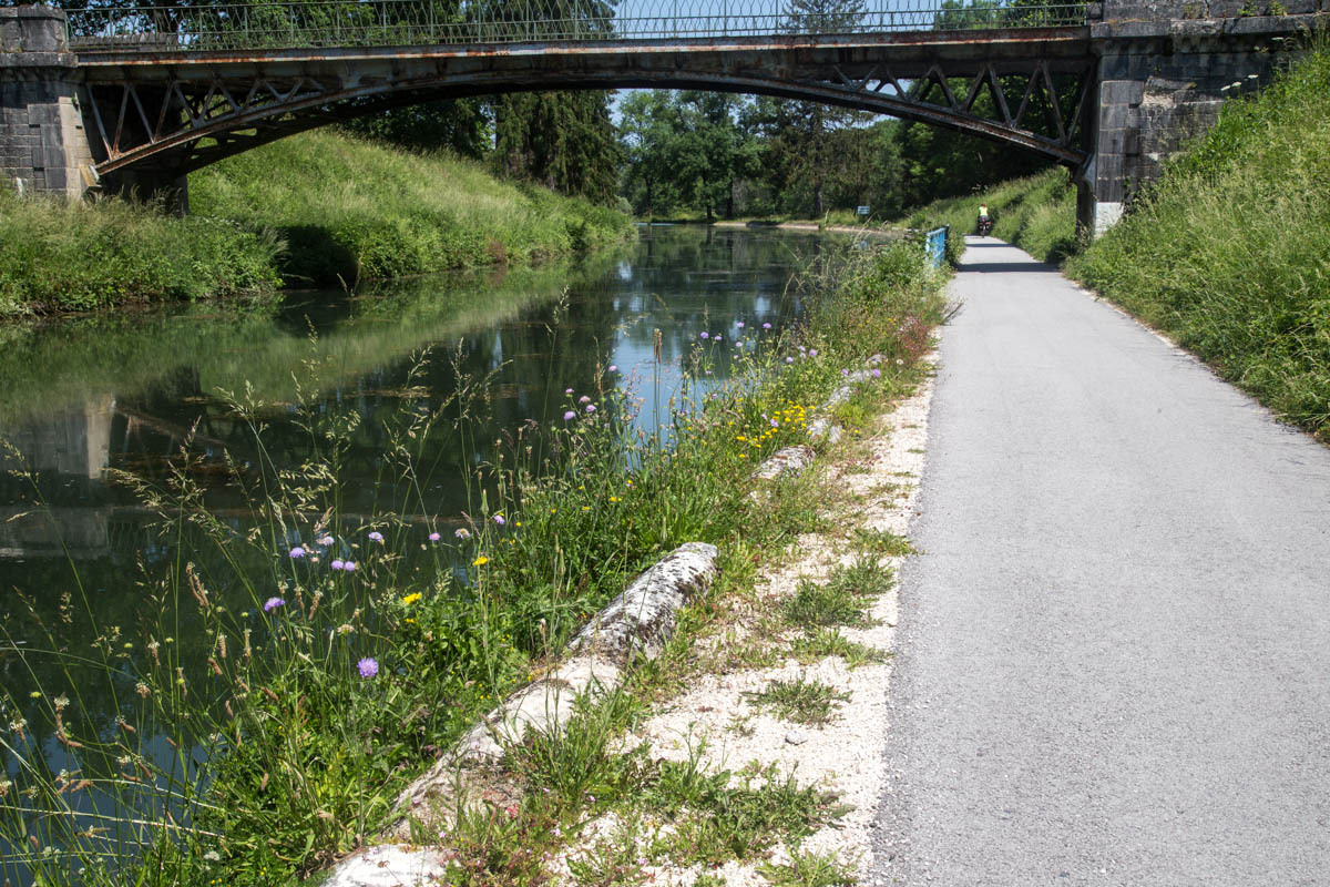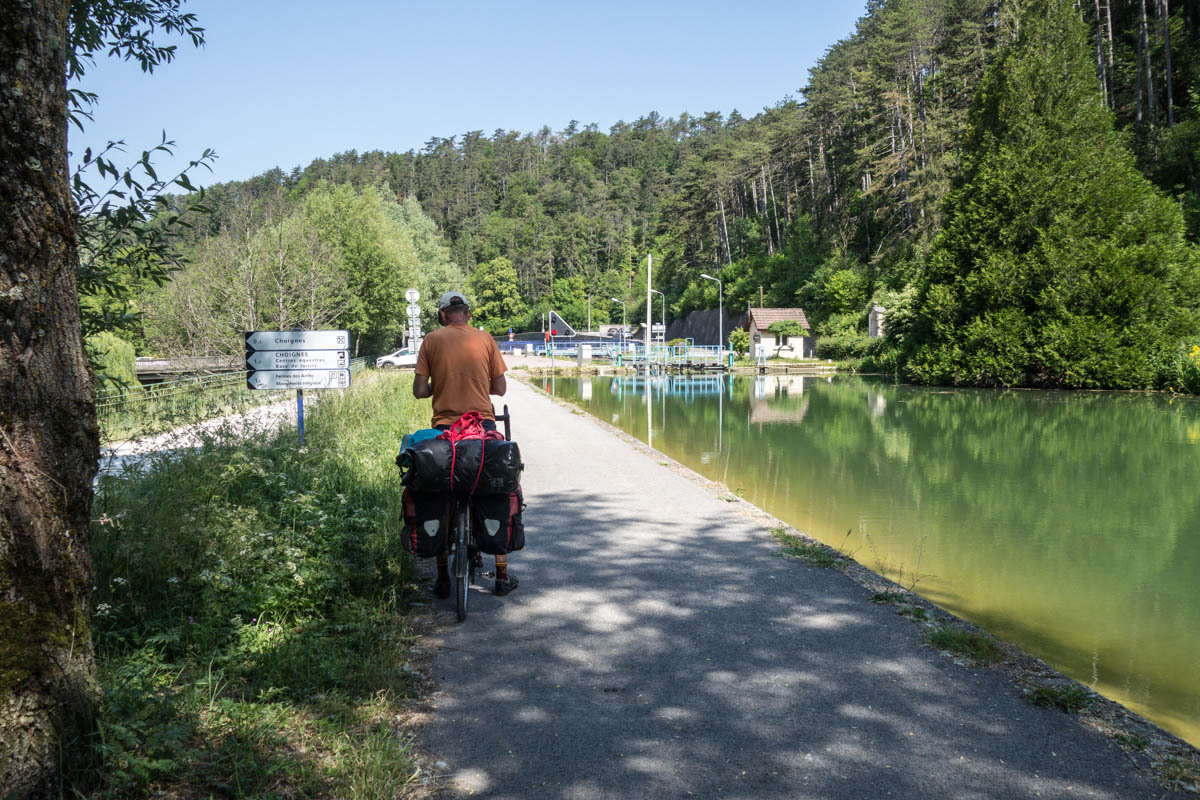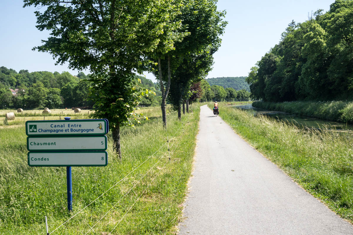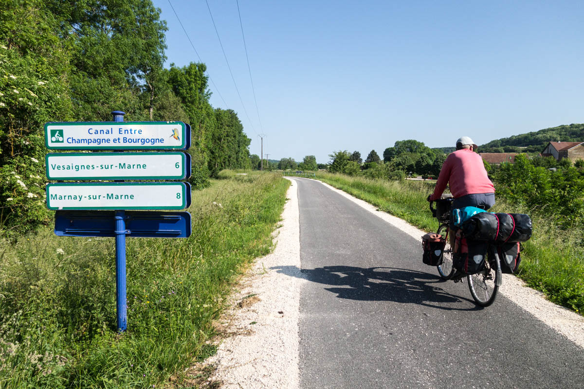 Coffee is good, but we are surprised at the 3 euro plus price tags these days. The bikepath is awesome it follows the canal that’s called the Champagne De Bourgogne Canal. We see a few pleasure boats and also a couple of freighters. Mostly the canal is empty with long stretches of solitude and at least 40 locks that we pass going downhill. The wind picks up in the afternoon, but most of the time we have good cover from the trees along the canal.