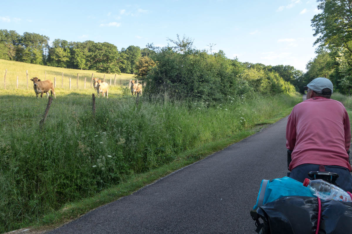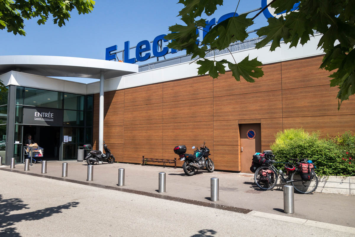 In Chaumont we go off the trail to do some shopping at a large Leclerc grocery store. It is a zoo with many French pushing shopping carts down grocery aisles. Rachel waits outside and observes how so many people pause outside to finish up their cigarette before entering the store or light a new one up as soon as they clear the exit door. Also, the man purse is back.