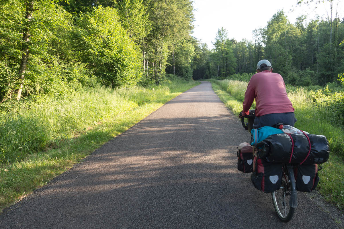We start with a pretty good climb out of town, a large hairpin, into a dense forest. Then onto a small plain and a downhill to the next river. From there one more climb onto a much larger plateau. We can see the hills on the edge across which the Marne River valley is located.
