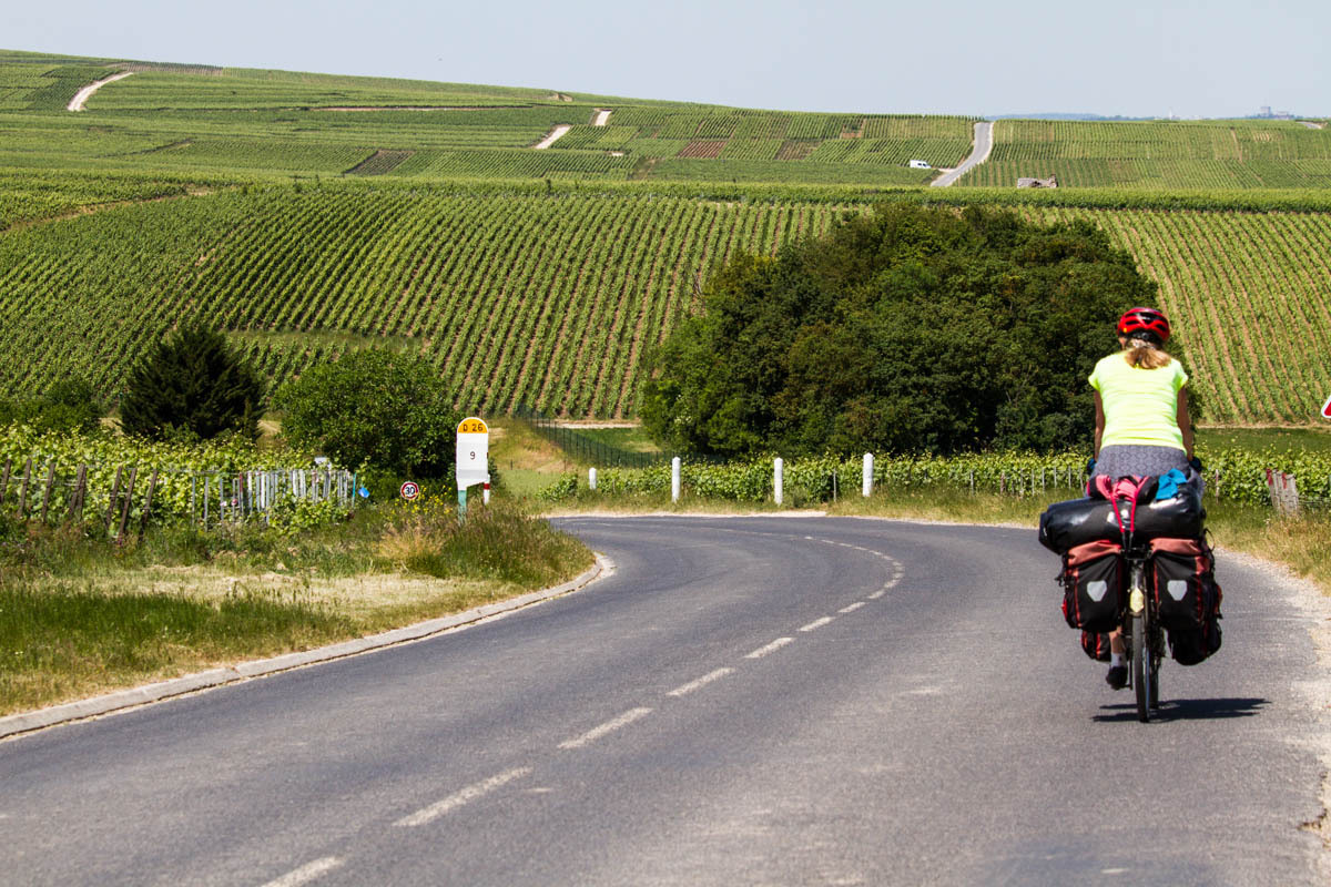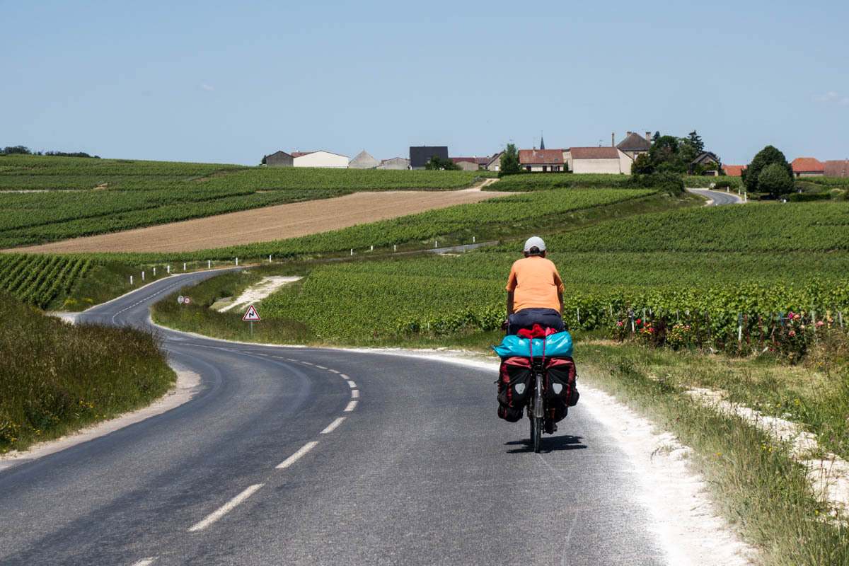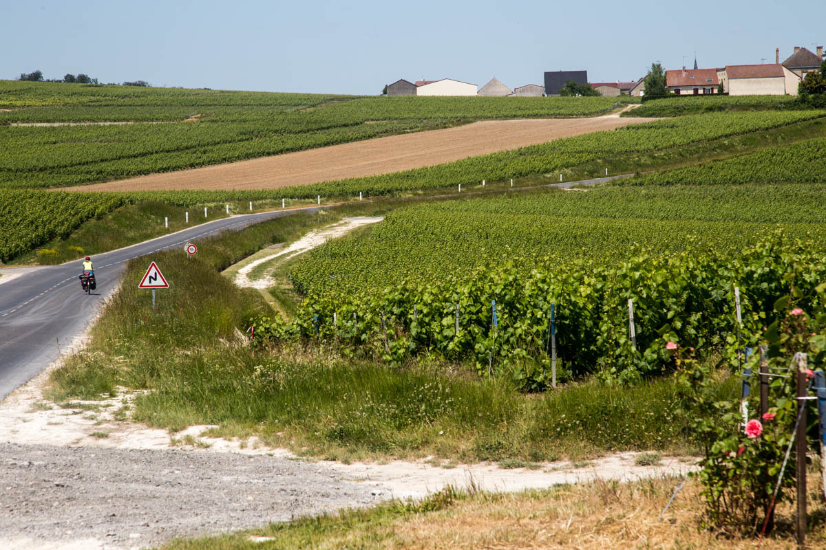 We have entered the Champagne region of France, which means they can call their bubbly white wine Champagne. After leaving Chalon, “Where are all the vineyards,” Rachel asks, then we leave the trail, and all of a sudden they are everywhere. The wind and sun are also there though; we struggle up medium hills in a strong headwind and a hot sun. We wonder about the roses we see planted at the end of the rows of vines.