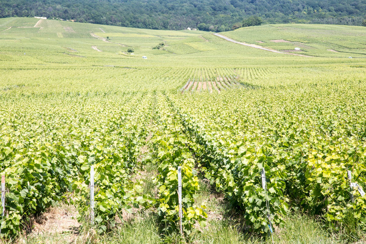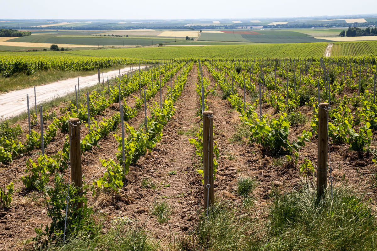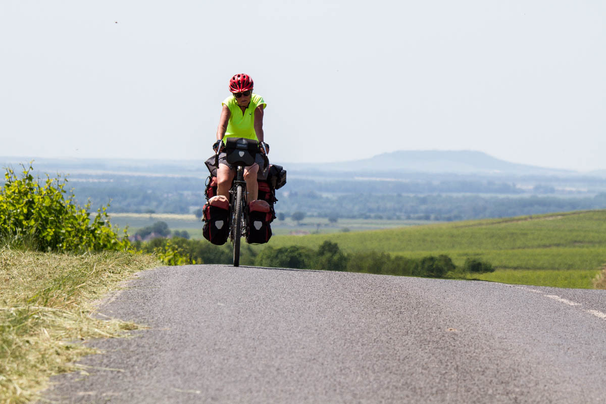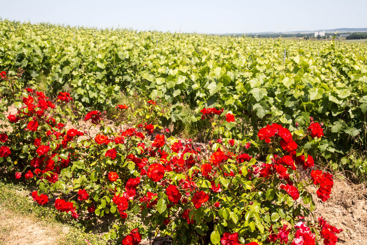 We have entered the Champagne region of France, which means they can call their bubbly white wine Champagne. After leaving Chalon, “Where are all the vineyards,” Rachel asks, then we leave the trail, and all of a sudden they are everywhere. The wind and sun are also there though; we struggle up medium hills in a strong headwind and a hot sun. We wonder about the roses we see planted at the end of the rows of vines.