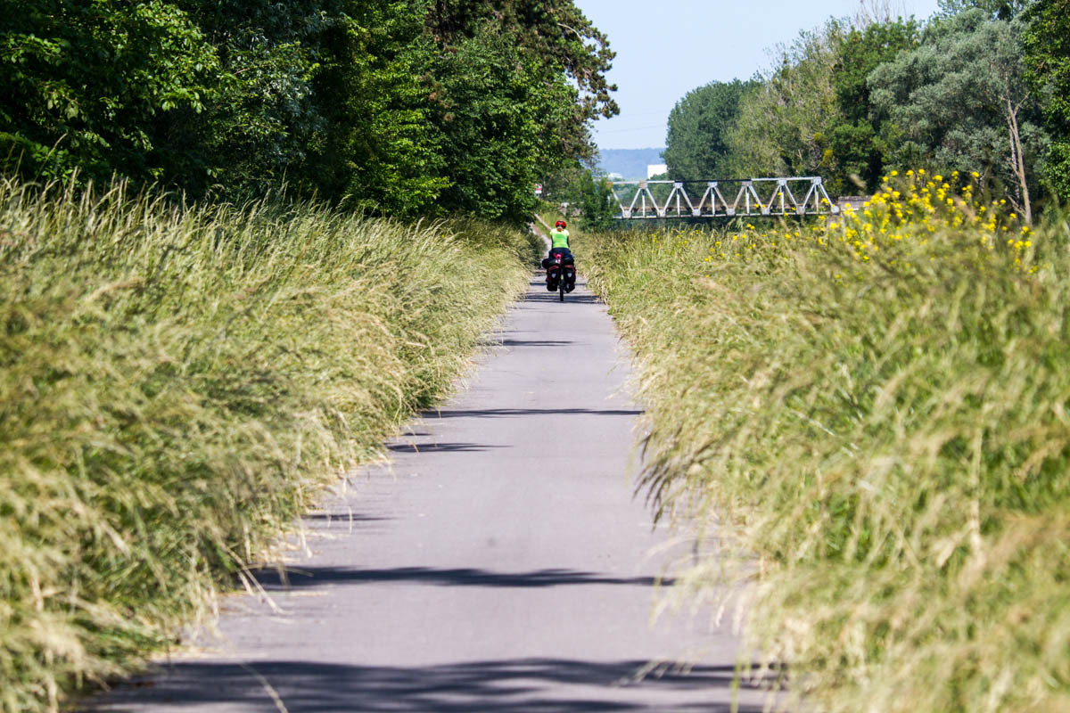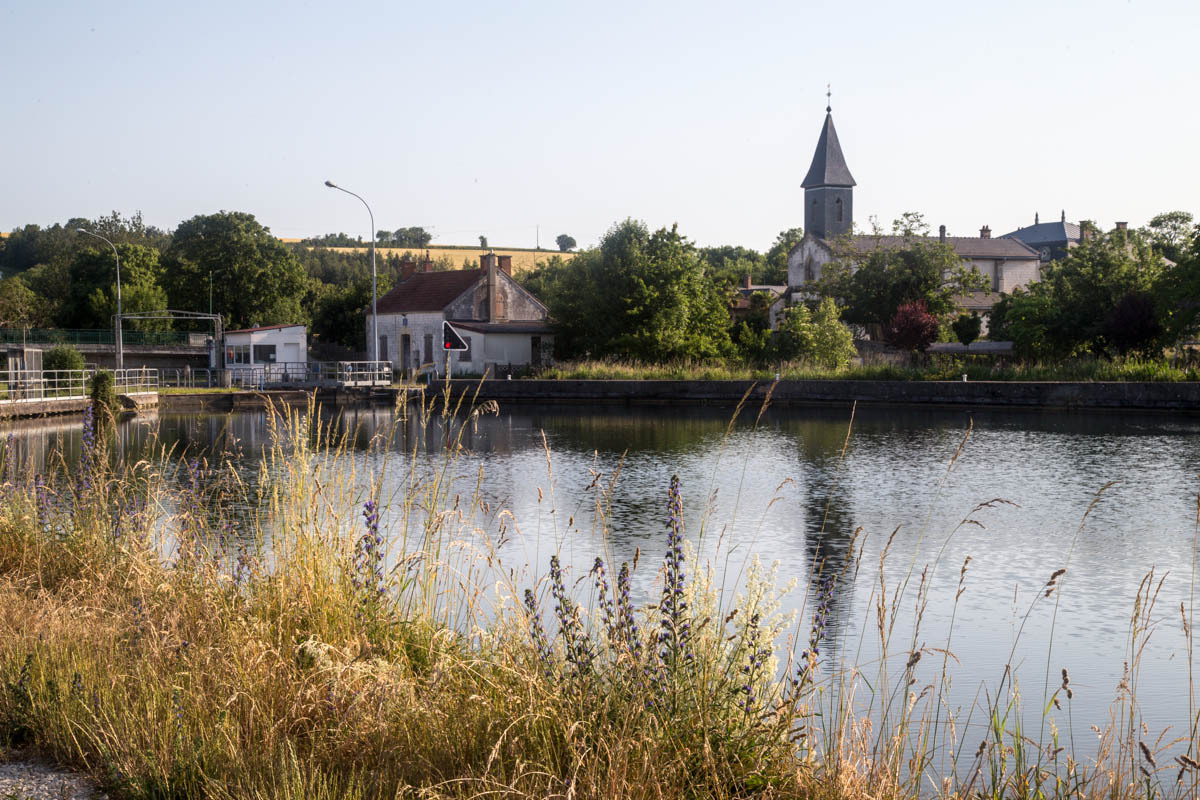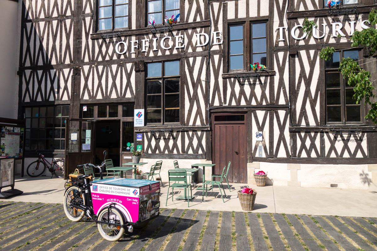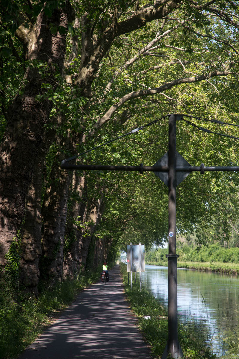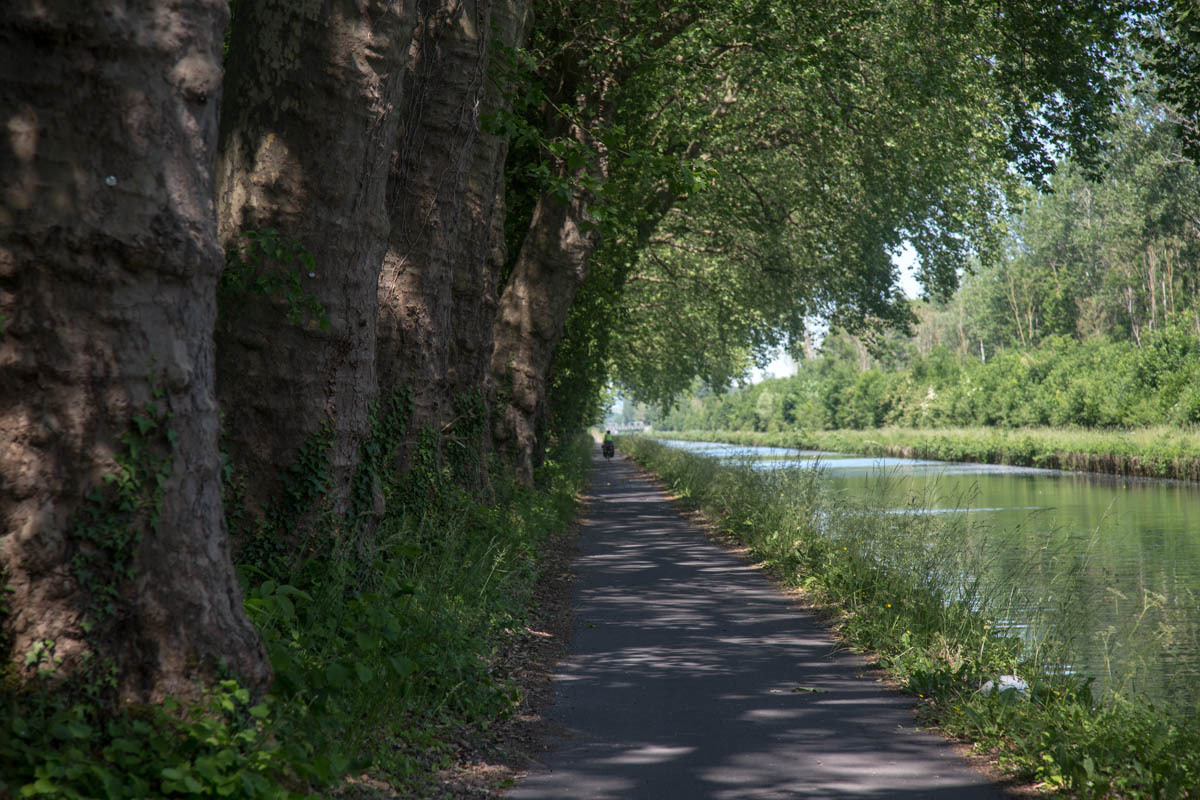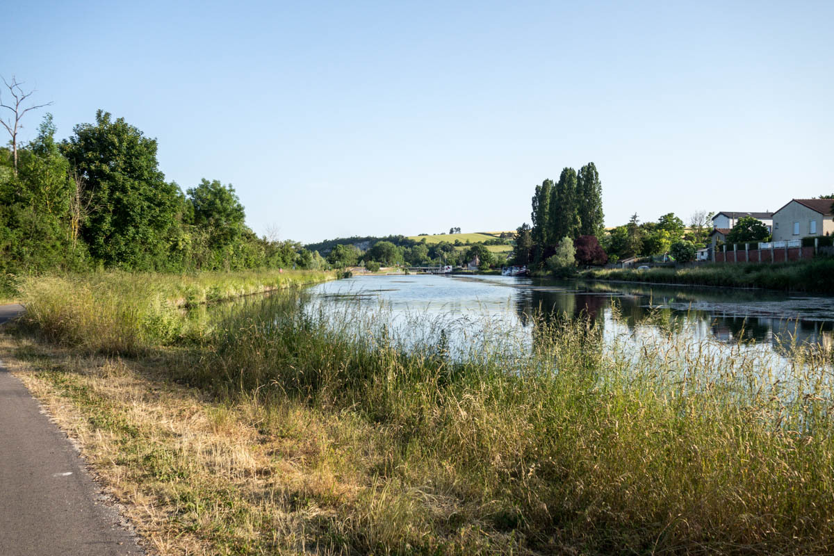 From the farm campground we ride the 500 meters back to the canal and pick up the biketrail again. We enjoyed this trail! The trail takes us right into Chalons, a fairly large city. We ride into the downtown area to find a helpful tourist office, a bakery and coffee and free Wi-Fi. With the Wi-Fi, we received a response from our host in Verzy so now we know the exact address. After some pasty and coffee we head back to the canal and follow along.