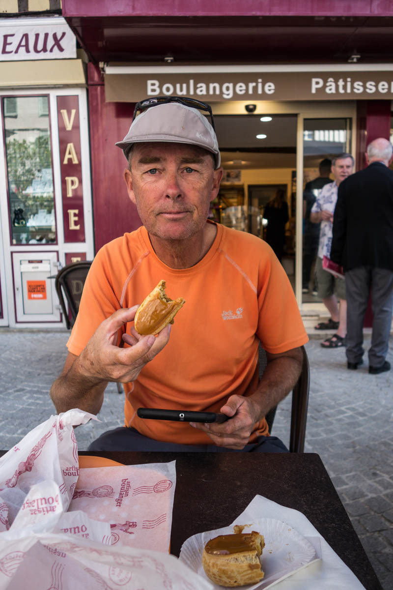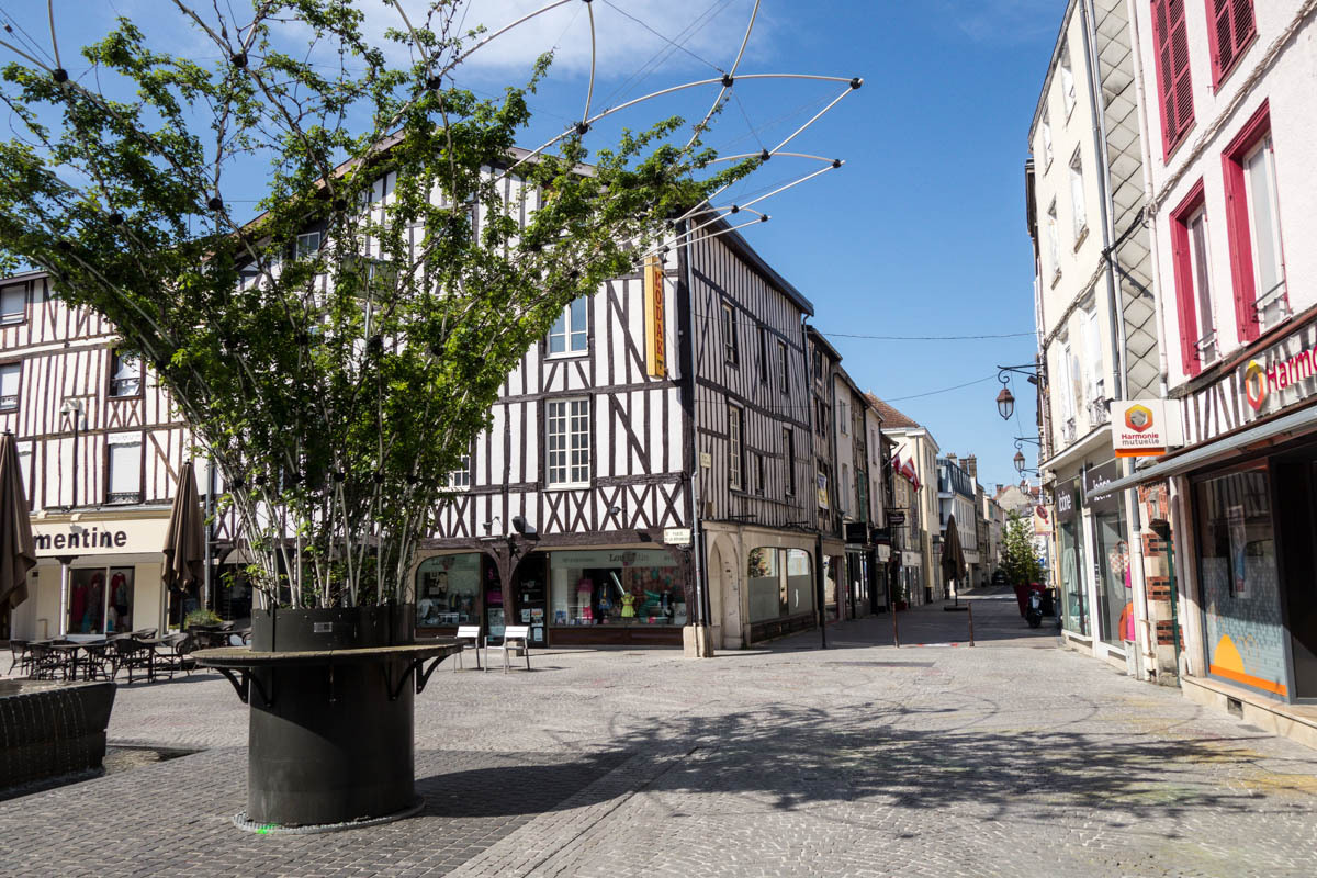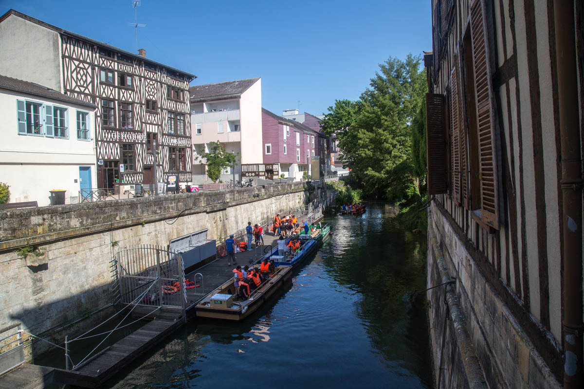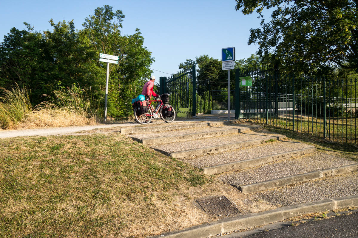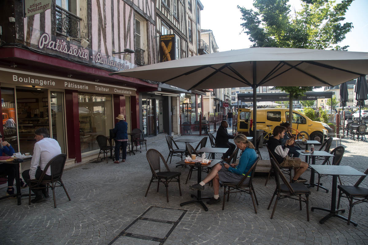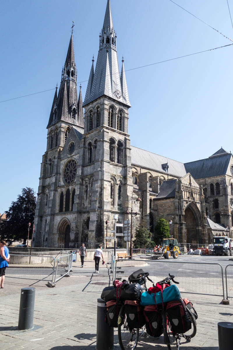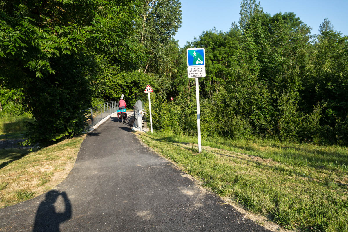 From the farm campground we ride the 500 meters back to the canal and pick up the biketrail again. We enjoyed this trail! The trail takes us right into Chalons, a fairly large city. We ride into the downtown area to find a helpful tourist office, a bakery and coffee and free Wi-Fi. With the Wi-Fi, we received a response from our host in Verzy so now we know the exact address. After some pasty and coffee we head back to the canal and follow along.