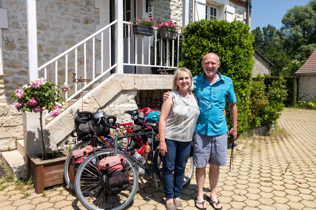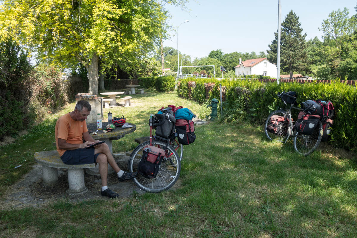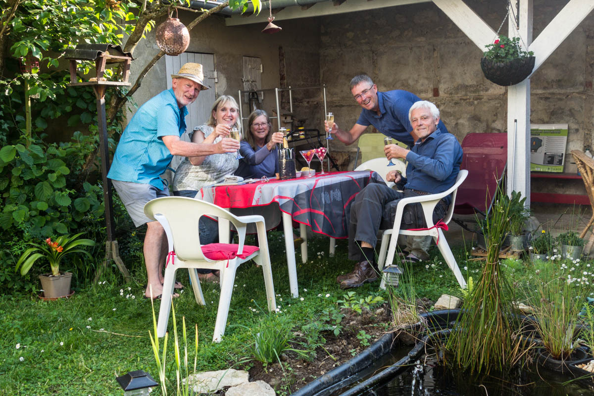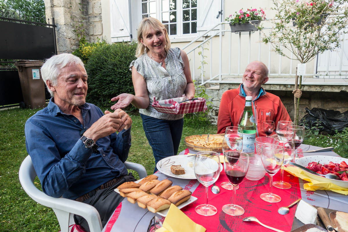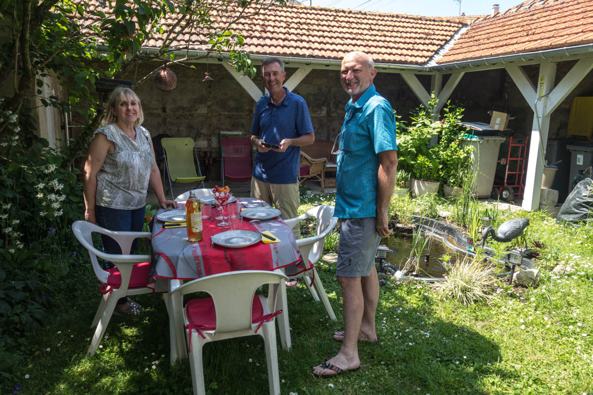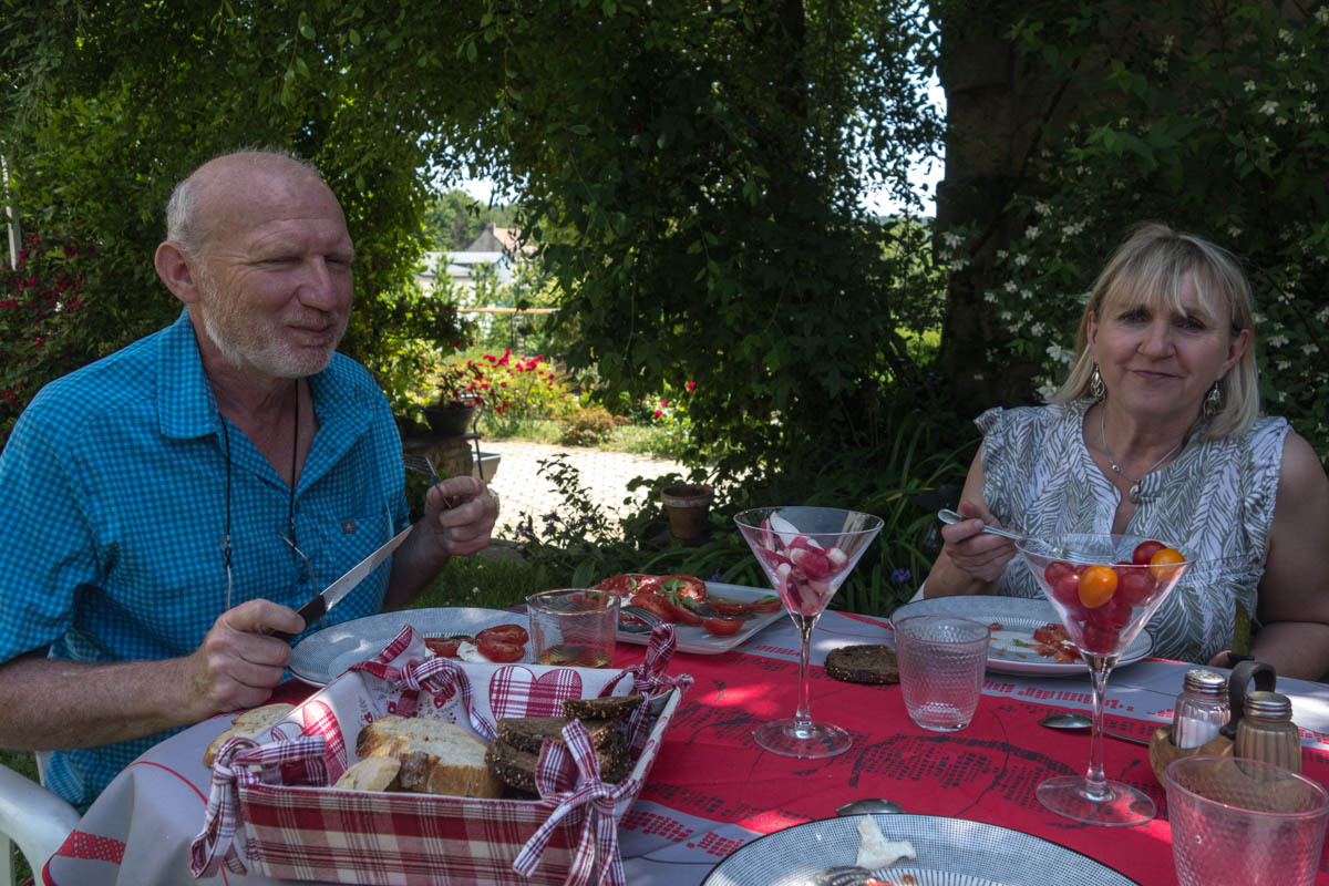 It is all worth it though; we end up with some of the best Warmshowers hosts we have come across. Philippe and his wife retired to this small village with 82 people. They have a nice house and a beautiful garden. We had said we’d arrive early, until the hills slowed us down, and they must have been waiting with lunch. After our arrival and cleanup, Philippe BBQ’s up some nice sausage and chicken, Marie-Eve has fixed a nice potato dish and salad.