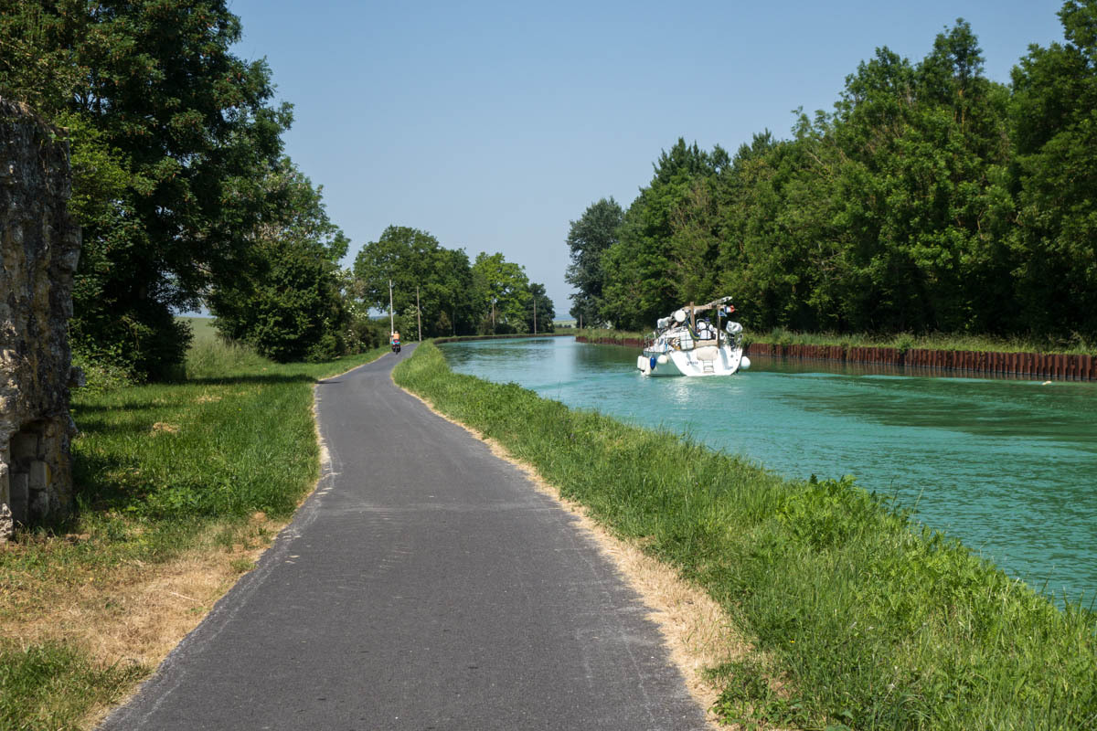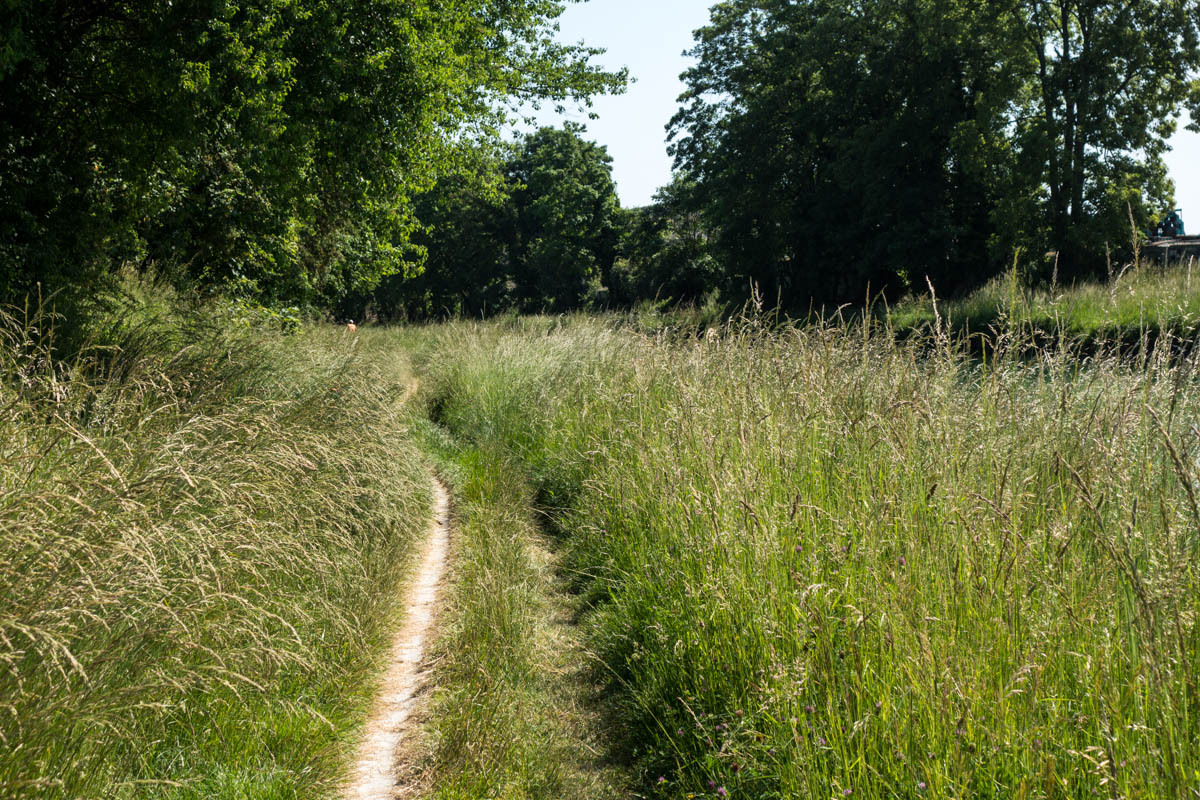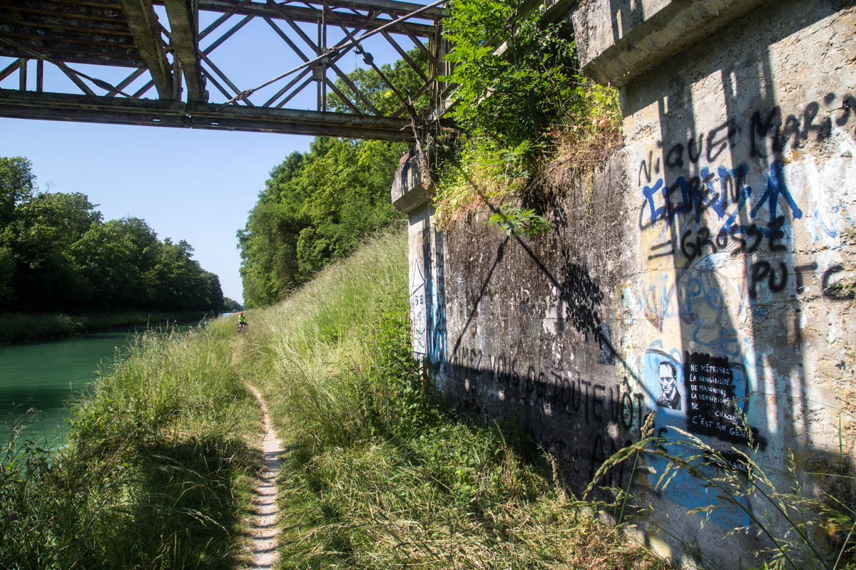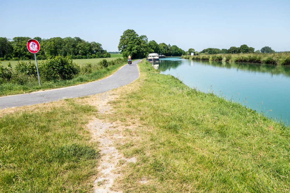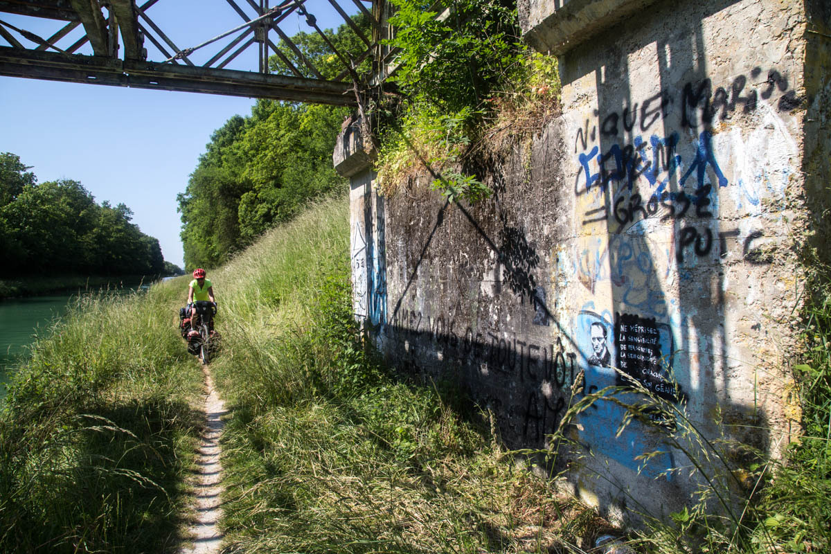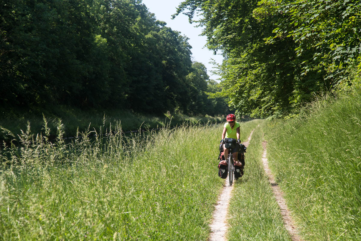 An elevator takes us back on the trail along the canal. Our canal ends though at a T junction at Berry de Lac, from there we go cross-country. Nico had warned us about this section of about 3km of single track in the tall grass. That means hills in these parts.
