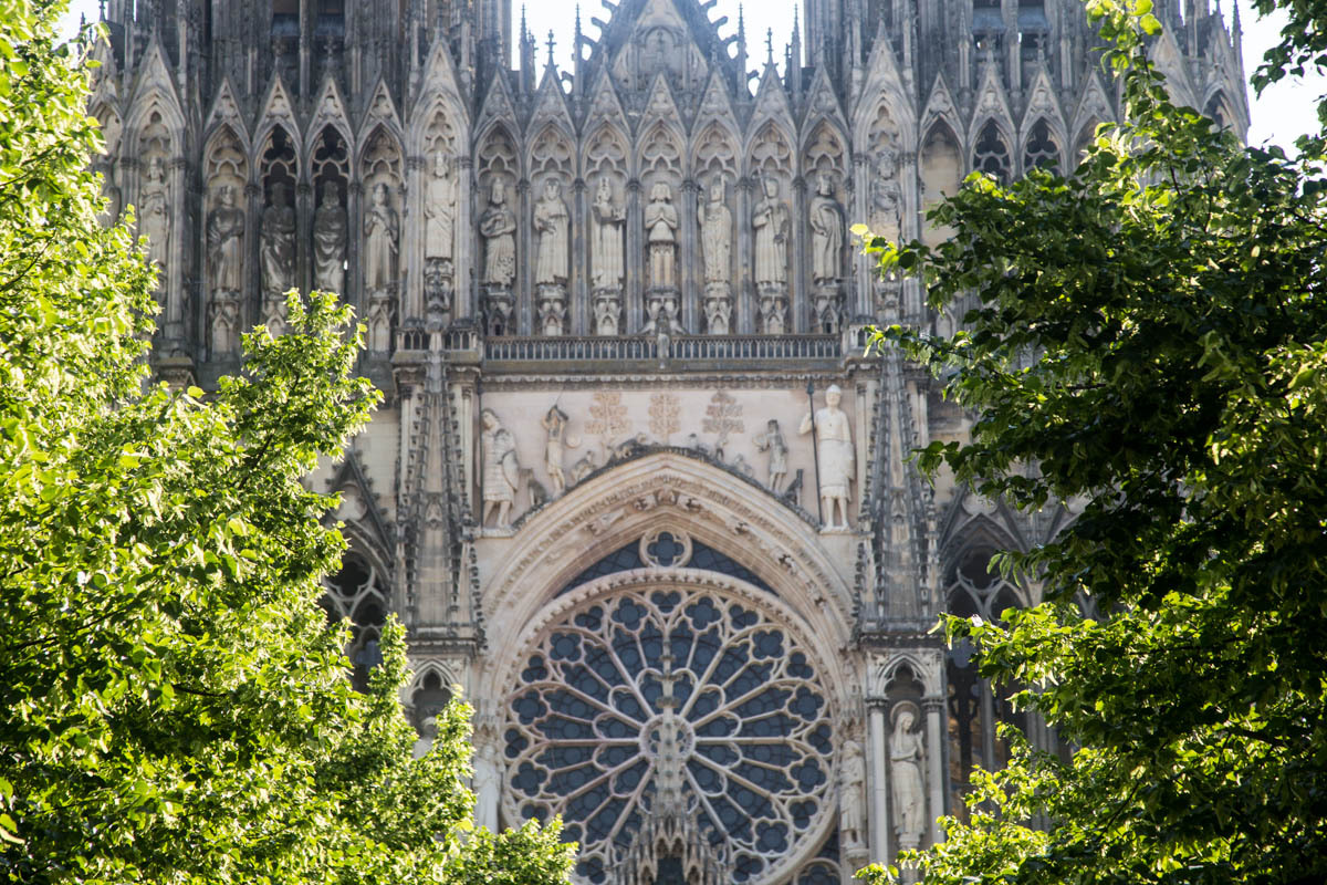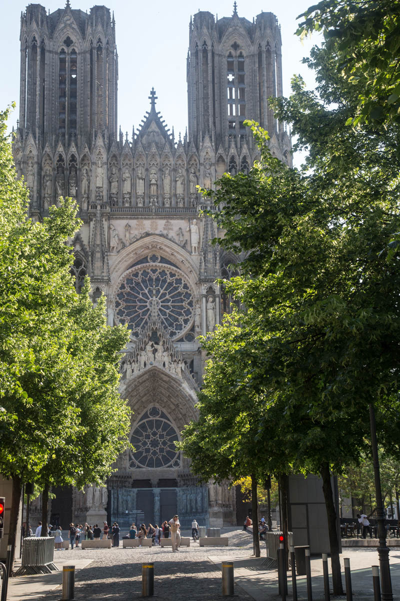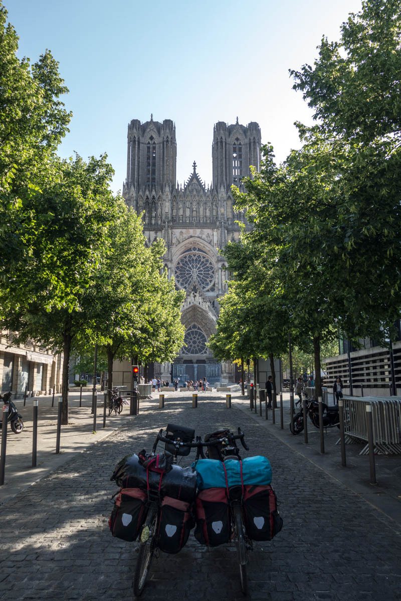 We head into town to see the Cathedral. At first sight it looks a bit “unfinished” because the twin steeples were not fully constructed. Cathedrals were built on pretty shaky foundations and often construction had to be altered or stopped because the tall heavy parts started to settle or sag. Not sure why, but these towers end kinda “stumpy”. The history of the “Reims Cathedral is where the kings of France were crowned. The cathedral hosted thirty-three sovereign coronations in just over 1000 years! The cathedral also hosted the baptism of Clovis around the year 498, and so kingdom of the Franks was born. This made Reims the chosen city to crown kings.” We take turns walking around the church and watching the bikes, then find a bakery for some very expensive coffee.