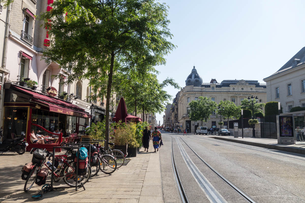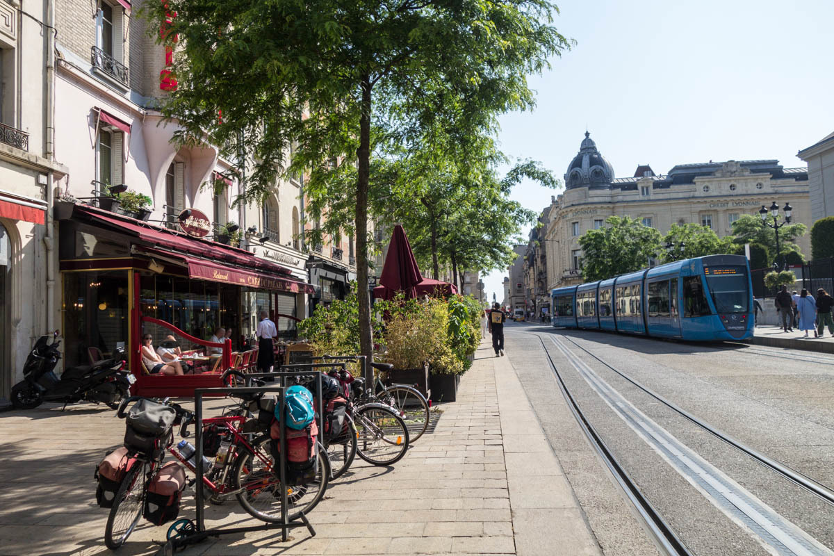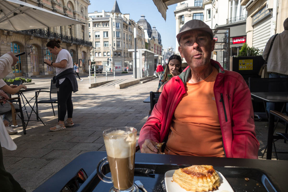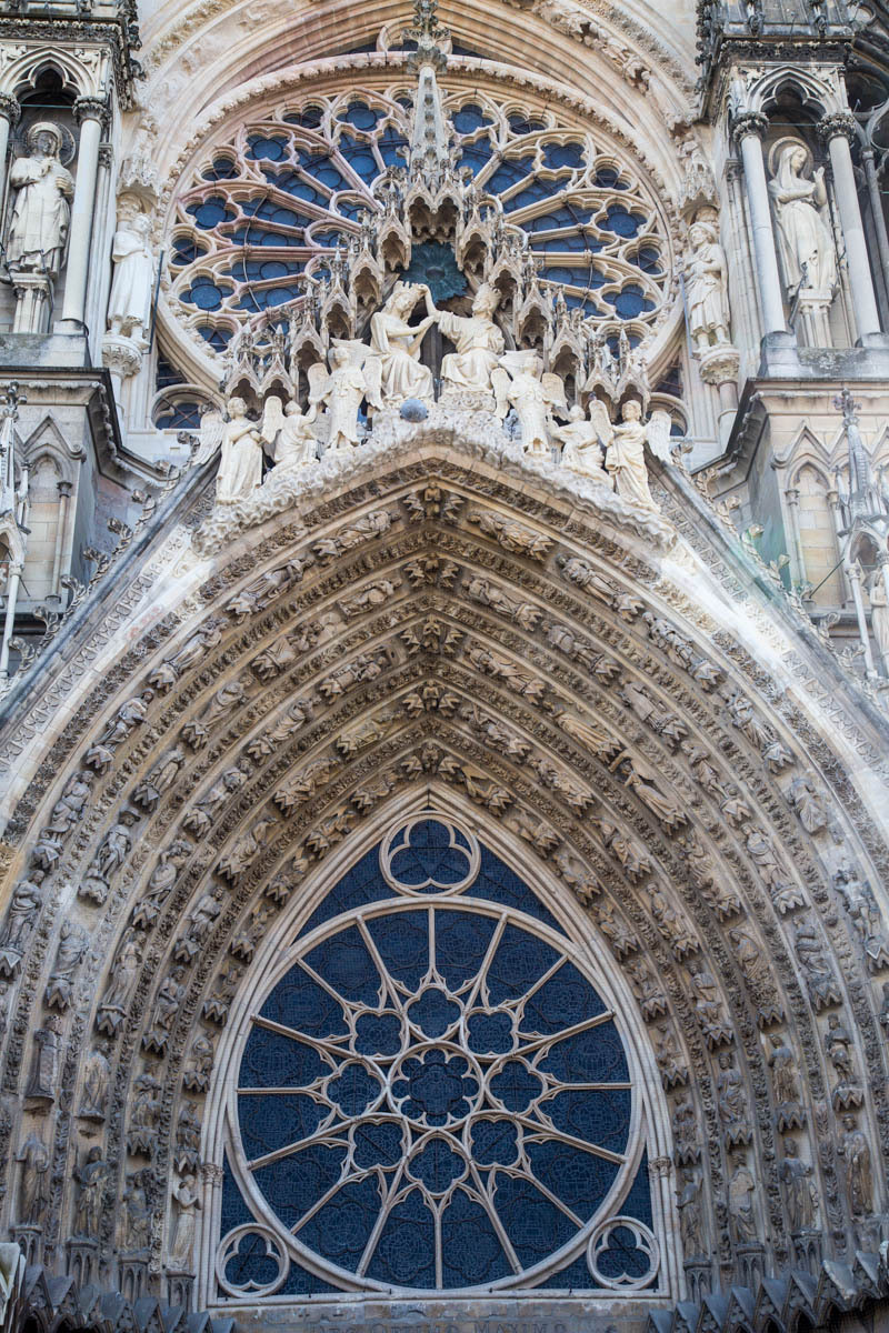 We head into town to see the Cathedral. At first sight it looks a bit “unfinished” because the twin steeples were not fully constructed. Cathedrals were built on pretty shaky foundations and often construction had to be altered or stopped because the tall heavy parts started to settle or sag. Not sure why, but these towers end kinda “stumpy”. The history of the “Reims Cathedral is where the kings of France were crowned. The cathedral hosted thirty-three sovereign coronations in just over 1000 years! The cathedral also hosted the baptism of Clovis around the year 498, and so kingdom of the Franks was born. This made Reims the chosen city to crown kings.” We take turns walking around the church and watching the bikes, then find a bakery for some very expensive coffee.