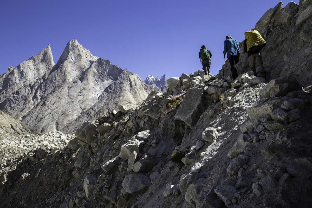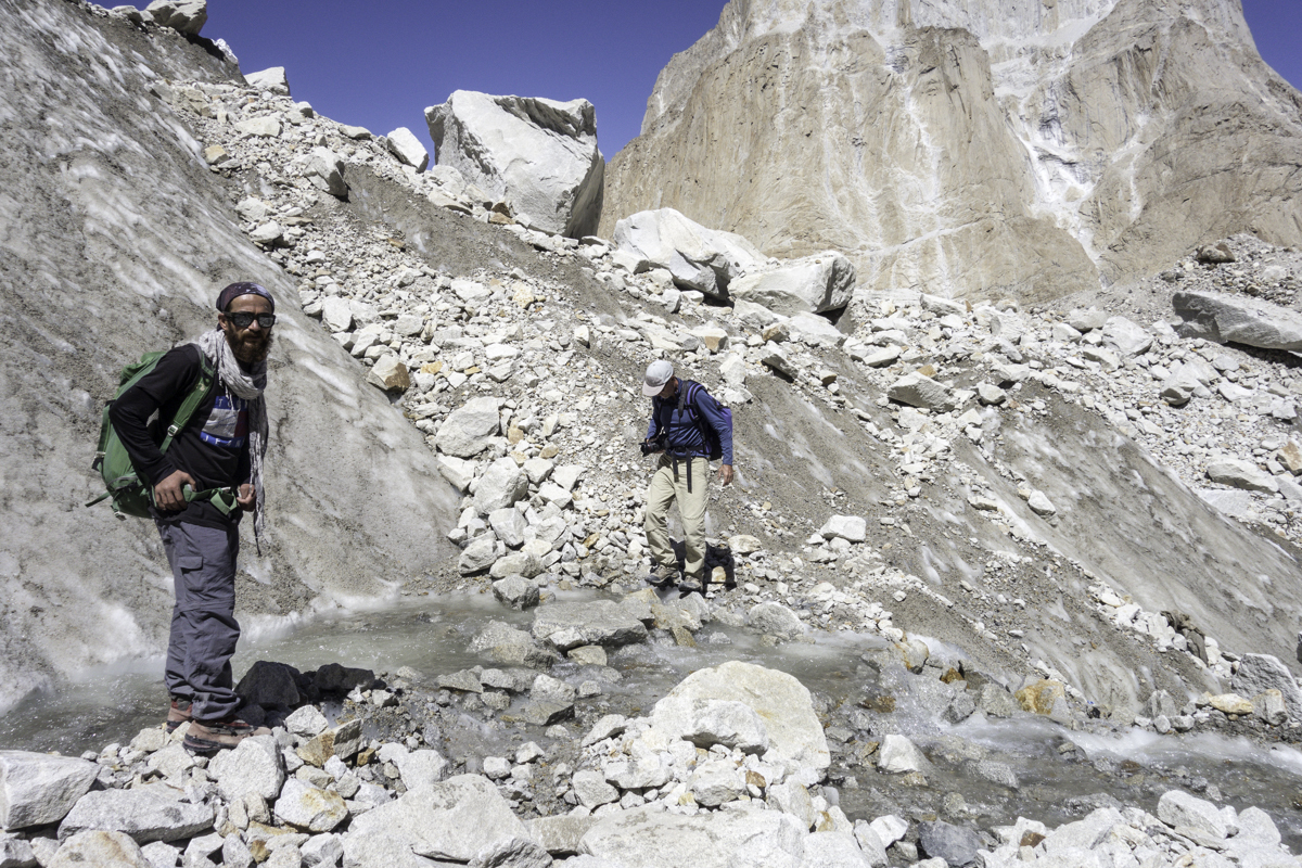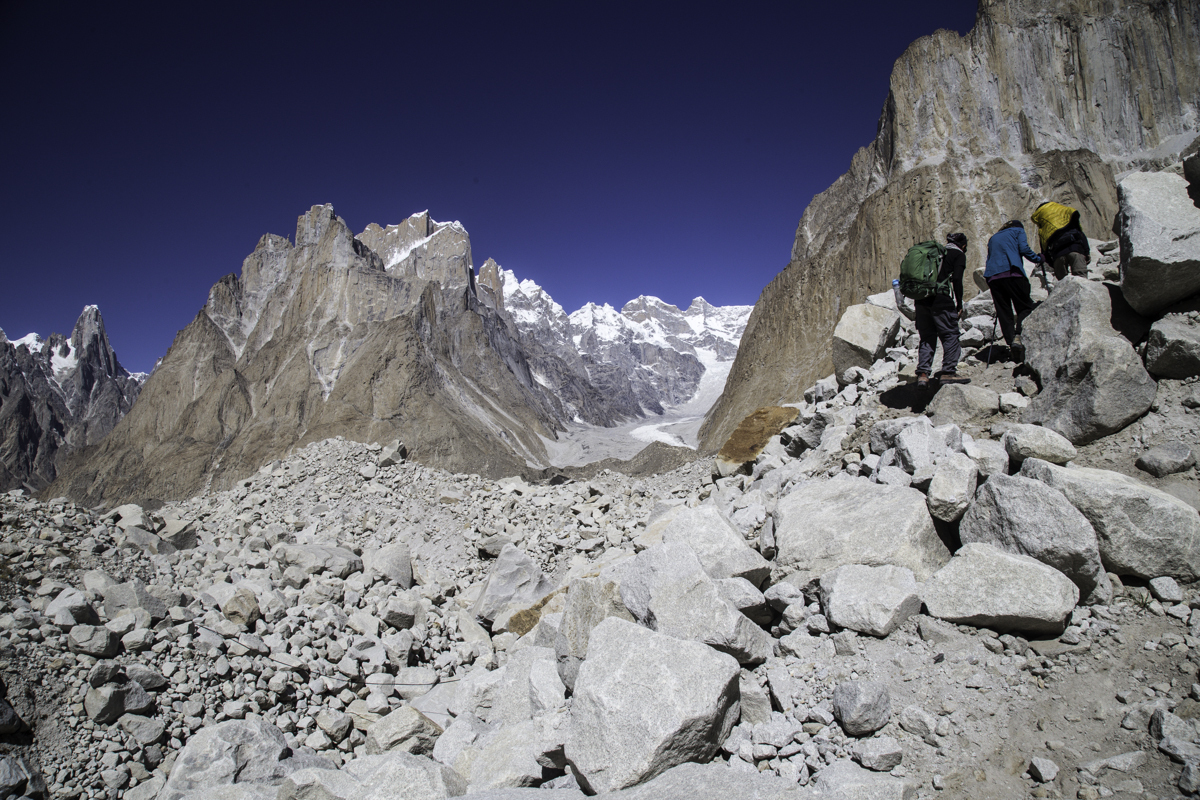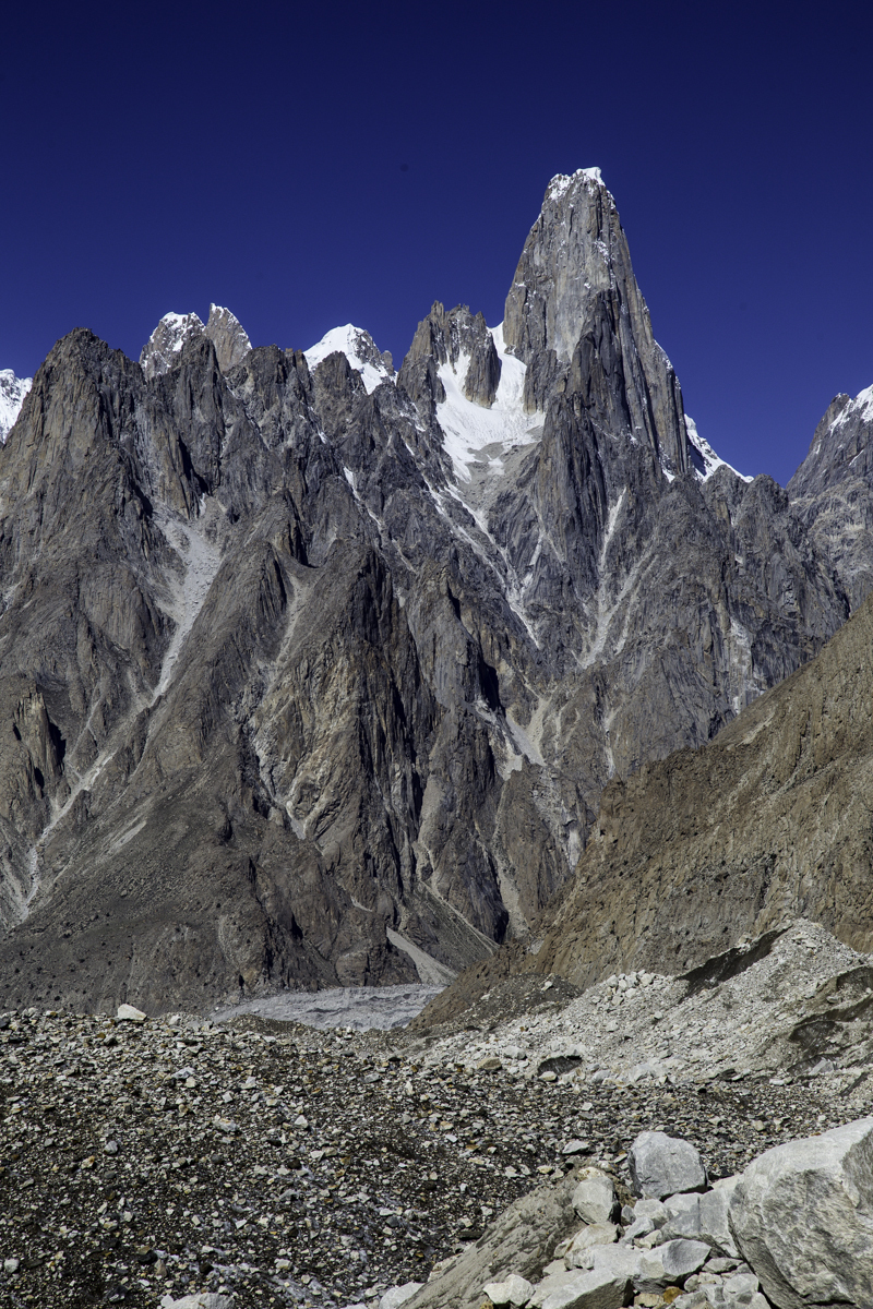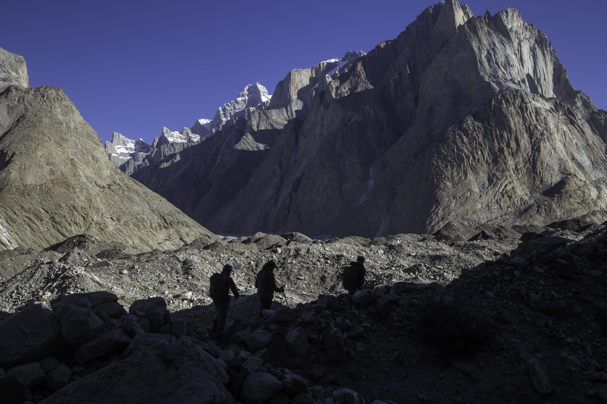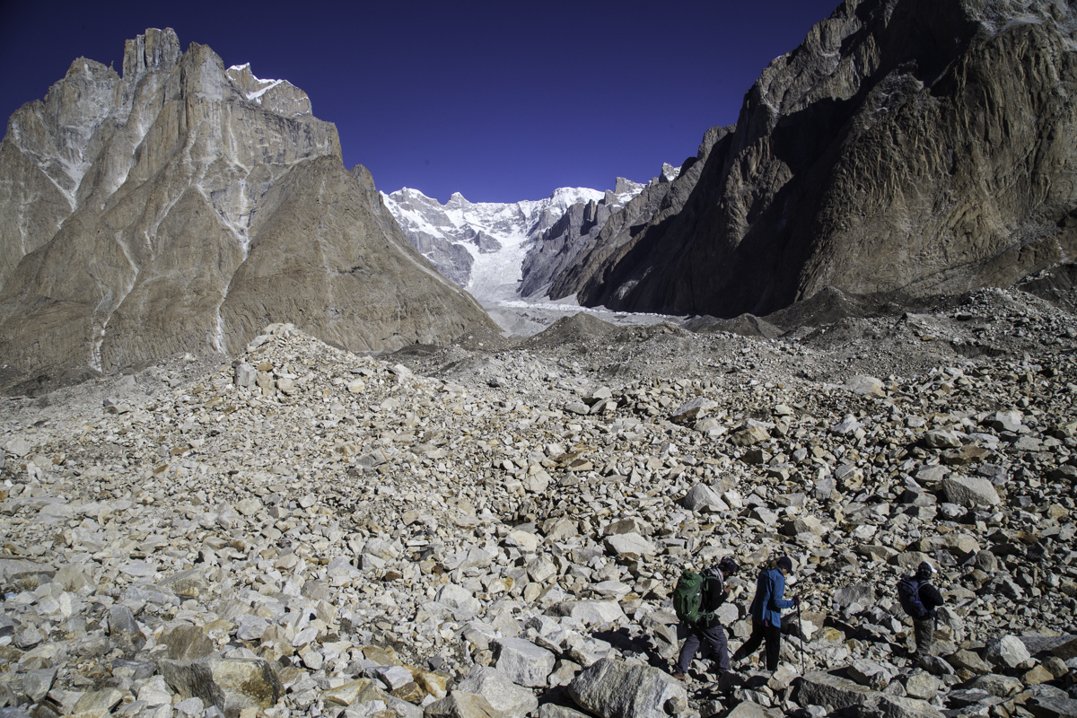 Today is the shortest day of the trek over the rocky moraines and ablation valley of Baltoro. Crossing a couple of icy side glaciers we see Broad Peak and the Gasherbrum.