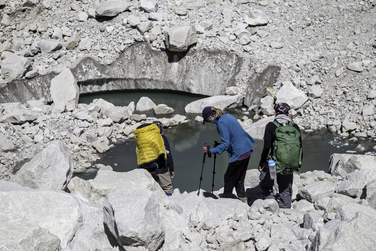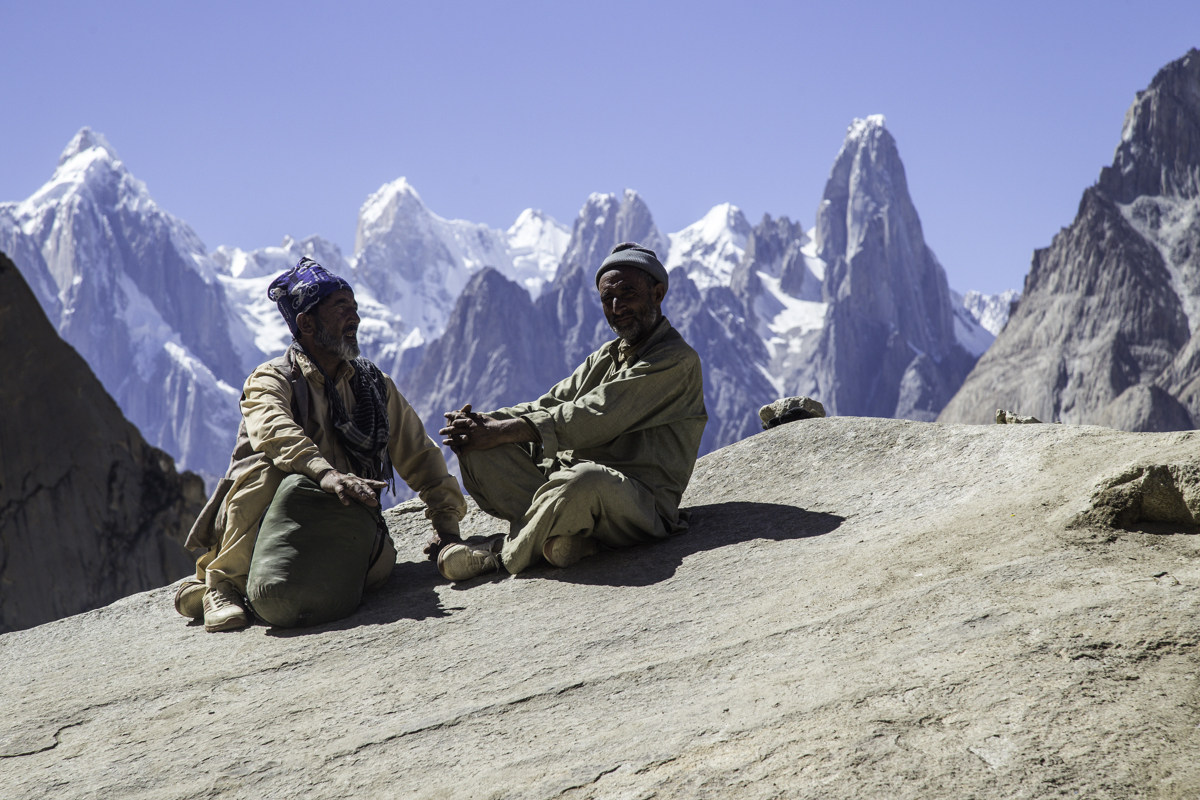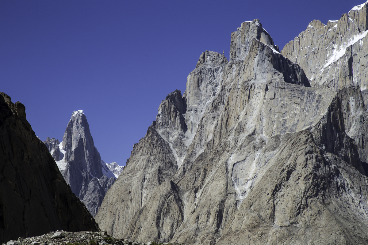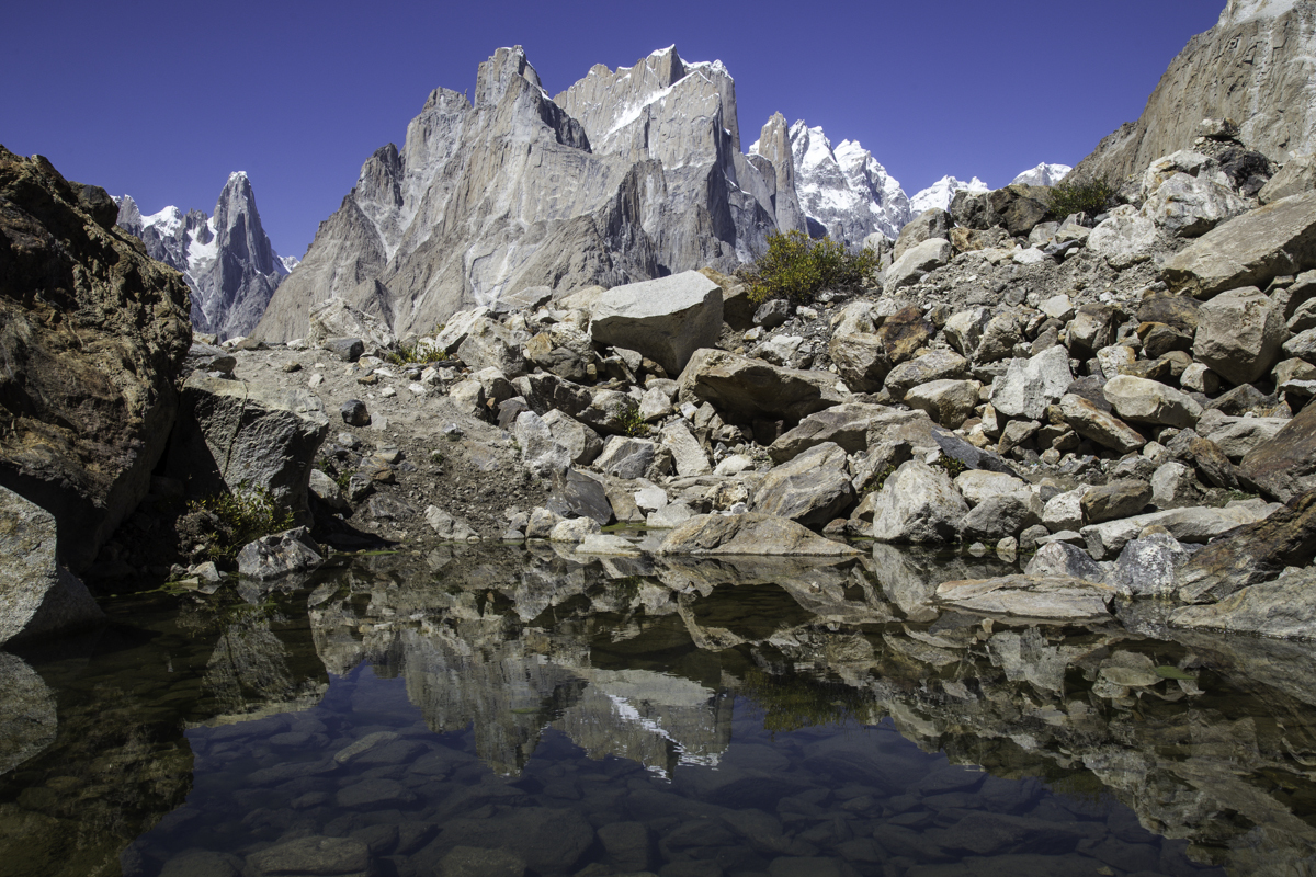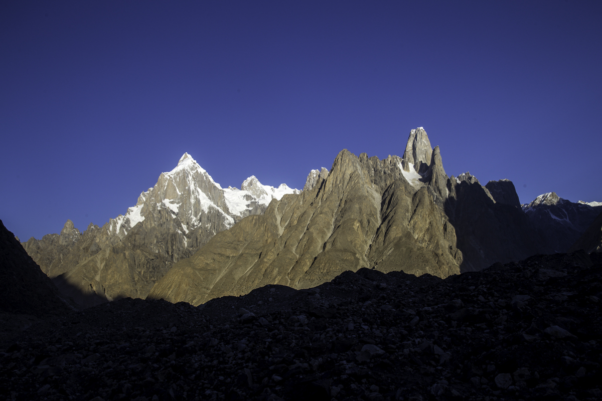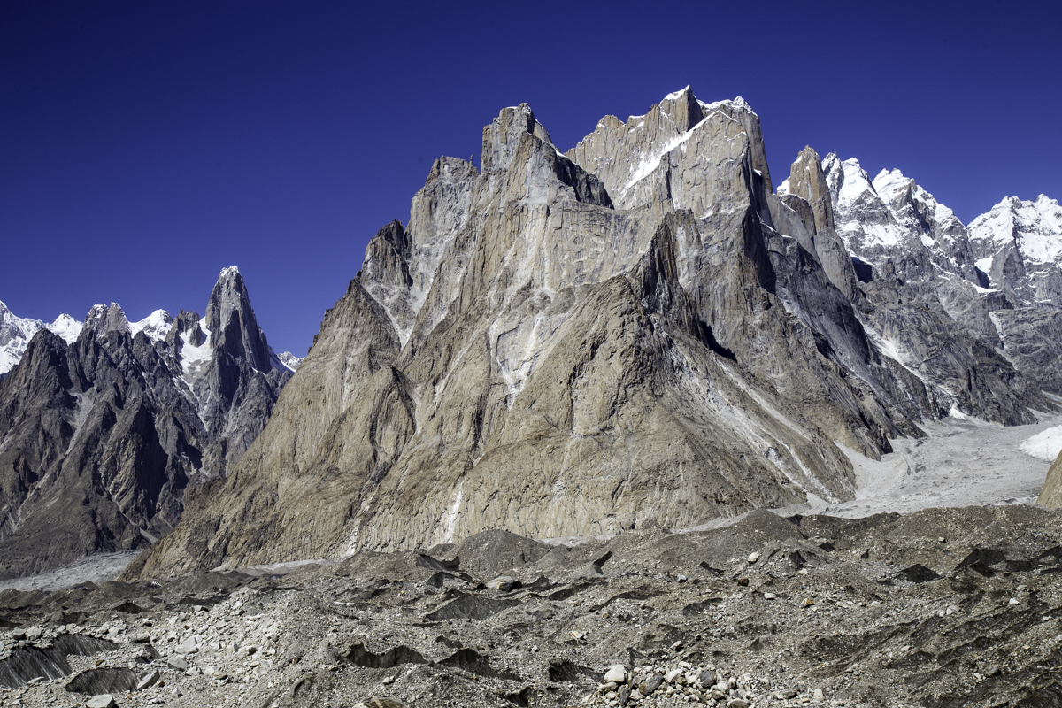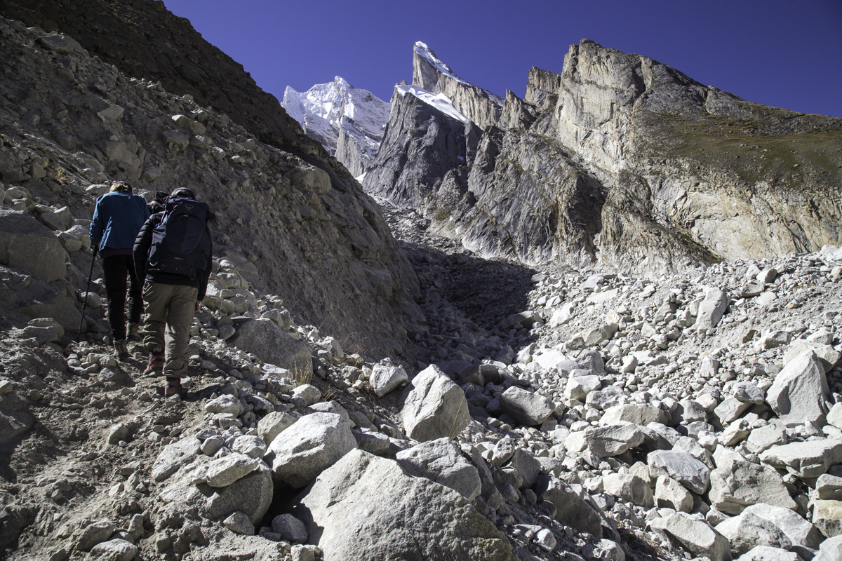 Today is the shortest day of the trek over the rocky moraines and ablation valley of Baltoro. Crossing a couple of icy side glaciers we see Broad Peak and the Gasherbrum.