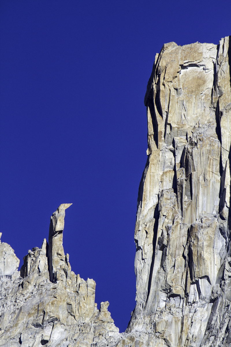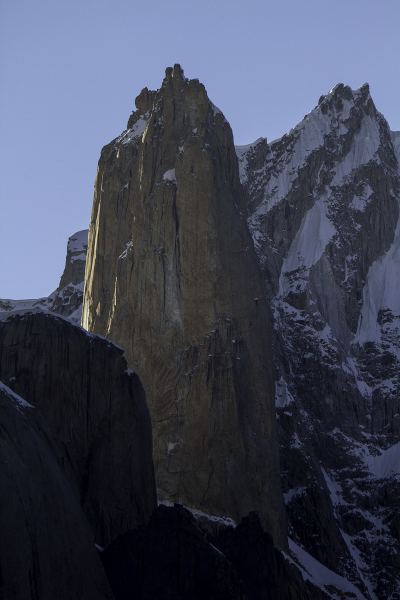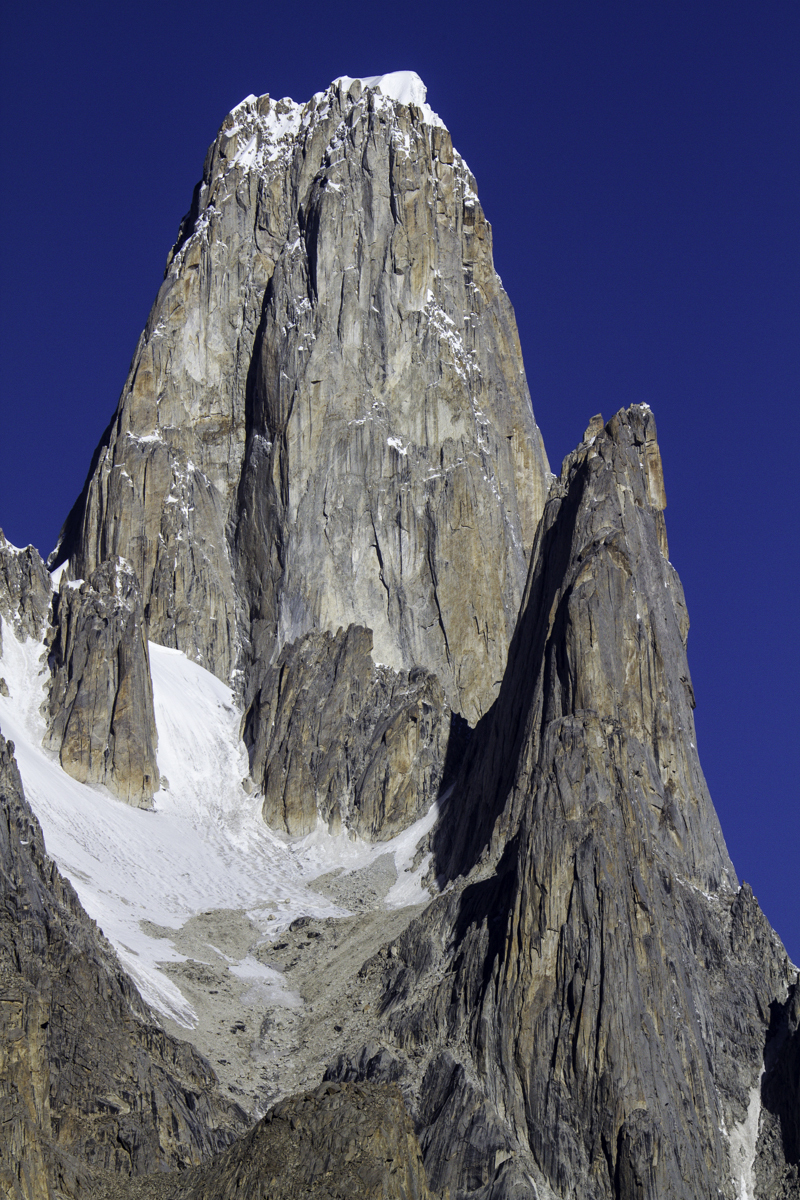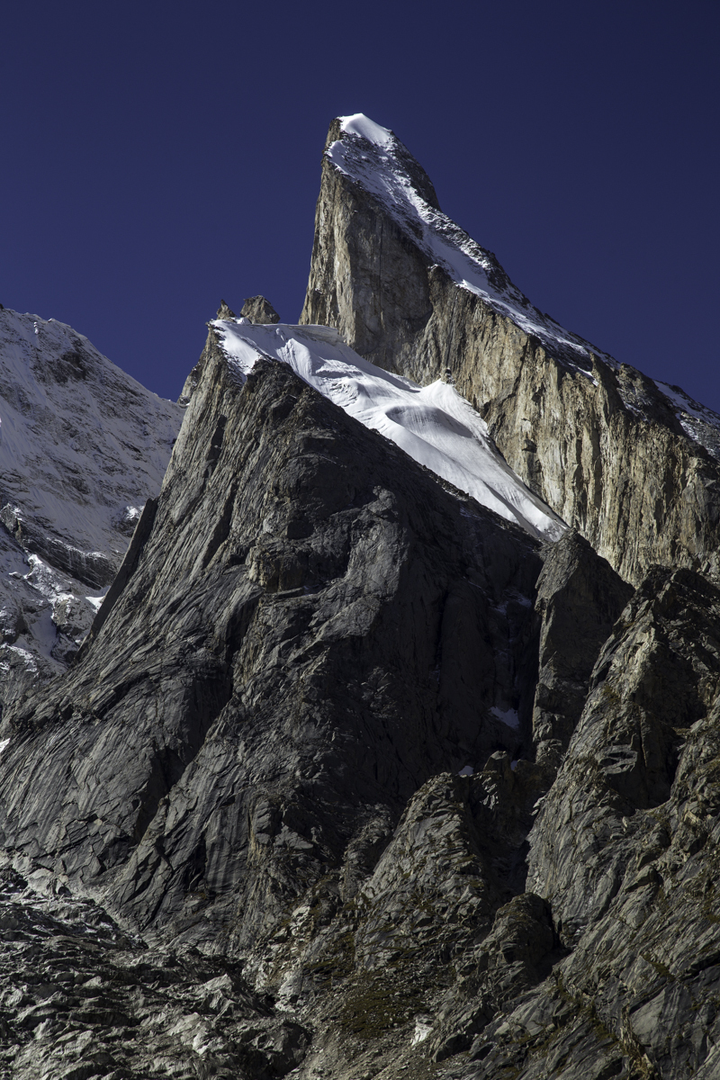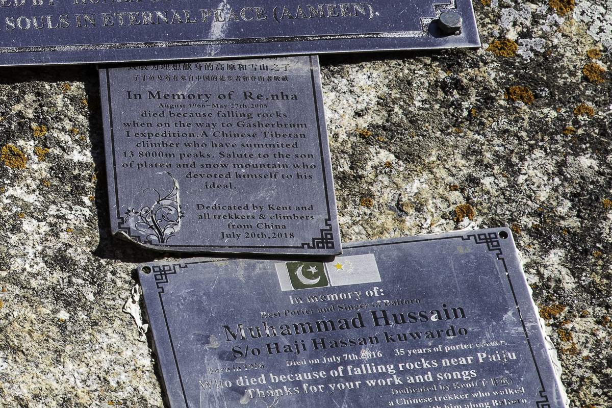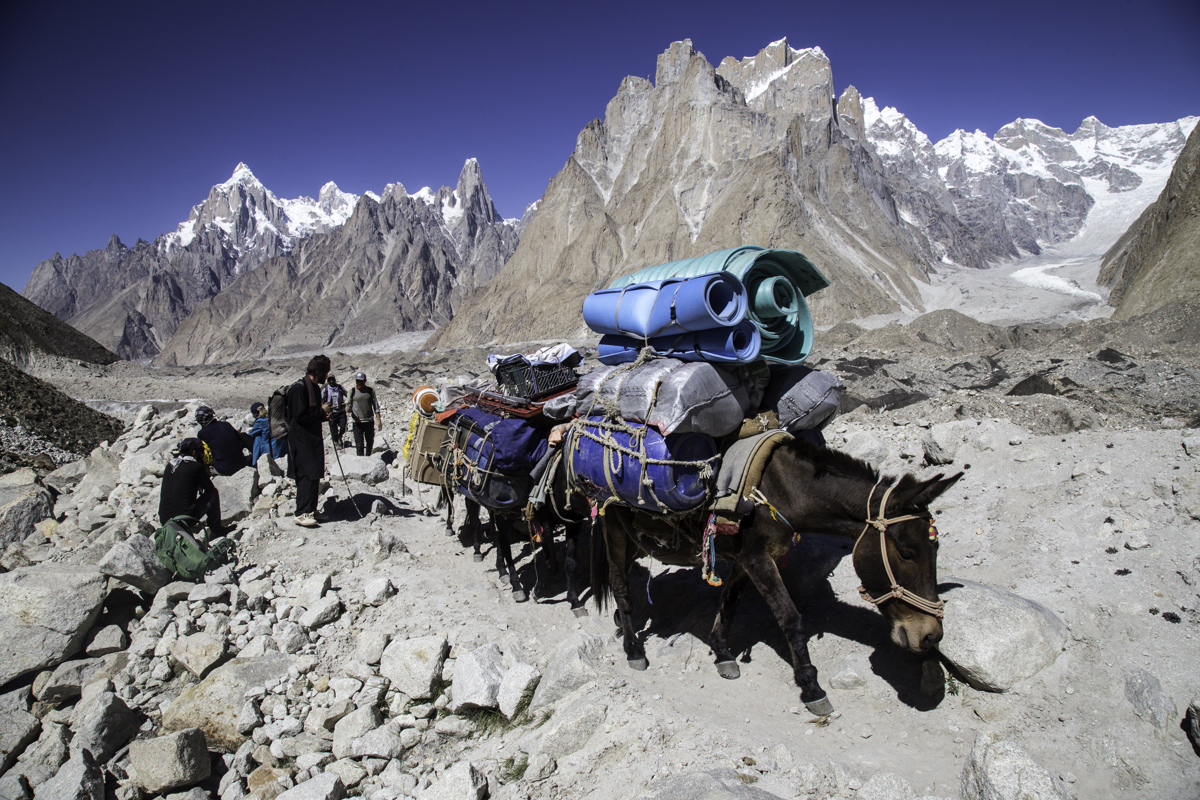 Today is the shortest day of the trek over the rocky moraines and ablation valley of Baltoro. Crossing a couple of icy side glaciers we see Broad Peak and the Gasherbrum.