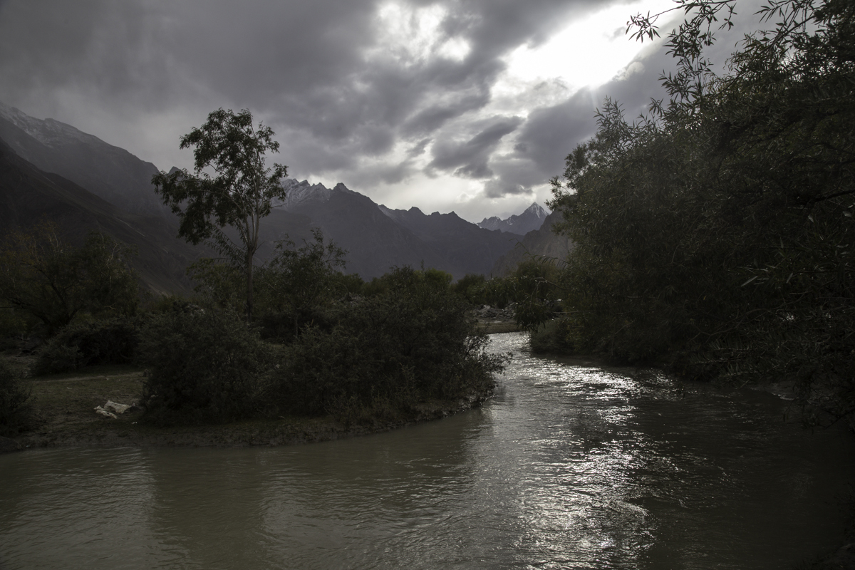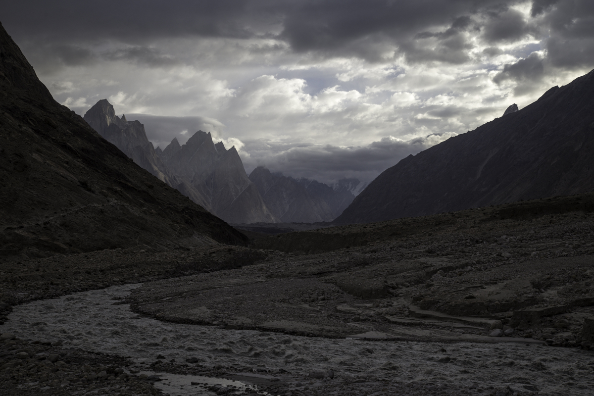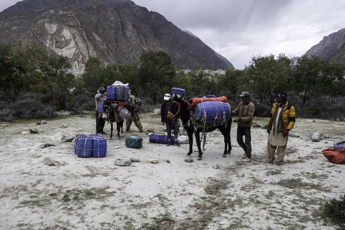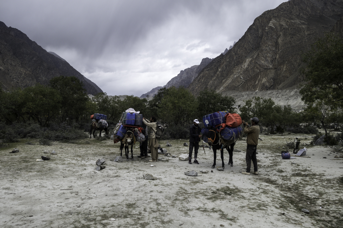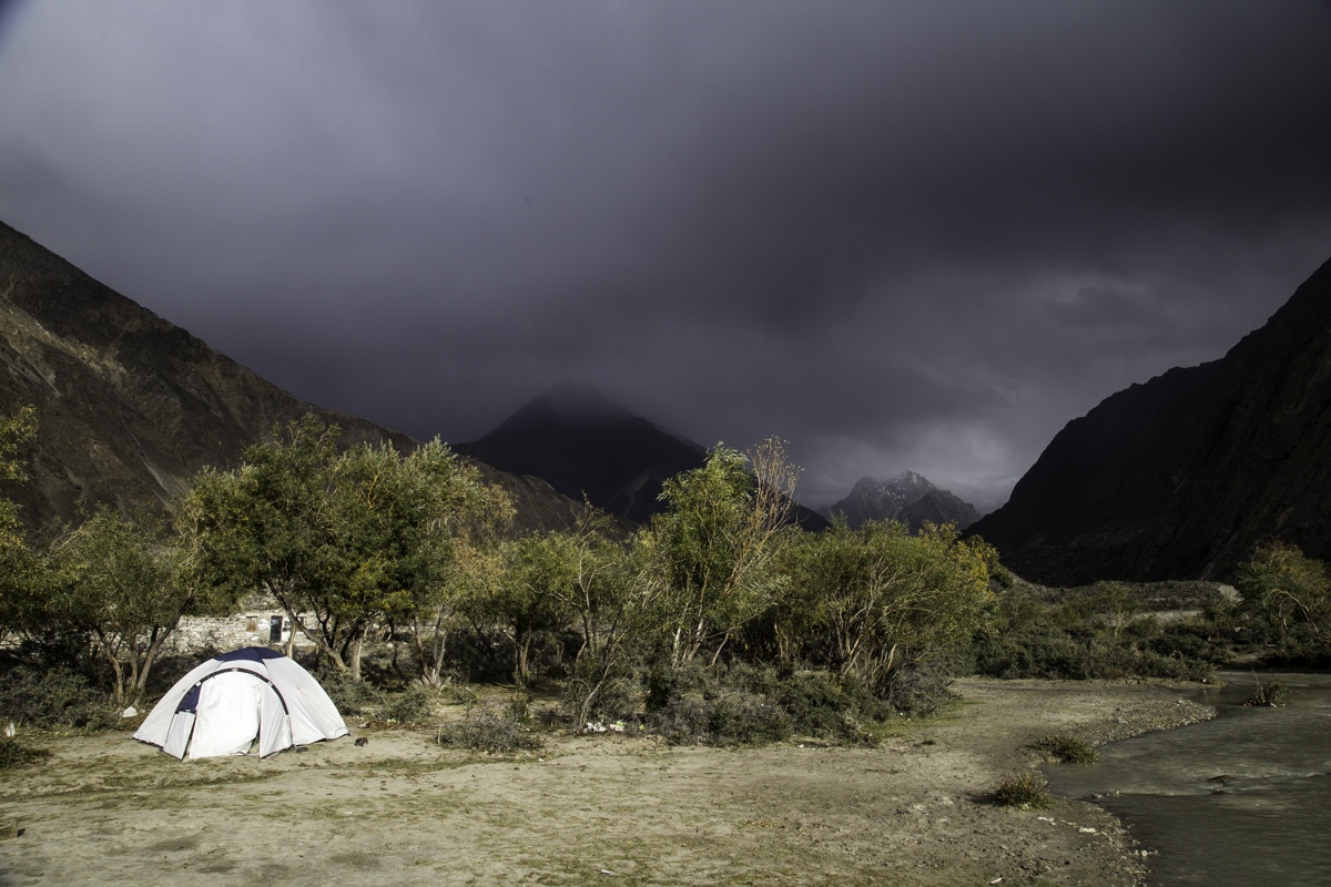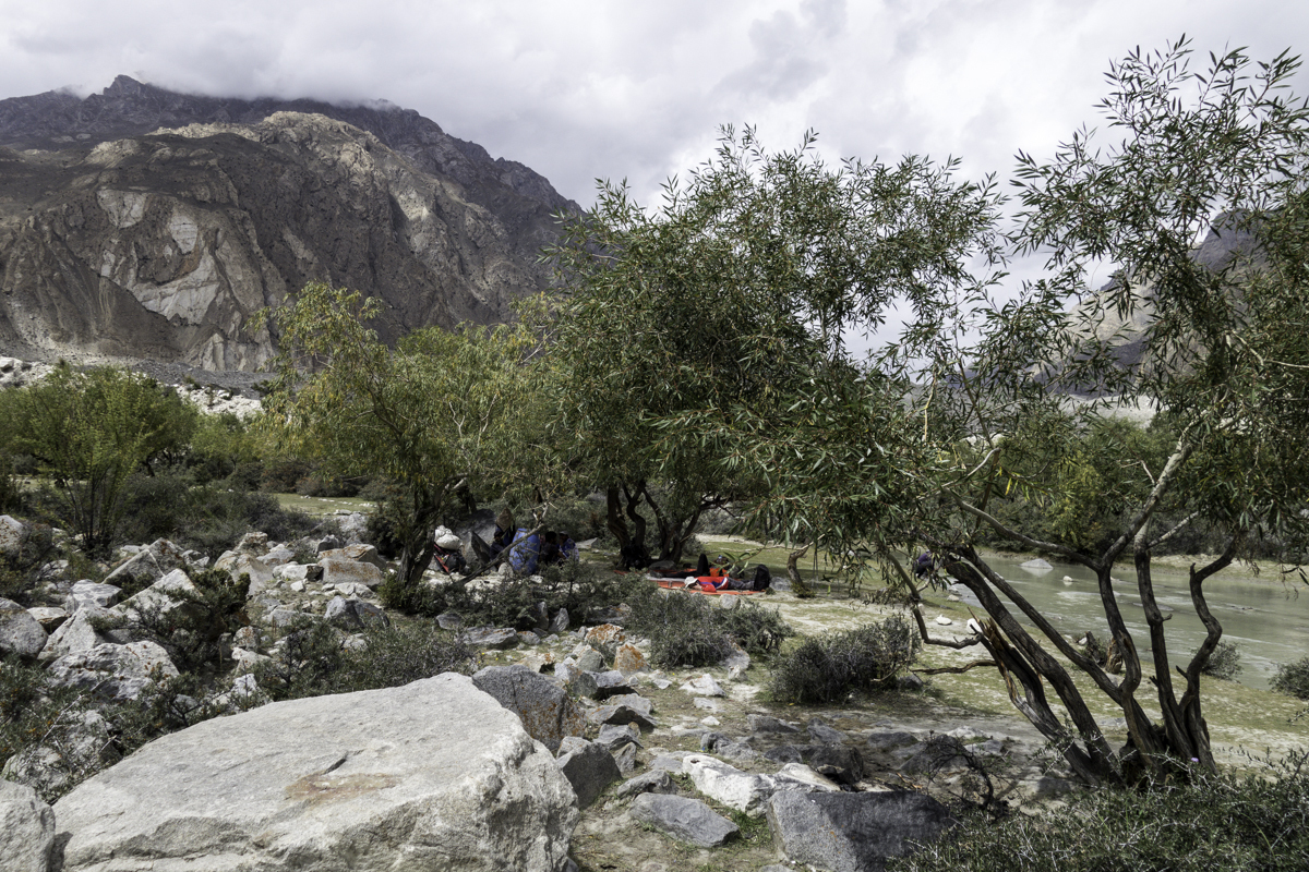 Storms are moving into the mountains. Our original destination today is the same camp at Jola along the river on our first day trekking up to Concordia.