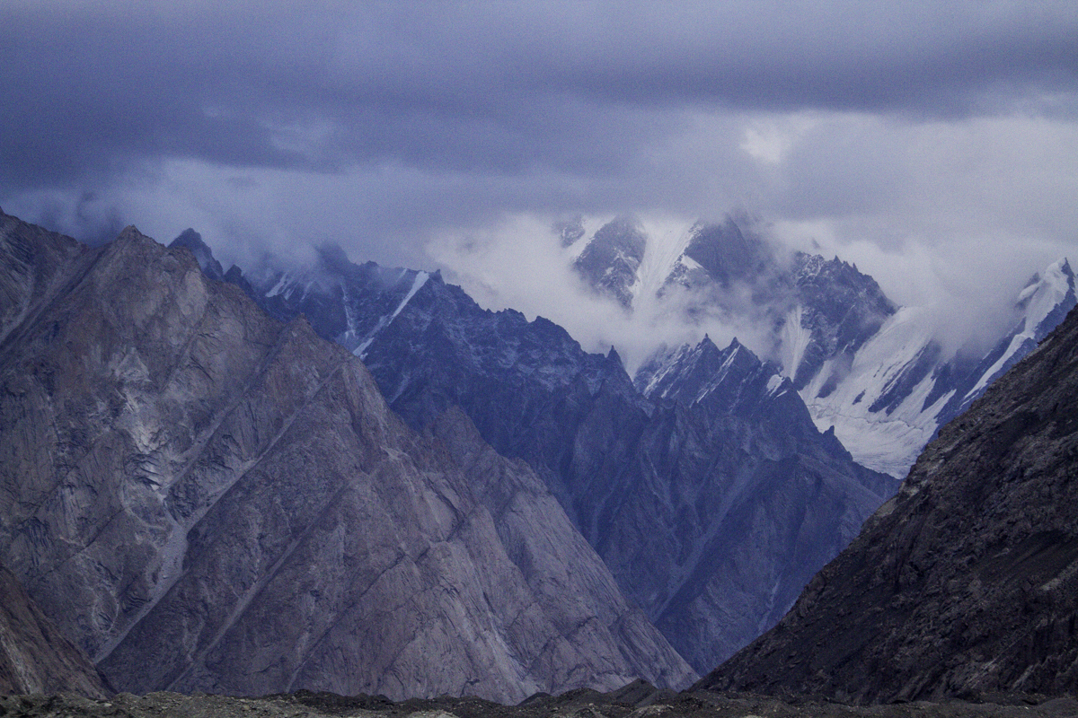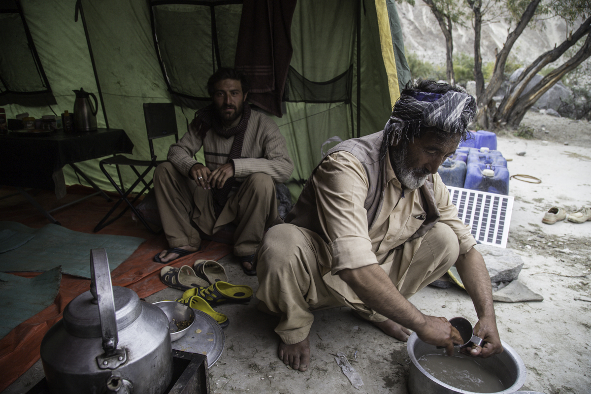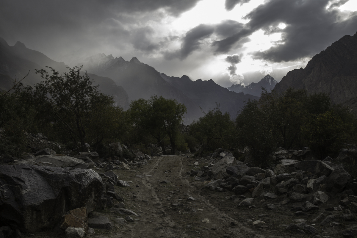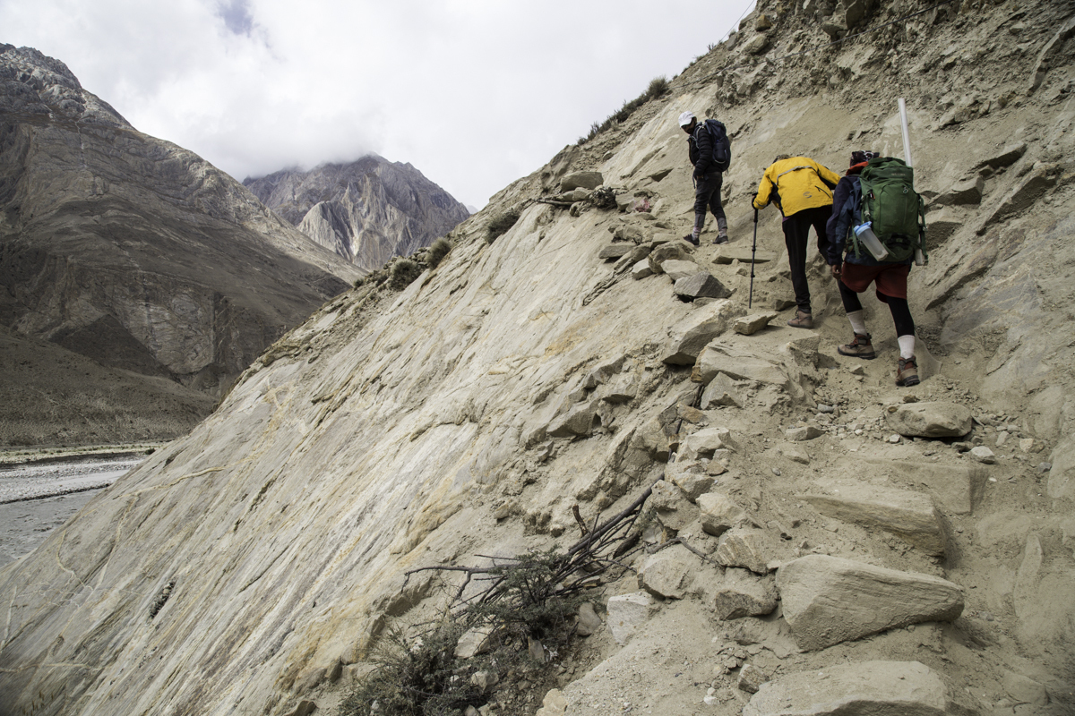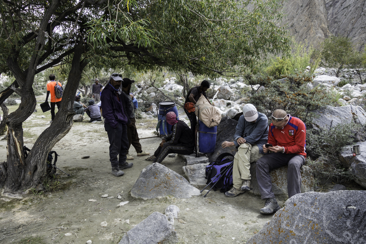 Storms are moving into the mountains. Our original destination today is the same camp at Jola along the river on our first day trekking up to Concordia.