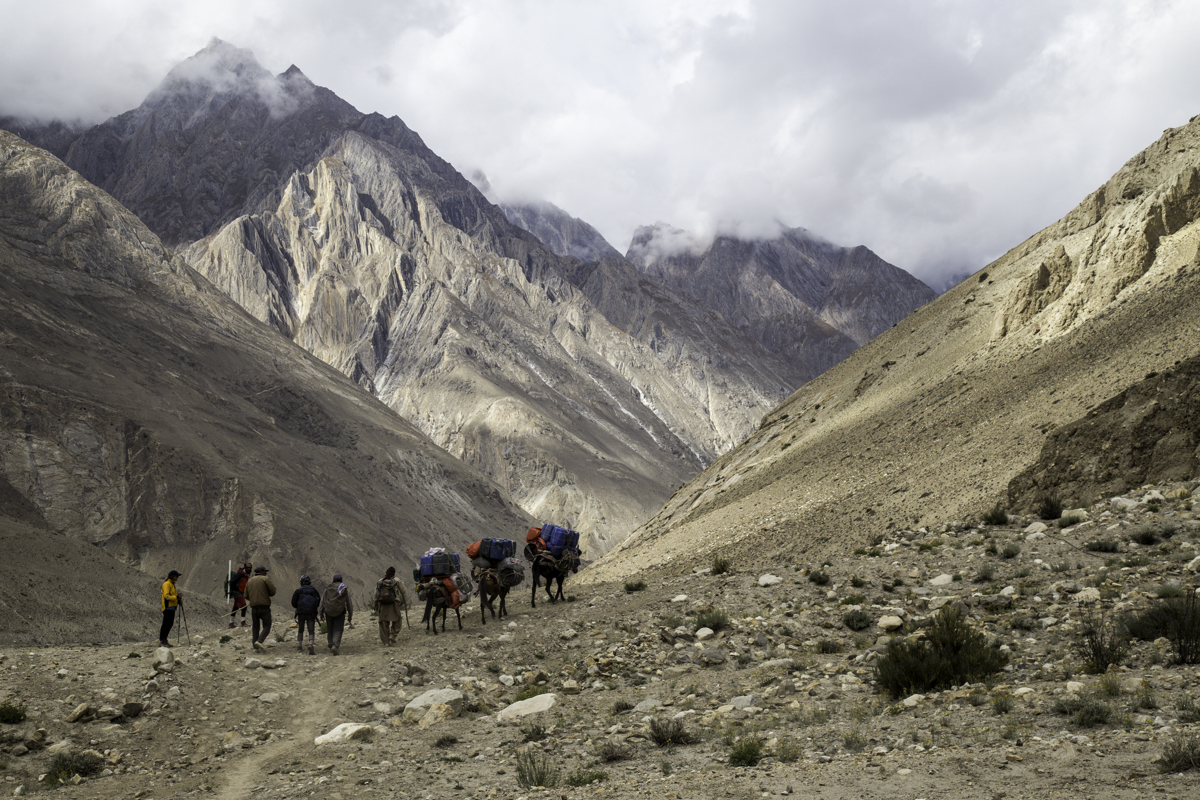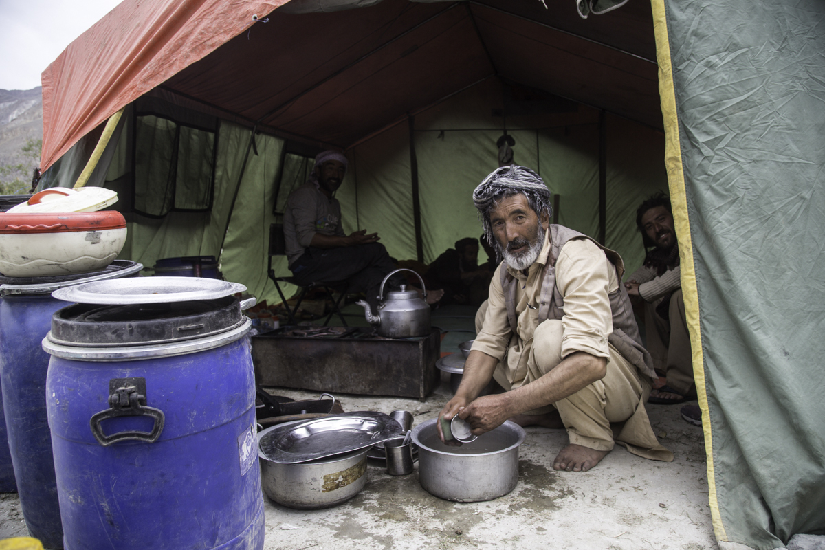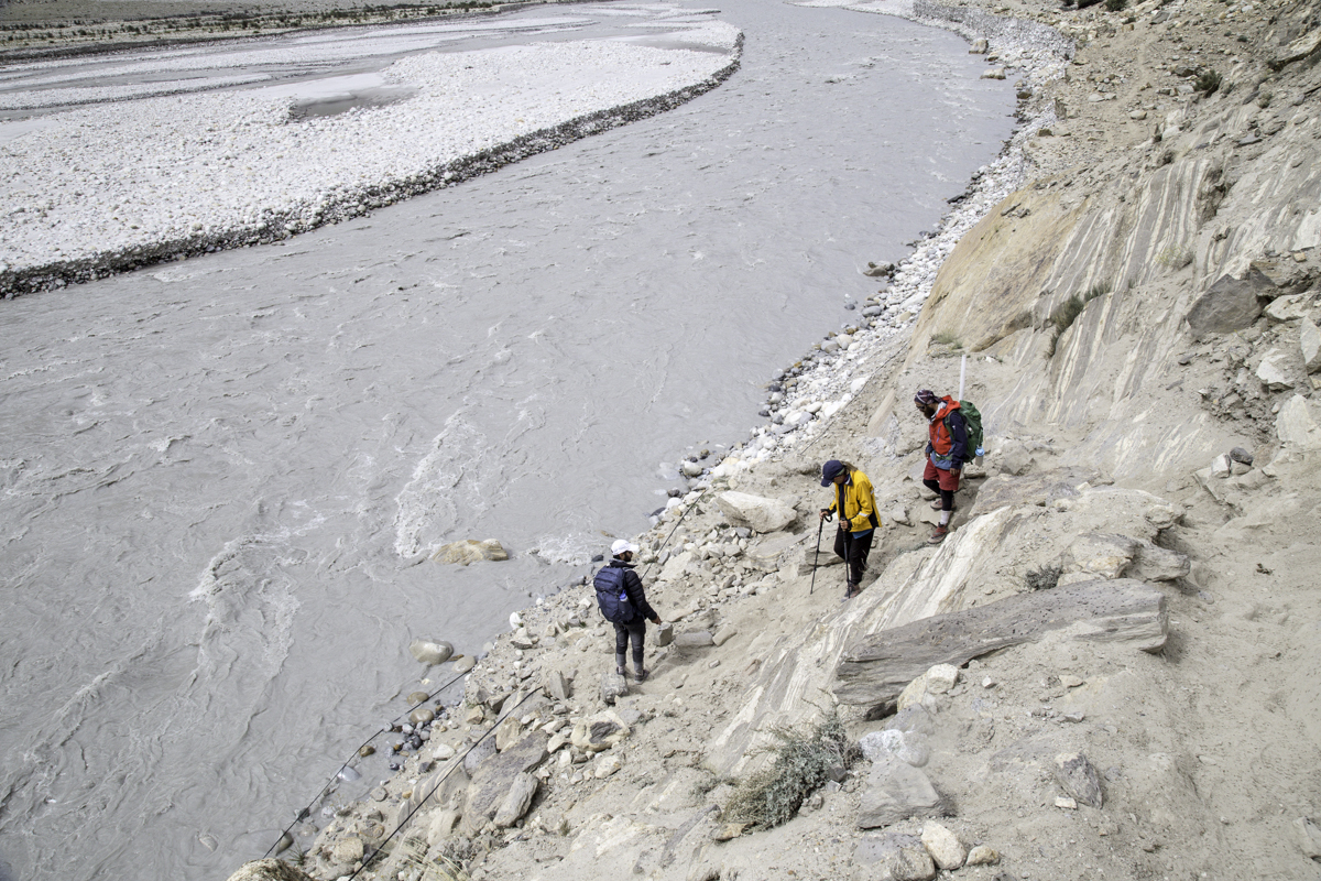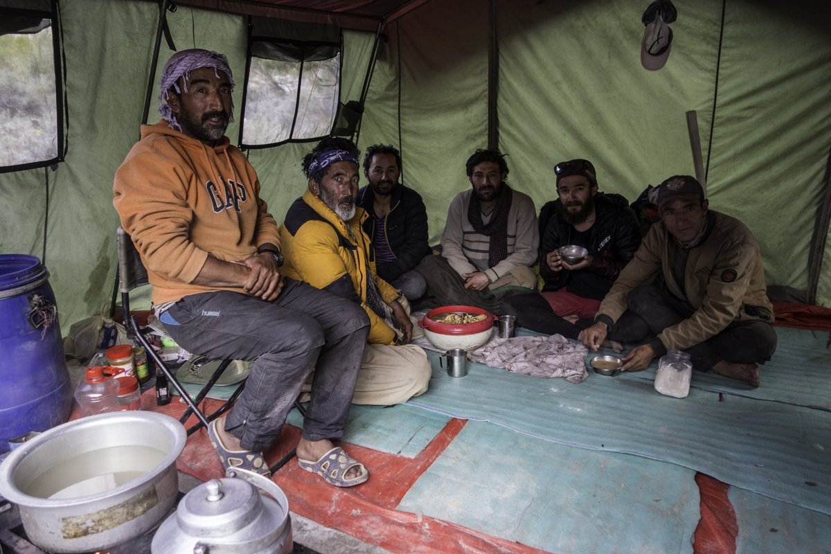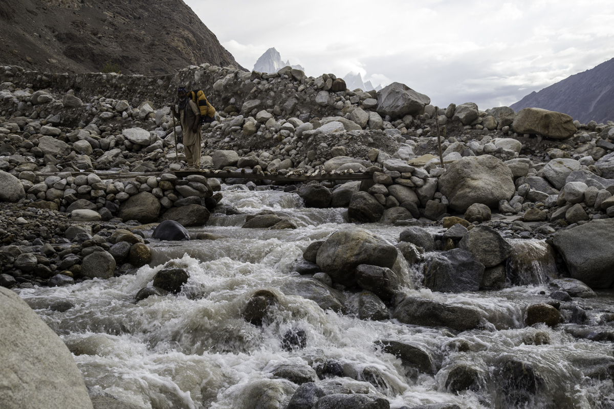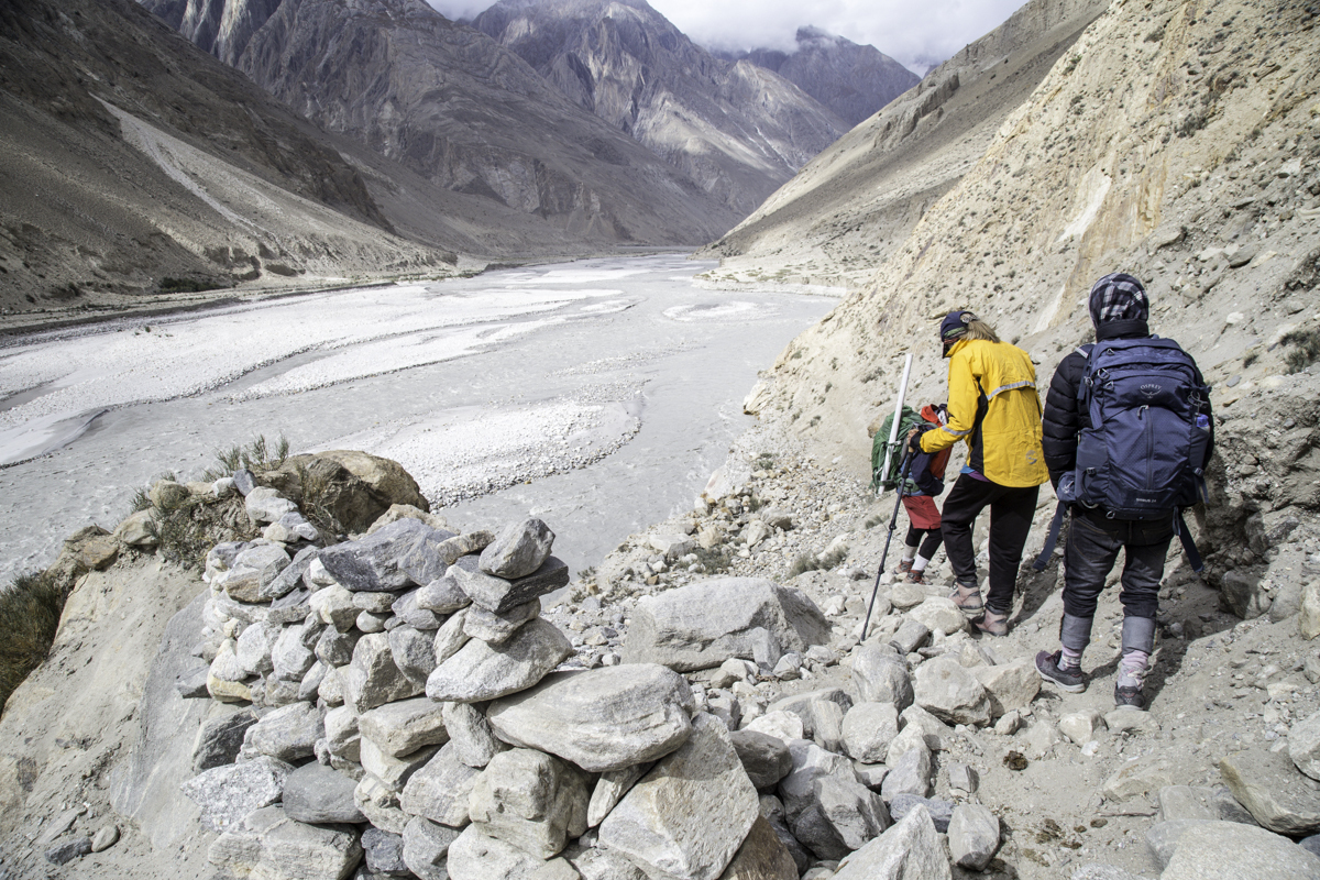 Storms are moving into the mountains. Our original destination today is the same camp at Jola along the river on our first day trekking up to Concordia.