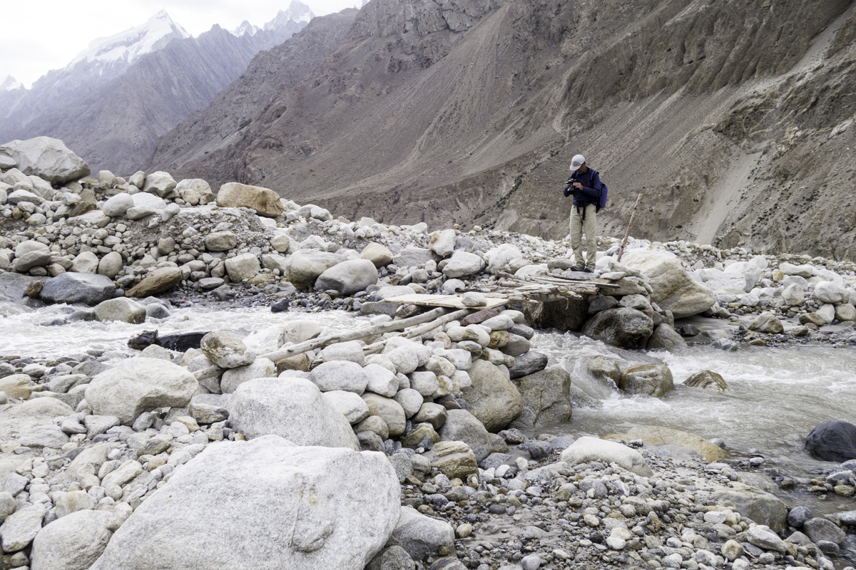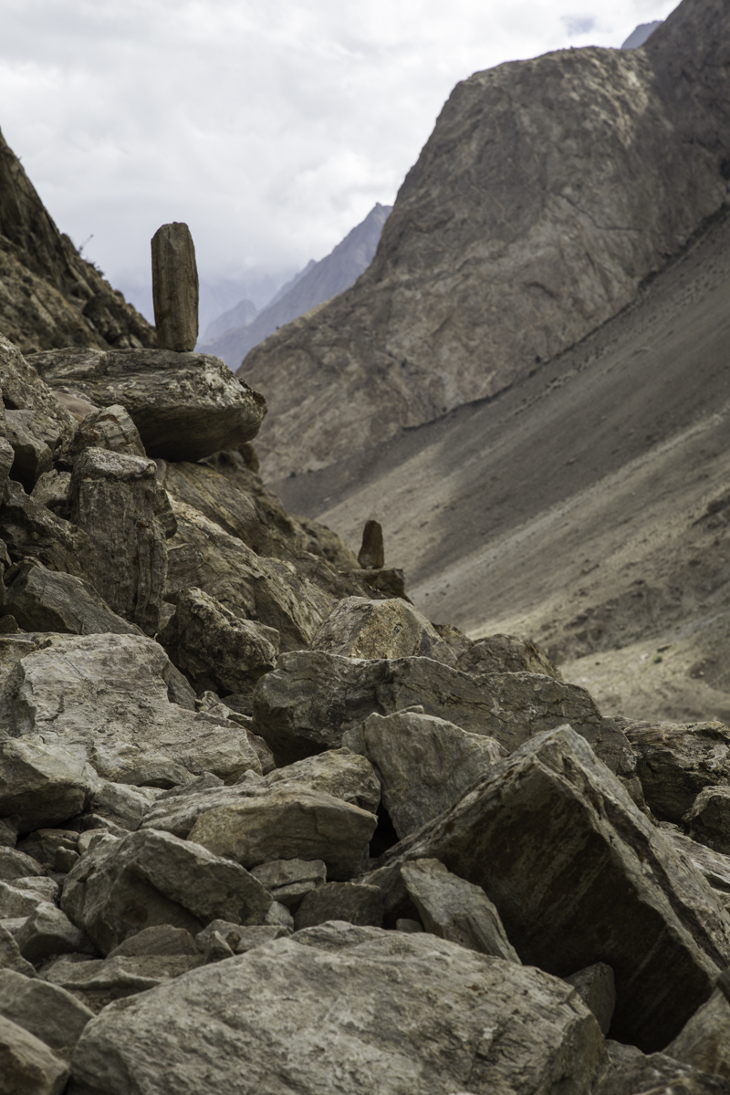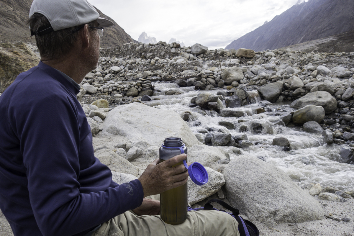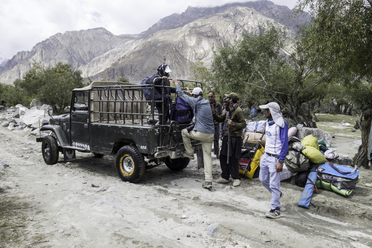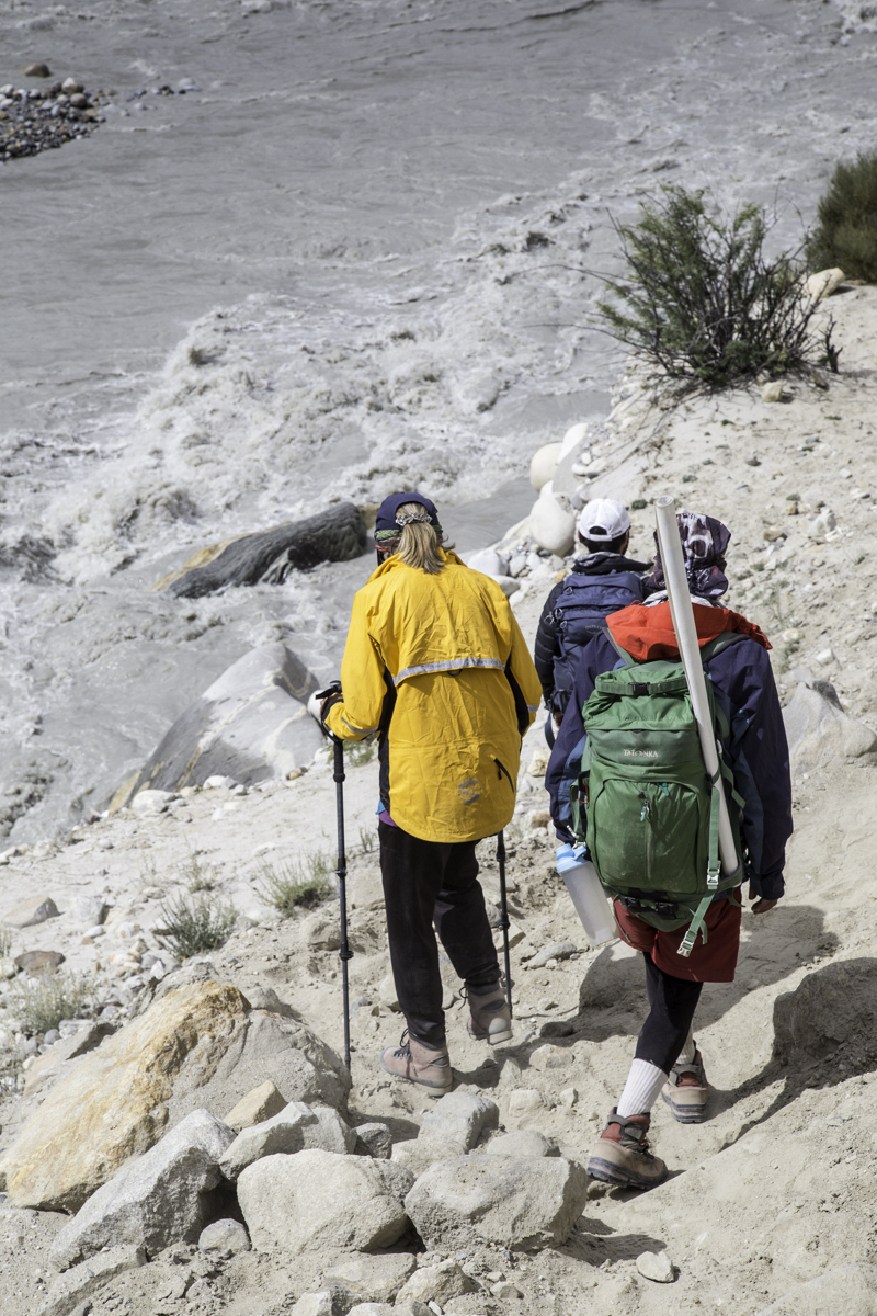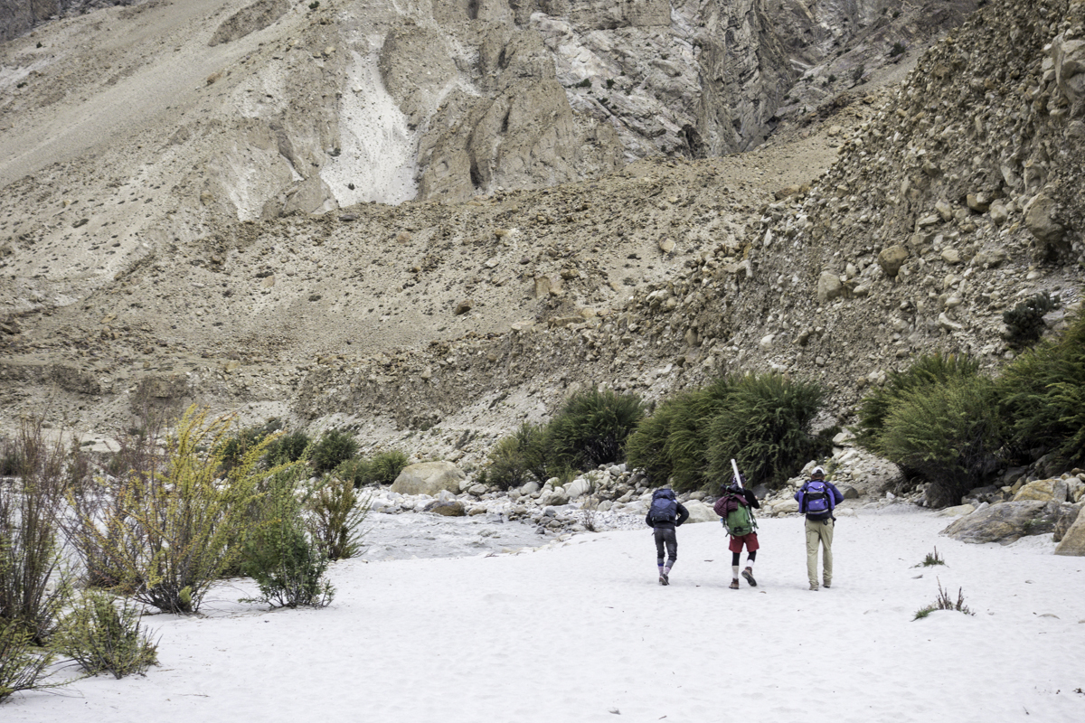 Storms are moving into the mountains. Our original destination today is the same camp at Jola along the river on our first day trekking up to Concordia.