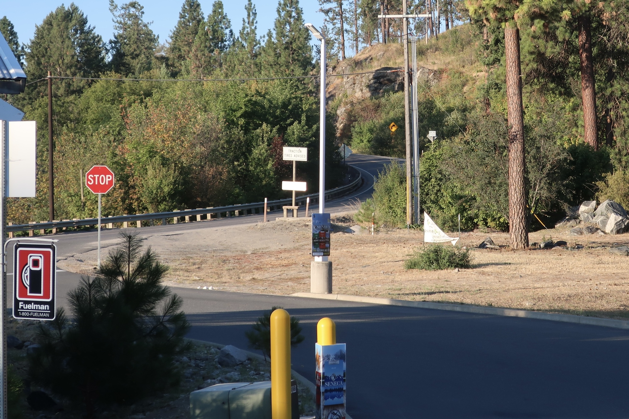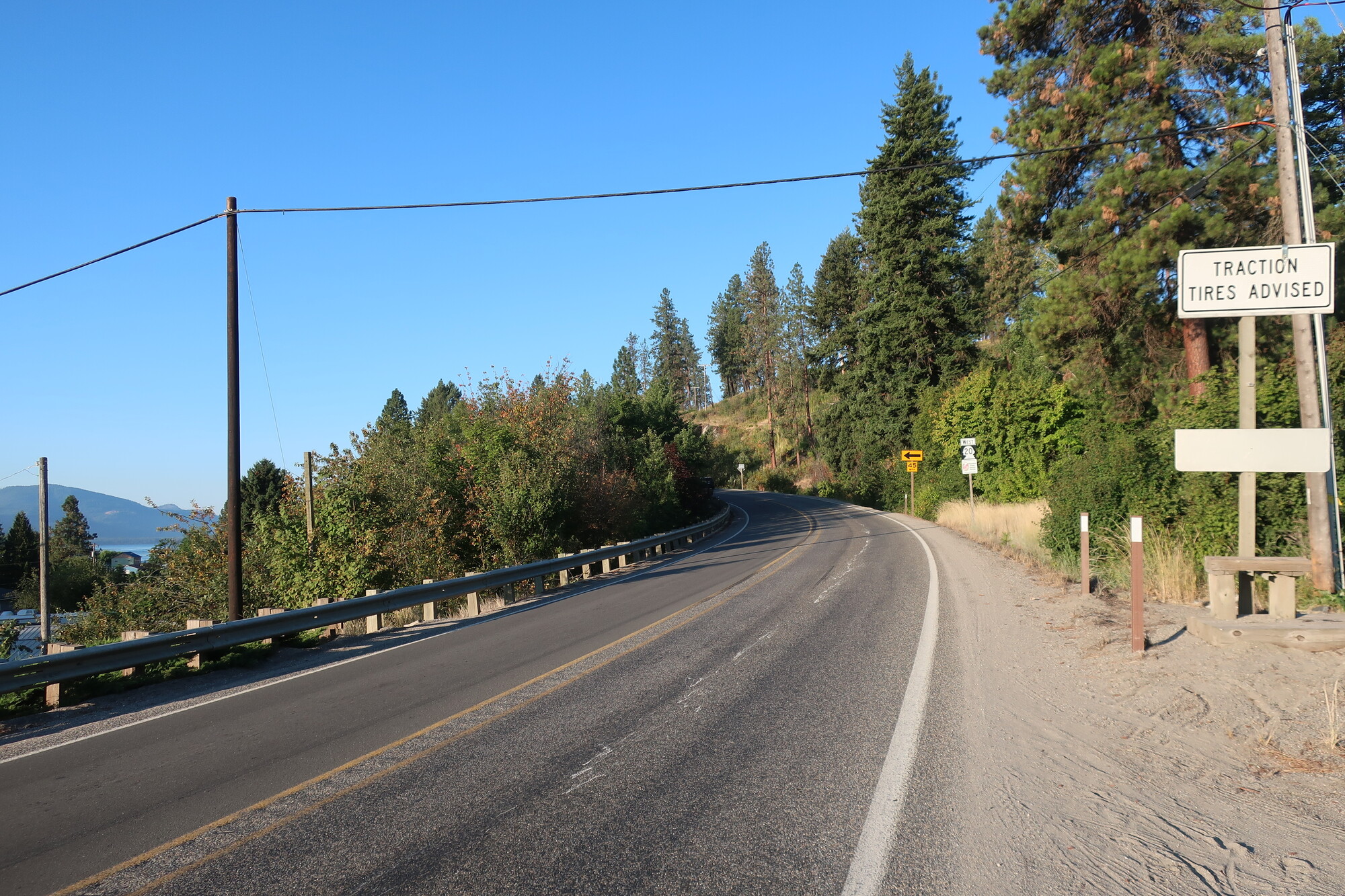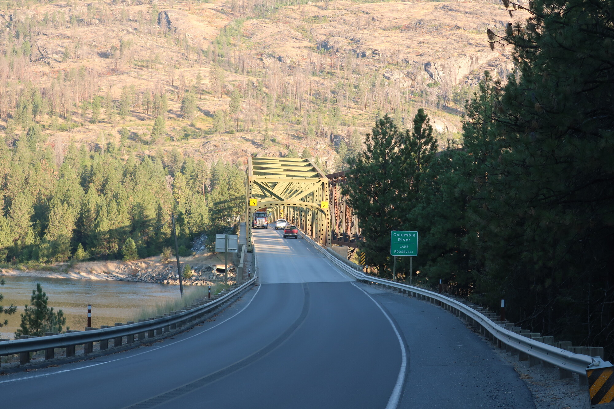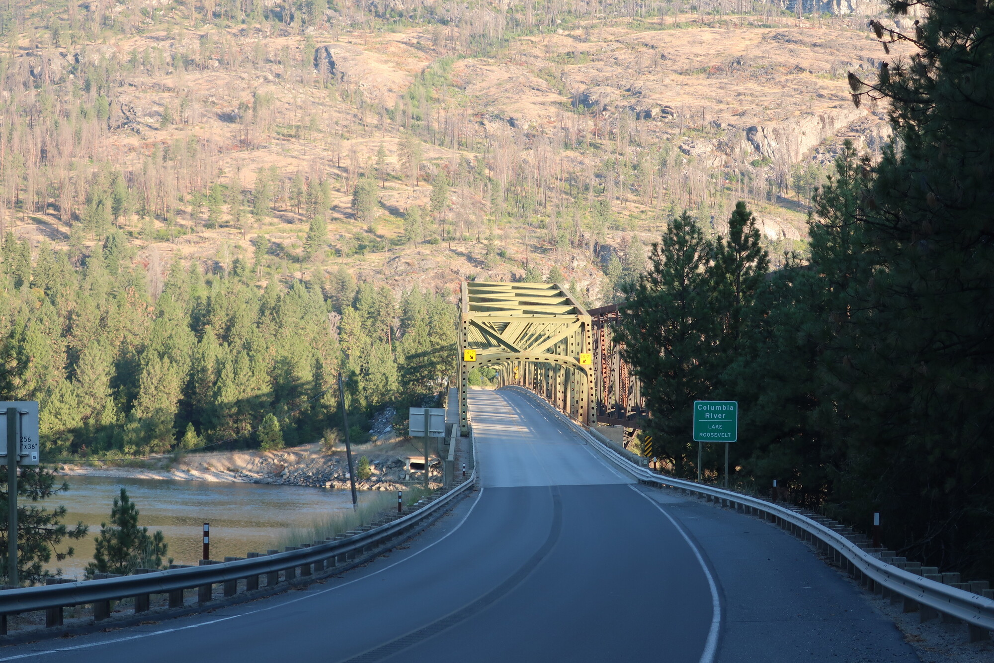 I waited until it was clear and raced across, tailed closely by a patient logging truck. I couldn’t risk a glance to the side and so missed the morning golden hour view of the river