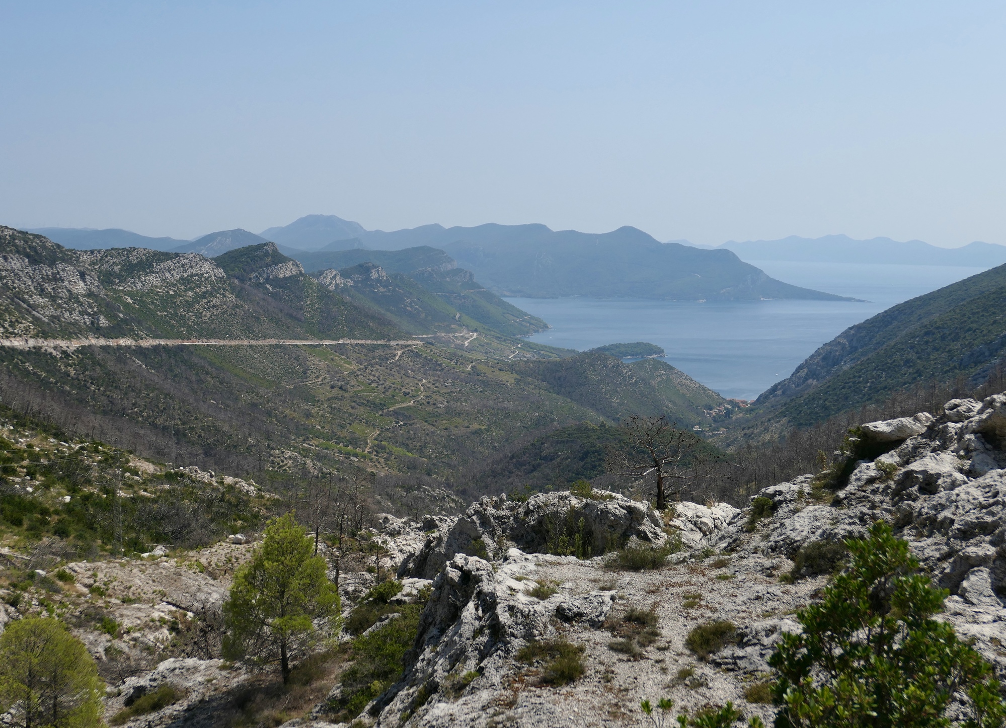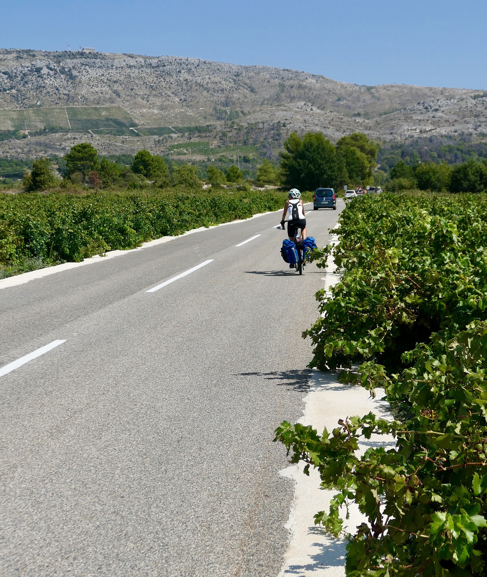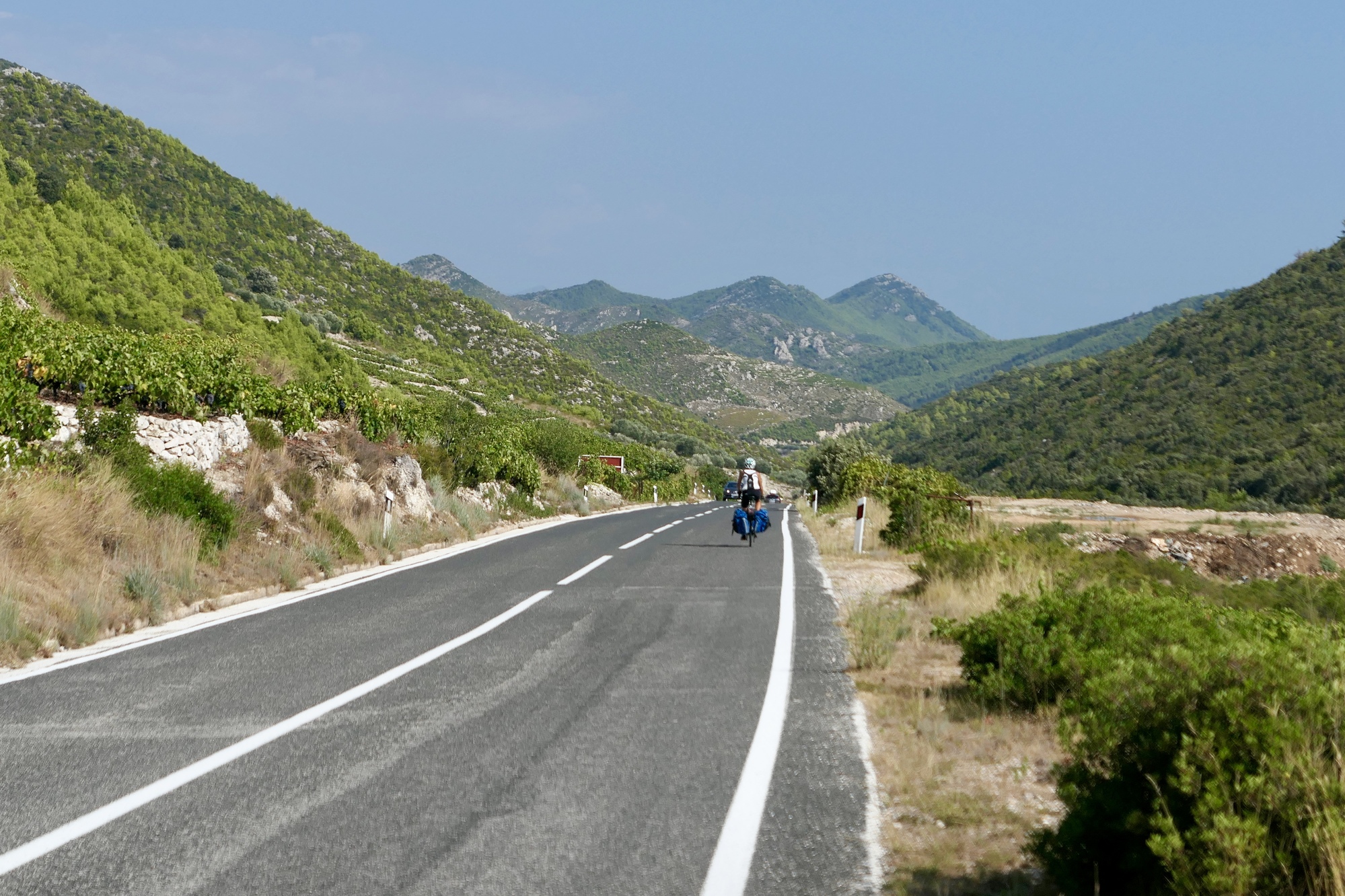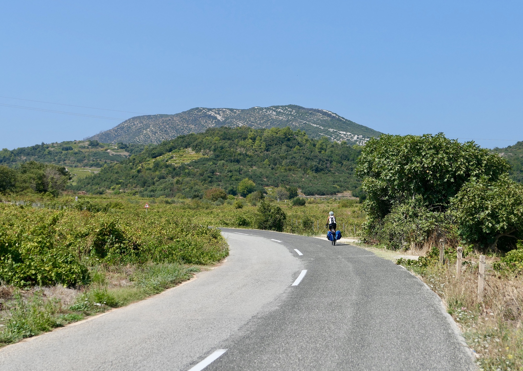 Peljesac makes for a very beautiful but rugged ride. Its northern end is crowned by Mount Sveti Ilija, which we’ve seen across the water from Korcula. The mountain is the crest of the long limestone ridge that forms the spine of the island. Today’s ride follows the highway south as it climbs the ridge, drops into a central trough filled with vineyards and wine stores, and then climbs out again before finally dropping to the sea.