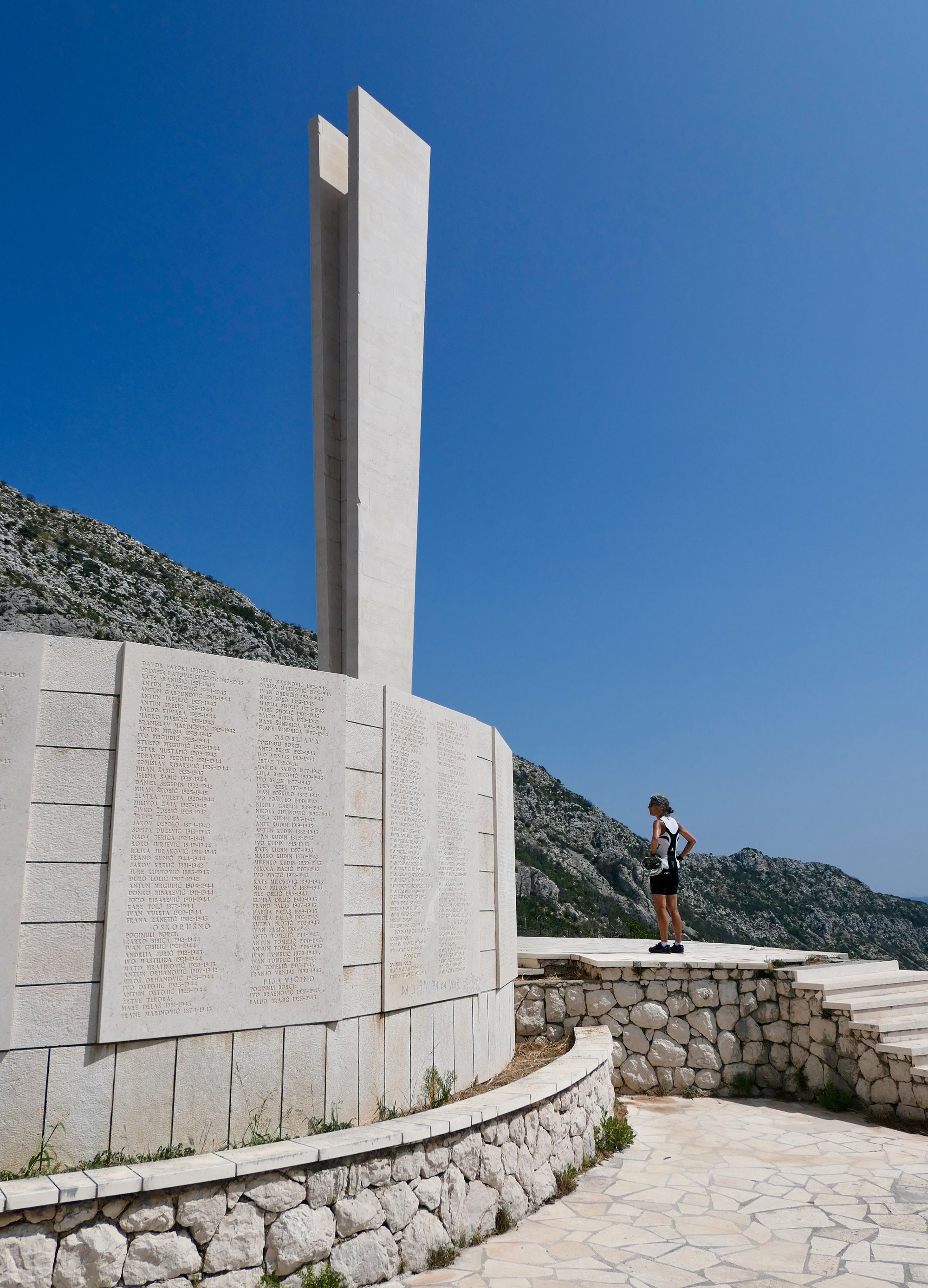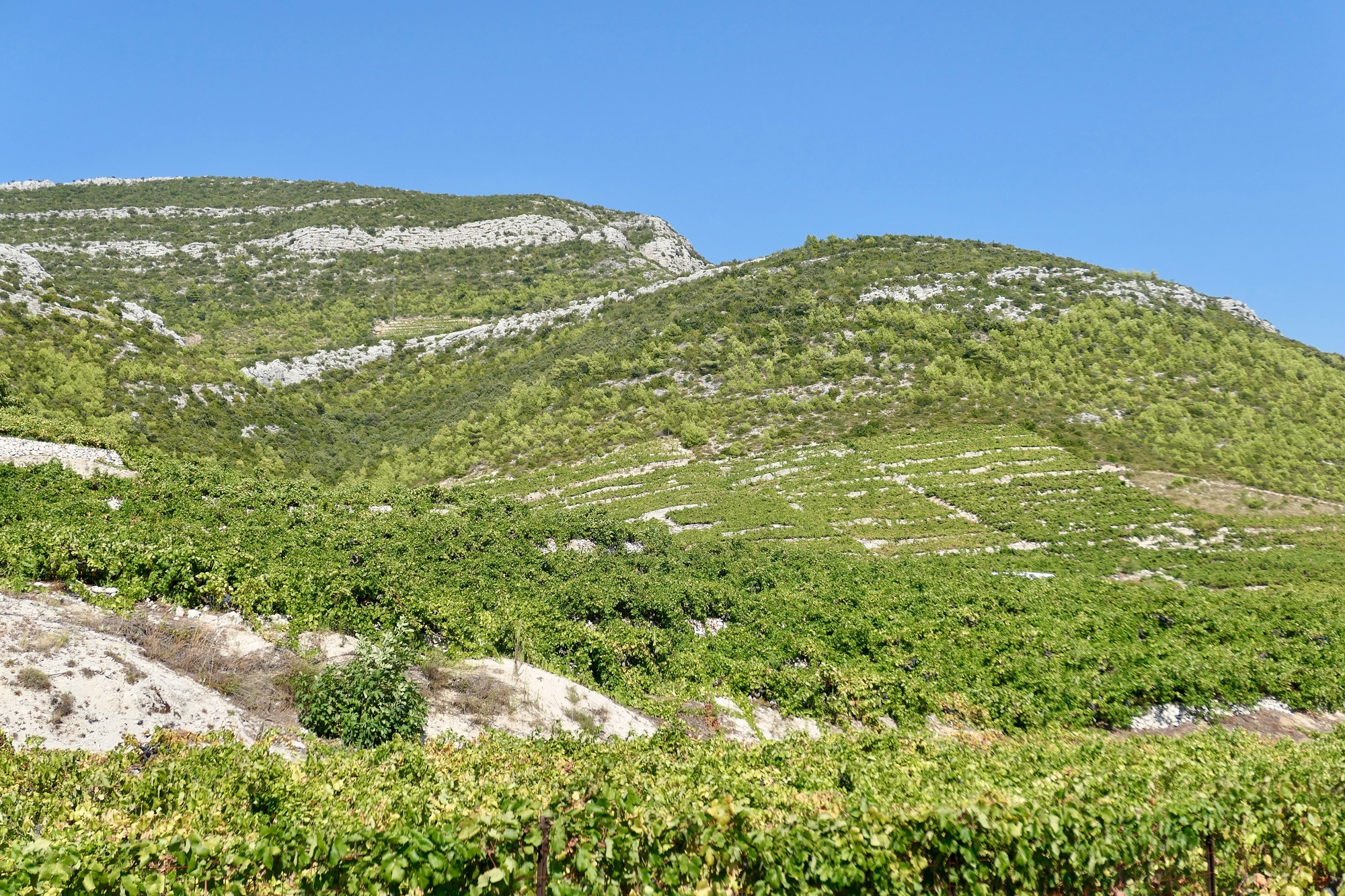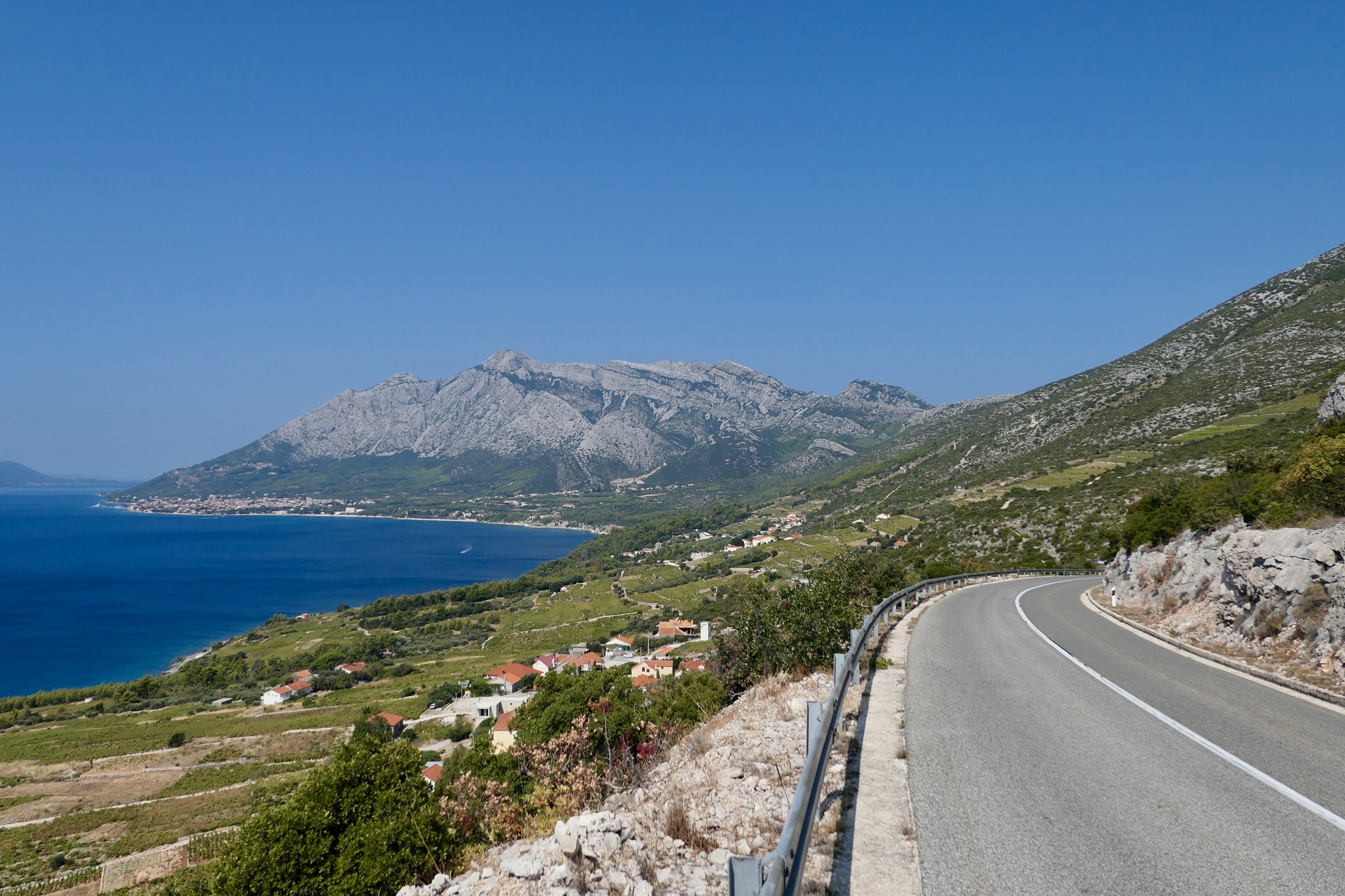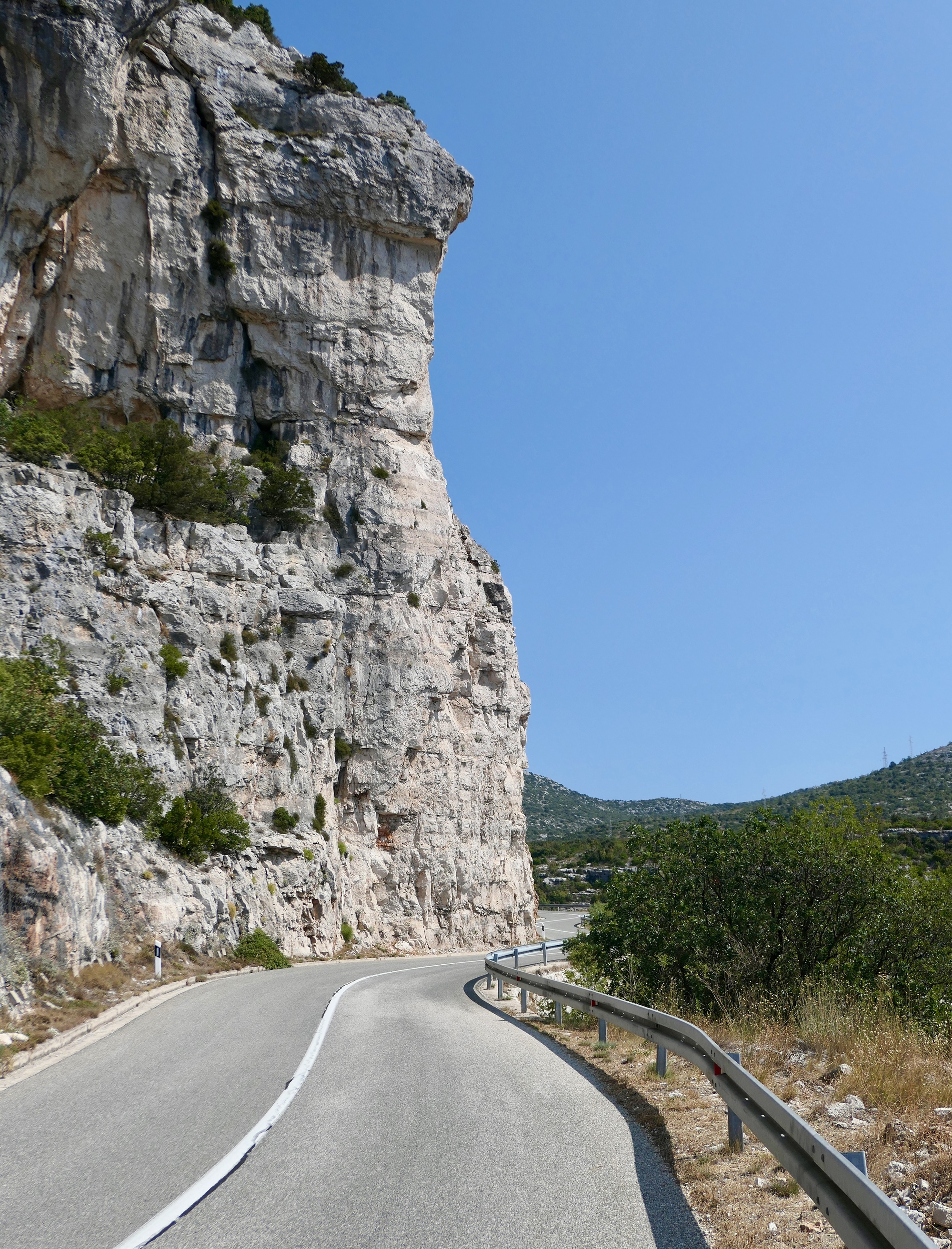 Peljesac makes for a very beautiful but rugged ride. Its northern end is crowned by Mount Sveti Ilija, which we’ve seen across the water from Korcula. The mountain is the crest of the long limestone ridge that forms the spine of the island. Today’s ride follows the highway south as it climbs the ridge, drops into a central trough filled with vineyards and wine stores, and then climbs out again before finally dropping to the sea.
