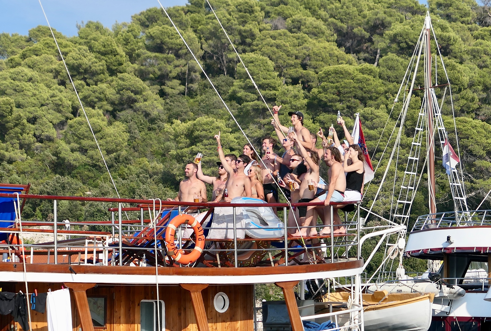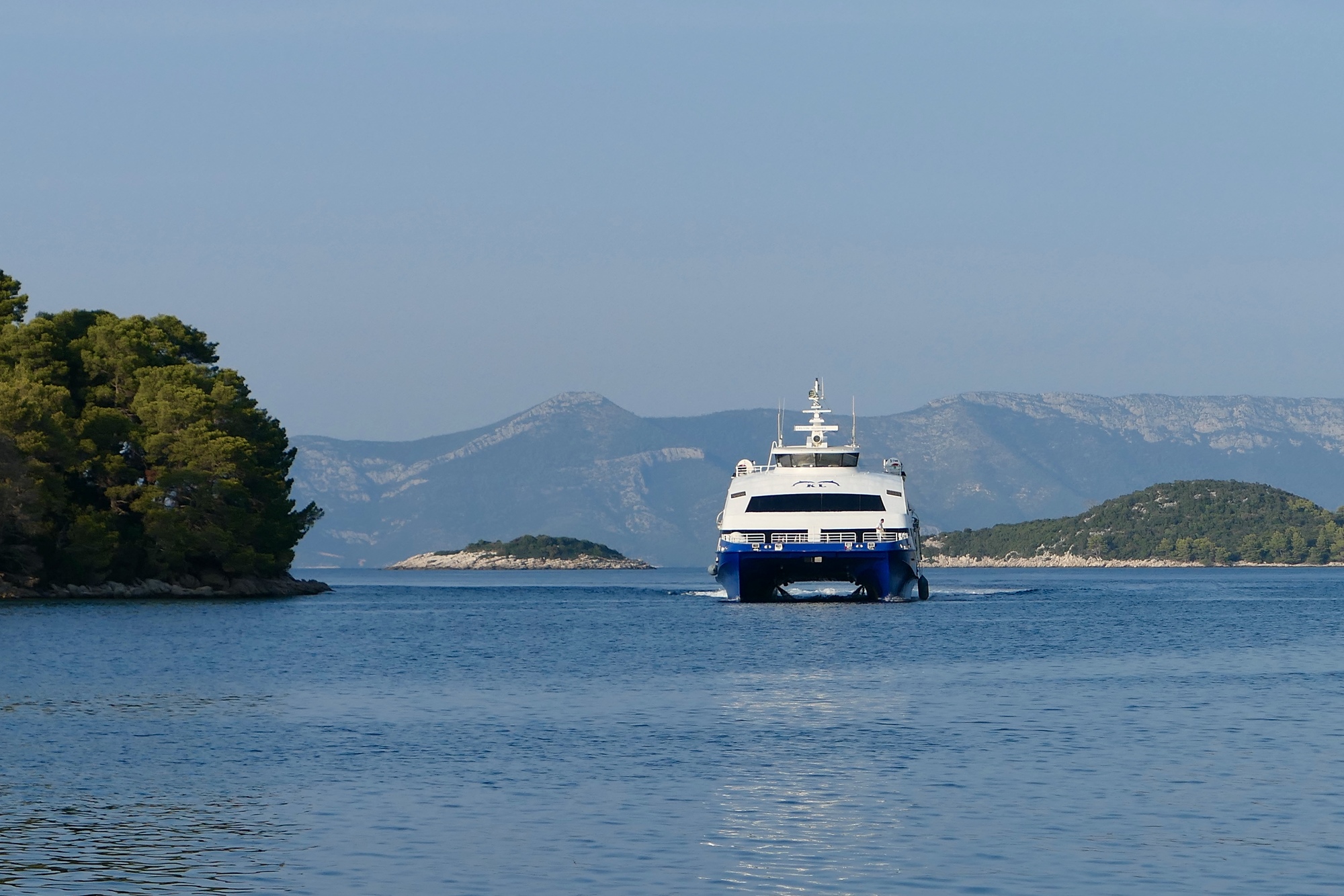 We leave the restaurant and bike the three miles to Pomena, the port village where we catch the ferry. We lie in the shade for an hour until it’s arrival, surrounded by sunbathers, ‘entertained’ by the raucous drunken reveling by a crowd of young aussies reveling on the deck of a huge charter boat moored by the shore at the point where the catamaran will land, They keep at it until right before the ferry arrives, pulling out into the bay only about five minutes before our boat arrives.