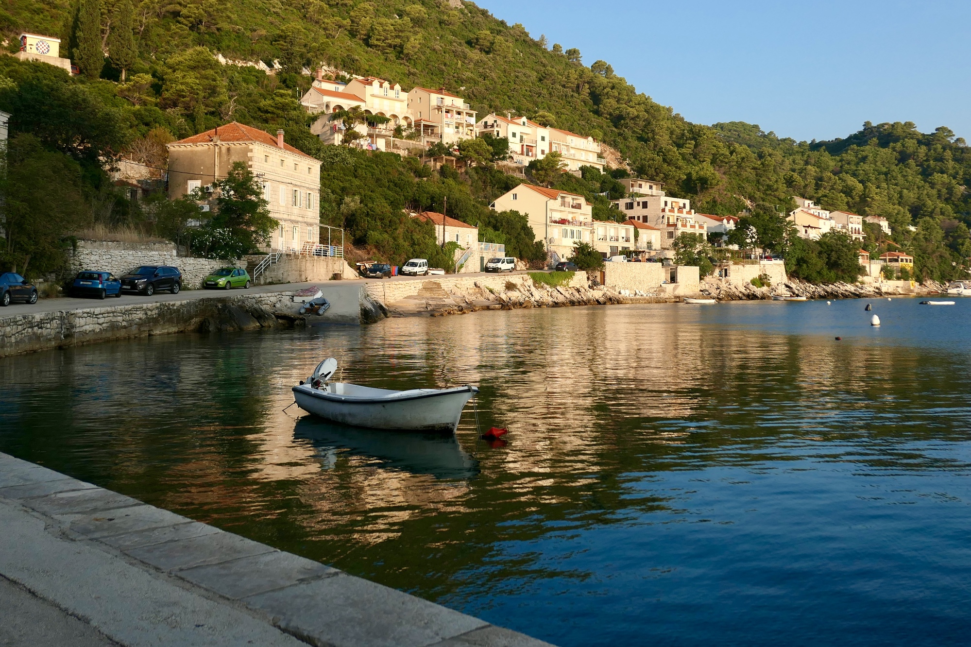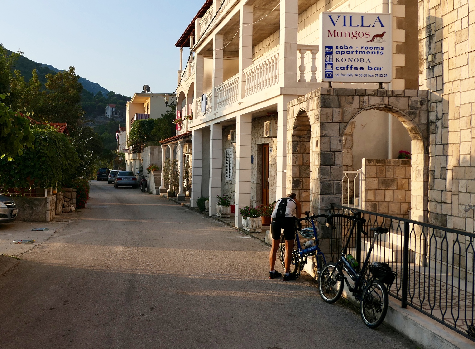 The heat and humidity wore both of us down yesterday, so starting today we’re going to change our pattern and try to get our miles in early. This morning we get out the door before seven and bike the twenty mile loop to the south end of the island and back before breakfast. We’re rewarded with the most refreshing miles we’ve put in so far here in Korcula, and virtually empty road. Even this early though, we’re pretty well drenched by the time we coast back to Sobra. It’s a good thing that we find a well ventilated, secluded table at breakfast!