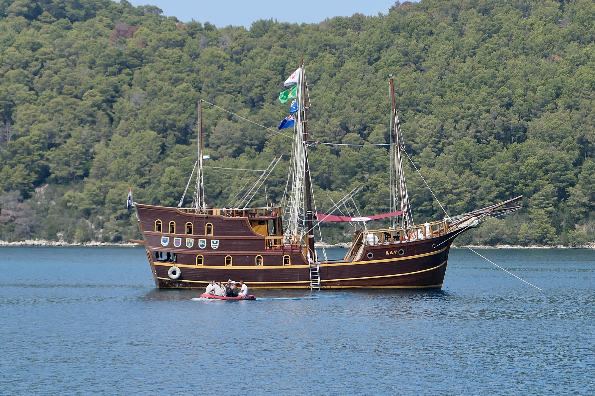We arrive at police, the largest settlement at the north end, at one. We spend the next three hours nursing a slow lunch at a bayside table. The bay is filled with huge yachts and cruise ships bringing tourists to the villages to shop, eat, or rent bicycles for short rides through the national park. I recognize this one from our stroll along the waterfront in Dubrovnik a few days back.