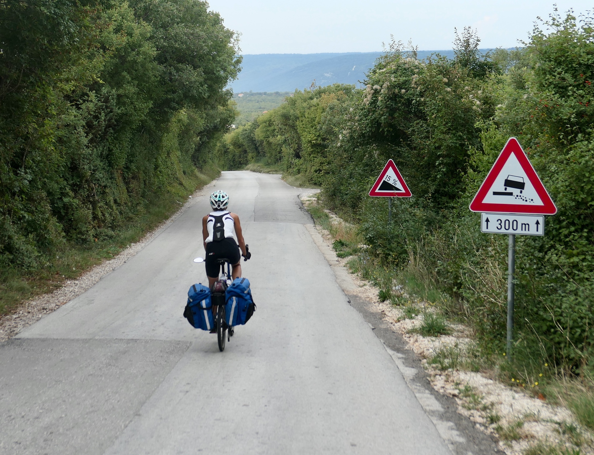 After this, the ride changes completely. There’s only one road to Rovinj from central Istria; and it’s shoulderless single lane; and we’re competing with everyone - tourists, campers, trucks, buses, the whole catastrophe. It’s straight, so the visibility is good at least; but it’s straight, so everyone feels like they can race and pass slower cars at will. Yuk.
