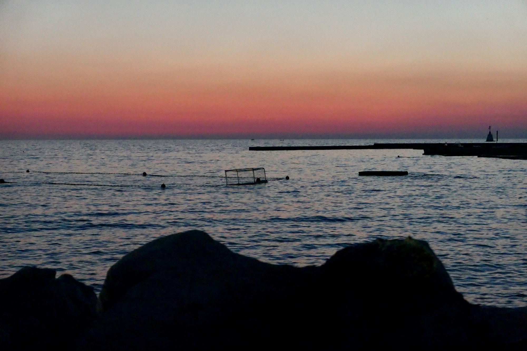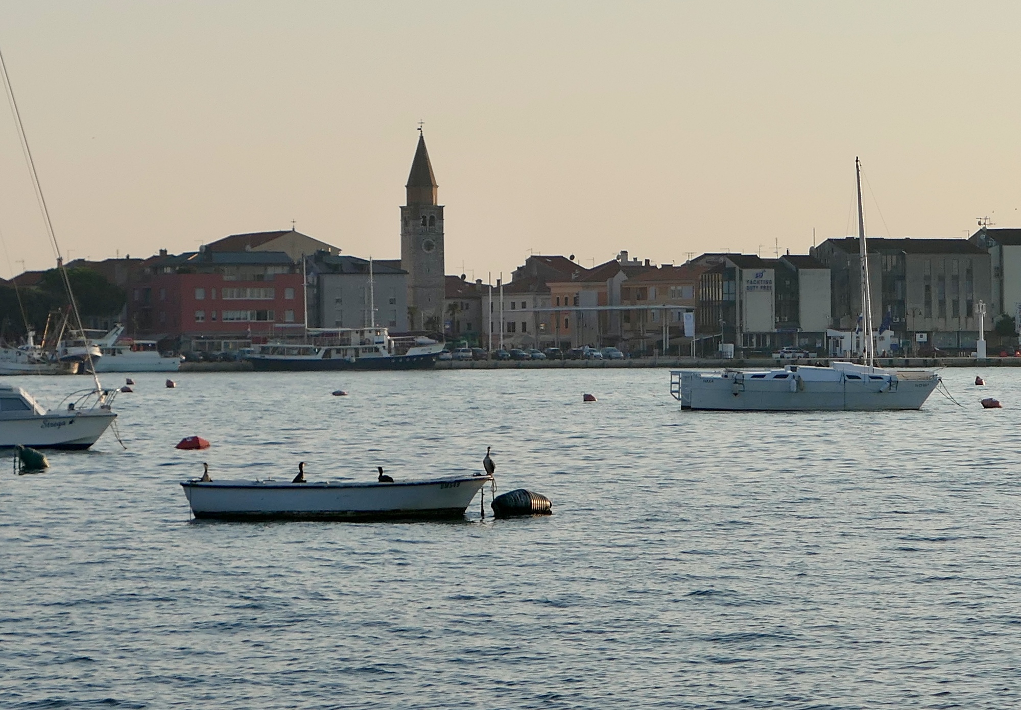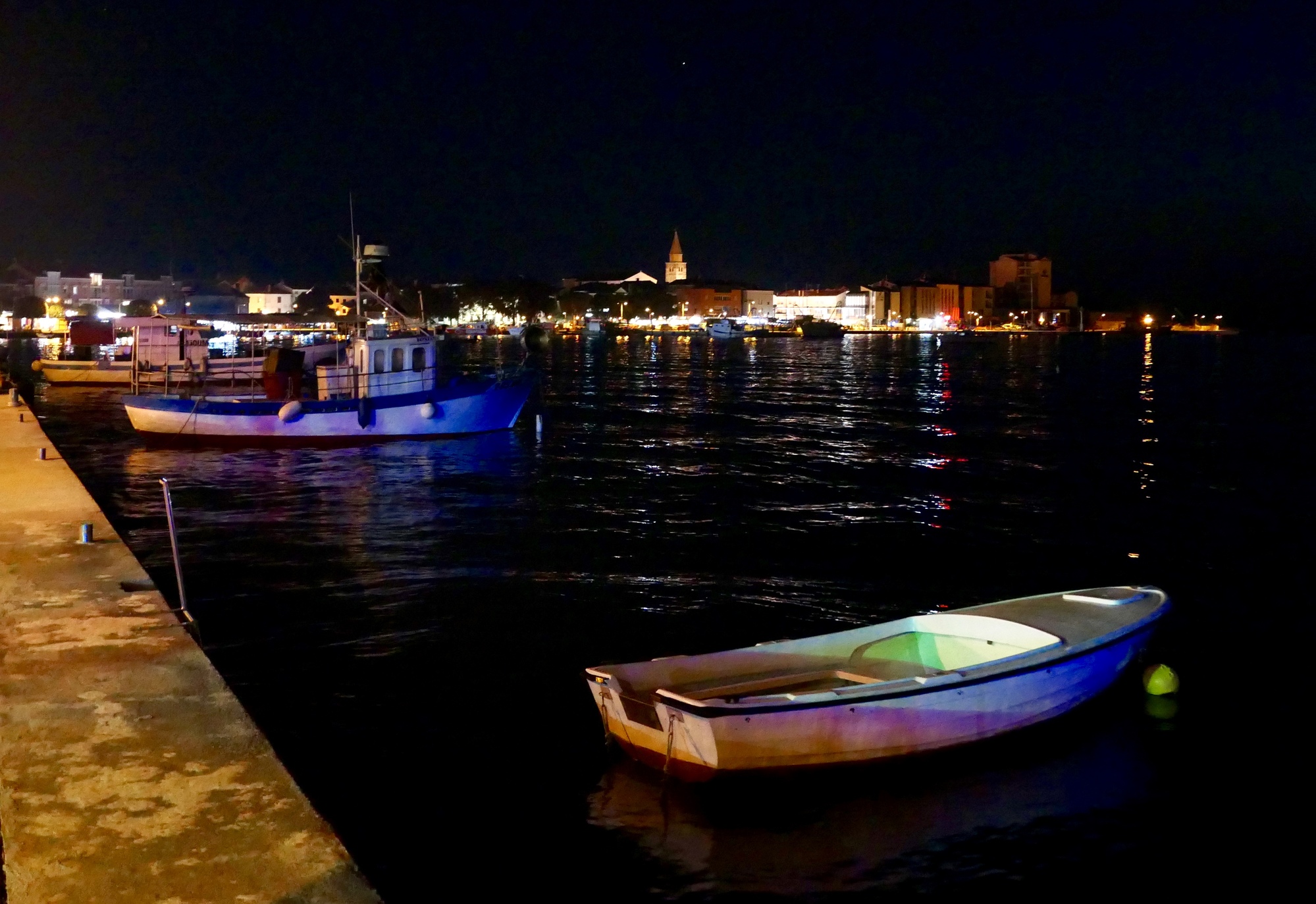 For dinner we walked along the waterfront to the marina and enjoyed our last meal in Croatia. Afterwards, we enjoyed the best sunset of the tour so far walked back along the waterfront to the old town and our apartment. It’s very pleasant out -comfortable, fairly quiet, the moon edging its way toward full. Walking along the harbor, taking in the fishing nets and gear on the quay, the boats bobbing and lights reflecting on the water, folks strolling along slowly with their ice cream cones, I’m surprised to find that I’m feeling a bit nostalgic. This will be our last night on the waterfront until we return to the sea near the French border seven weeks from now. I won’t miss the heat during the day, but I’ll sure miss these warm Mediterranean nights.