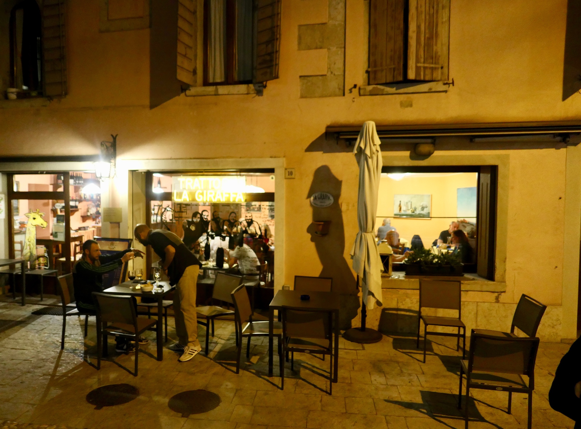 The Giraffe Trattoria, in Serravalle. Delightful place. We were lucky to get in. The couple in the right window sat next to us, and are from Calgary on an extended motor cycle tour.