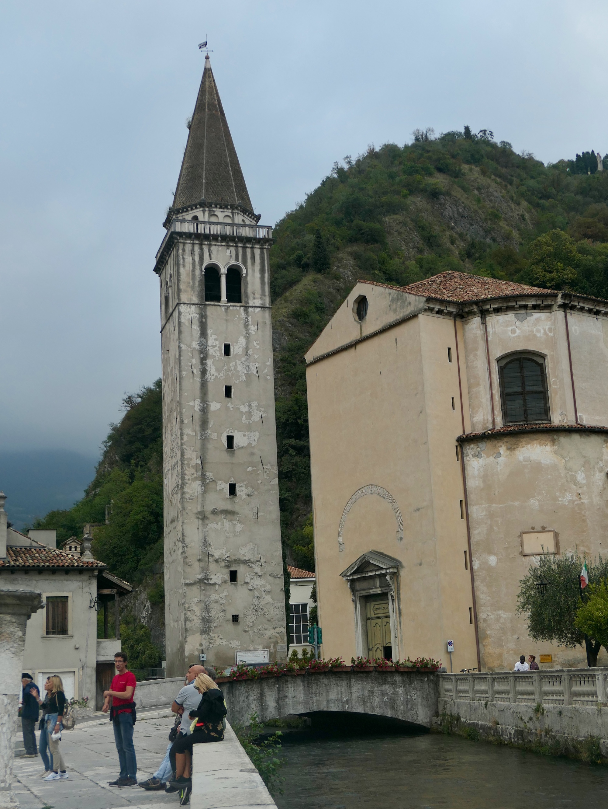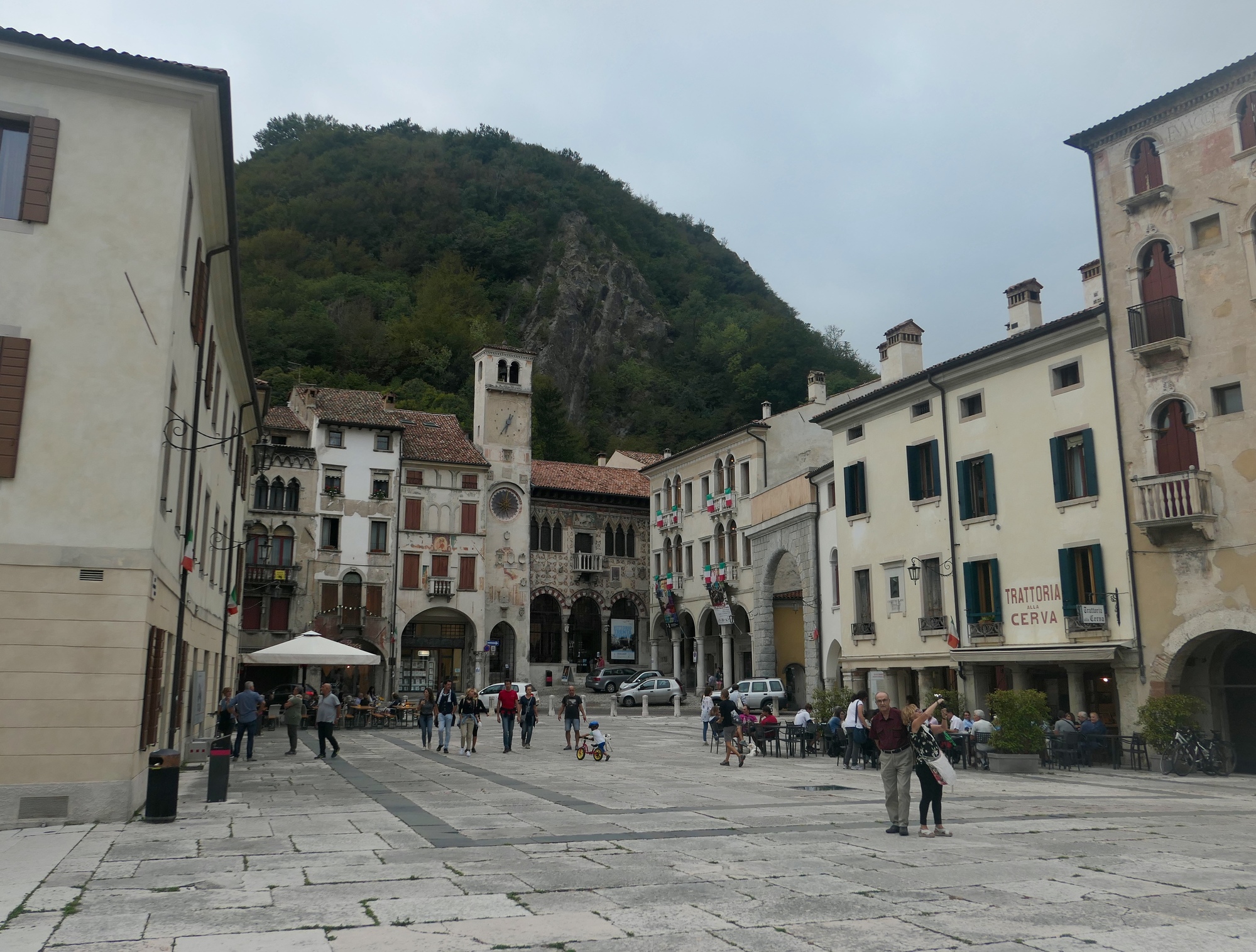 Our hotel is at the south end of town, but the restaurant that was recommended to us is at the north end, about a mile and a half away. It’s a long ribbon of a town, wedged into a narrow gap in the first ridge of the mountains. As we walk, it’s apparent there is some sort of festivity occurring, because the trunks of the horse chestnuts lining the streets are wrapped in Italian flags. When we reach Serravalle (the northern half of Vittorio Veneto, which is a merger of two smaller towns), we’re started by the level of traffic. Serravalle is quite colorful, with an impressive gate at its south end (and at the north, as we would later find). I’m frustrated though in trying to take a decent photo of it because the traffic is absolutely nonstop.
