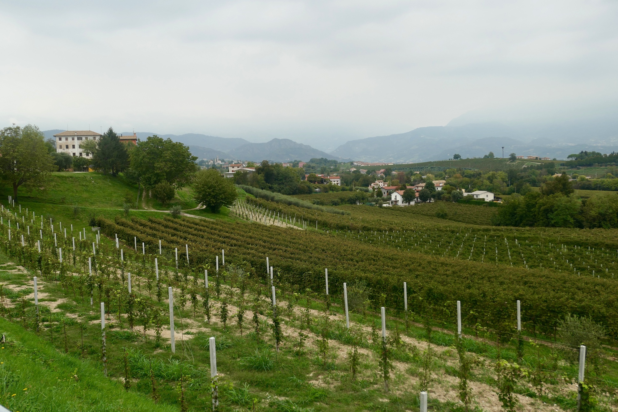 Around Conigliano, everything changes. Suddenly we find ourselves climbing small rollers, and not far off we see ridges appearing through the distant haze. I hadn’t really looked at the topography for today’s route, but it ends right at the southern edge of the pre-Alps. Vittorio Veneto is only about ten miles below BElluno as the crow flies, if there weren’t a two thousand foot ridge in between.
