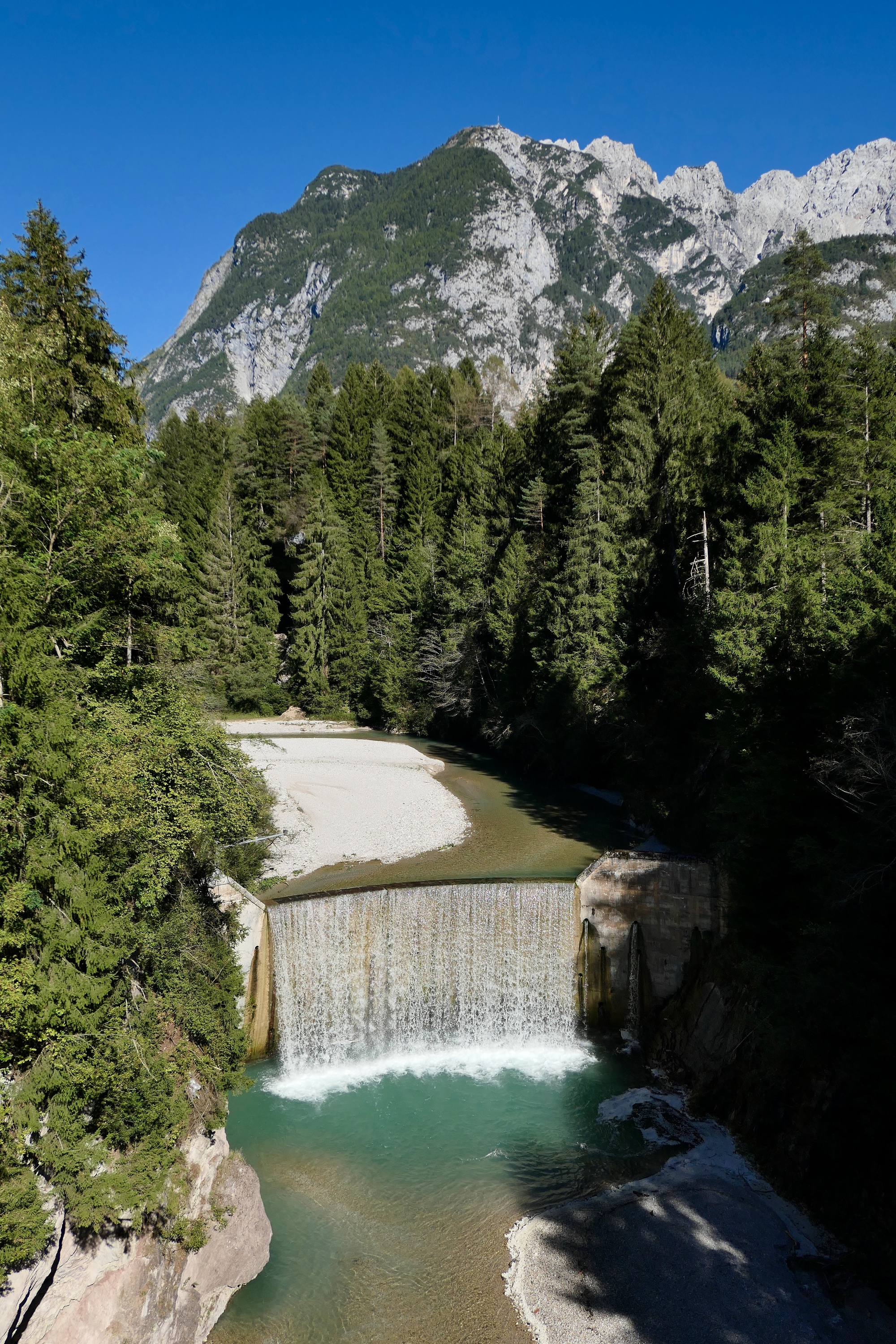 In Pieve we part ways with the bike route, which leaves the Piave (yes, I know Pieve and Piave are a confusing name pair; not my fault though) and veers northwest to Cortina. Our road continues up the Piave, but for most of the way we’re on the highway now, and not really enjoying it so much - minimal shoulder, maximal traffic. For a few miles it feels like we’re back in Croatia. It only lasts for about six or seven miles though, and then we round a bend, Auronzo di Cadore comes into view, and our jaws drop. The town lies along the north bank of the Piave, and is backdropped by an awesome crown of jagged peaks. Between us and the town is the artificial Santa Catarina Lake, formed by a dam. The lake is a surreal blue, reminding me of the unbelievable hue of Peyto Lake that we saw earlier this summer in the Canadian Rockies. We walk out on the dam for an unobstructed look, and just stare.