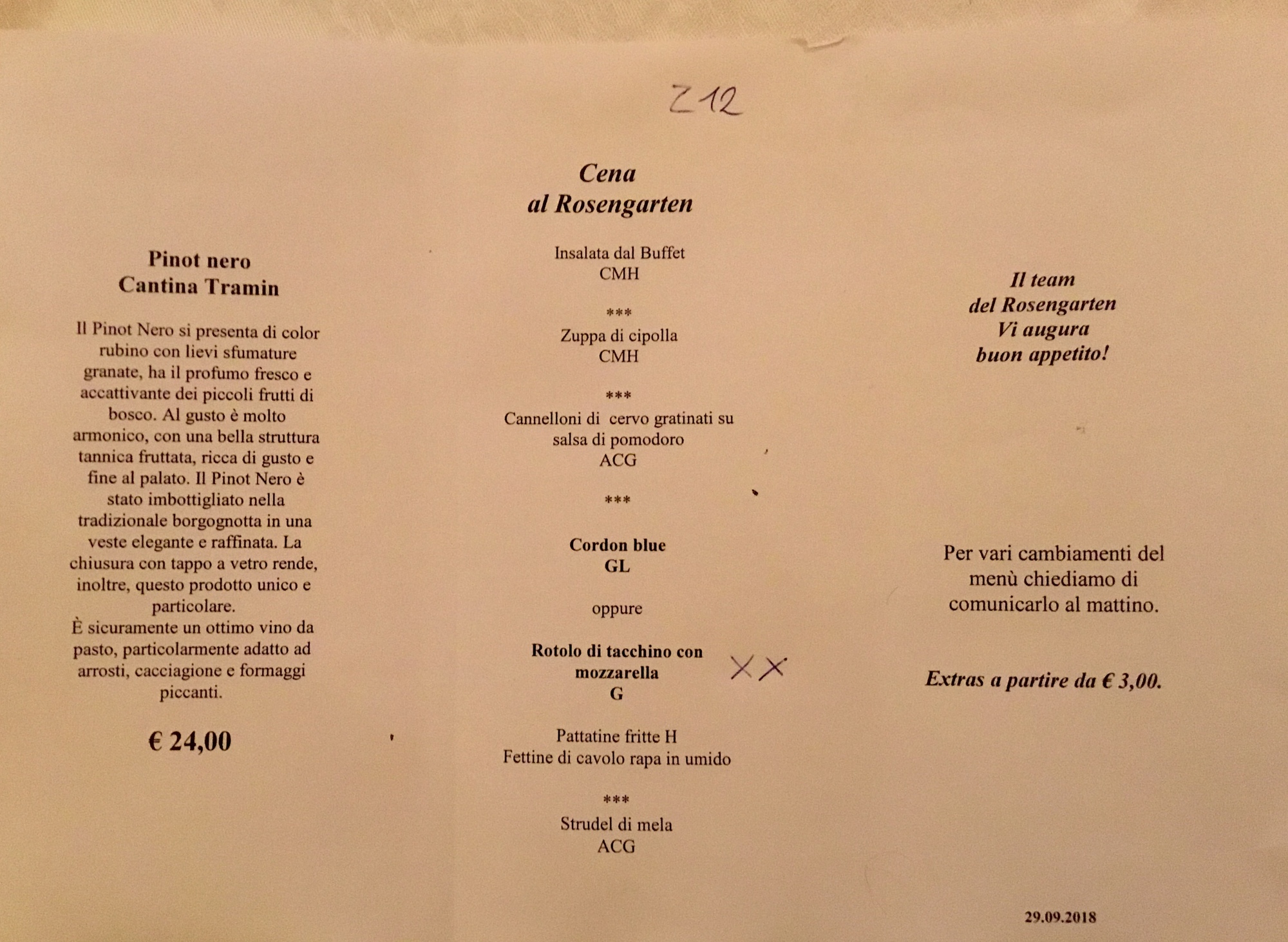 Today it feels very much like it did then: there’s a rose on the bed when we arrive; the hotel is still run by Alexander, who looks still youthful but a bit older; the waitresses wear dirndls; and we are presented with the evening menu at breakfast so we can choose between the two main course options. It’s changing though. It is encased in scaffolding, and Alexander says it will close for the season next week so that major renovations and modernization can occur before reopening for the ski season. He says that we are the last guests staying in this room, and next year it will look much different.