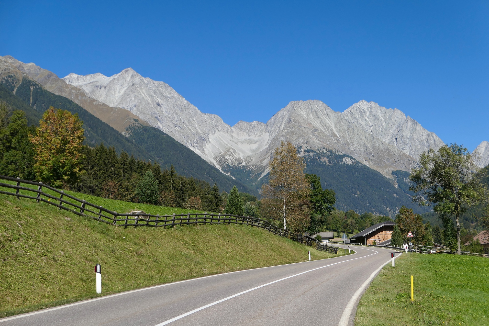 The Anterselva, one of the tributaries of the Rienz, flows south from its origins in the High Tauren Range for about twenty miles before emptying into the Rienz. The road we follow runs up the valley along the river, eventually topping out at Staller Saddle, a high pass on the Austrian Italian border. We ride up it toward the mountains for as long as we have time and energy. At first it’s an easy ride that climbs gently through very similar country to what we’ve ridden so far today. After about ten miles though, things get more serious and we’re pushing into another ten percenter.