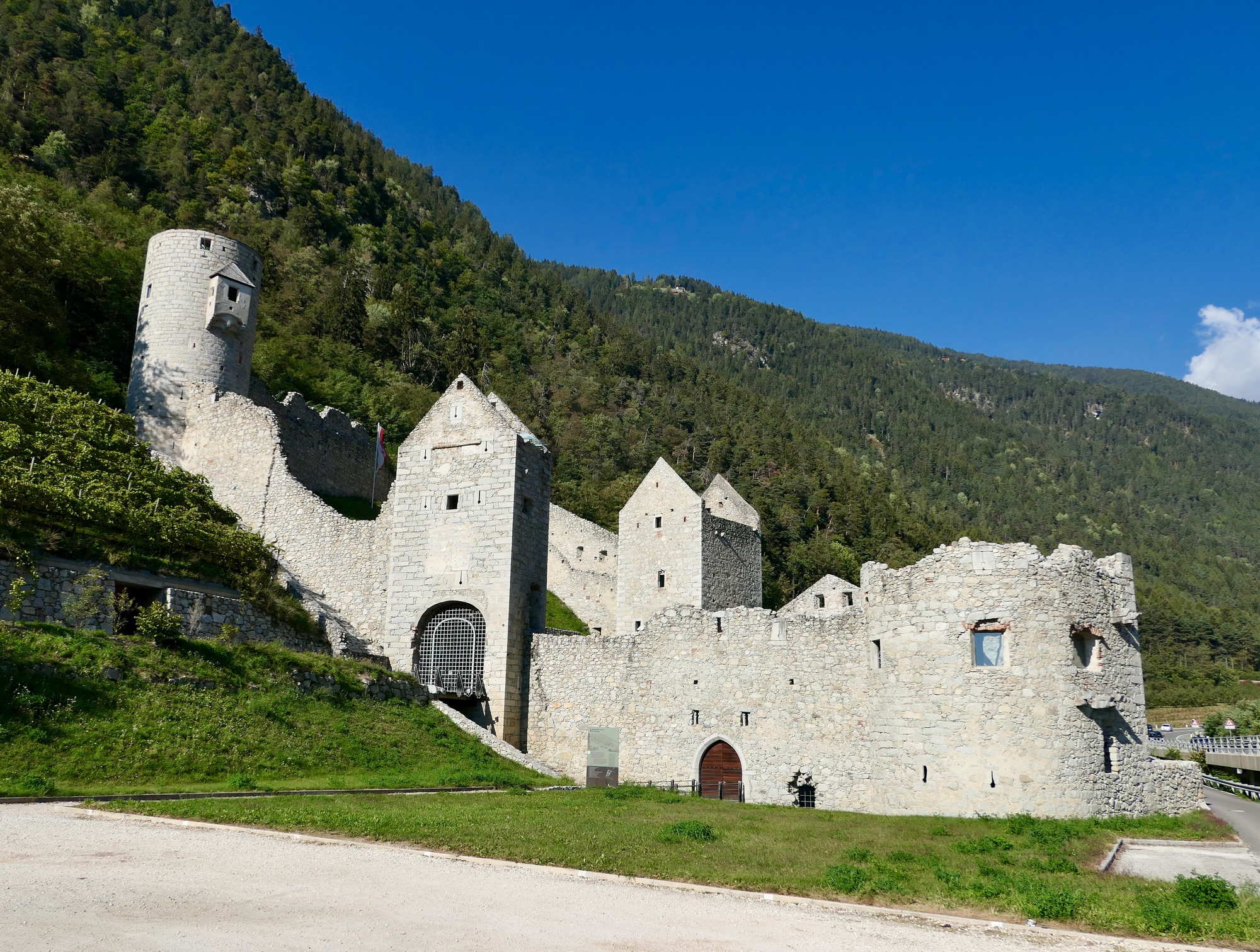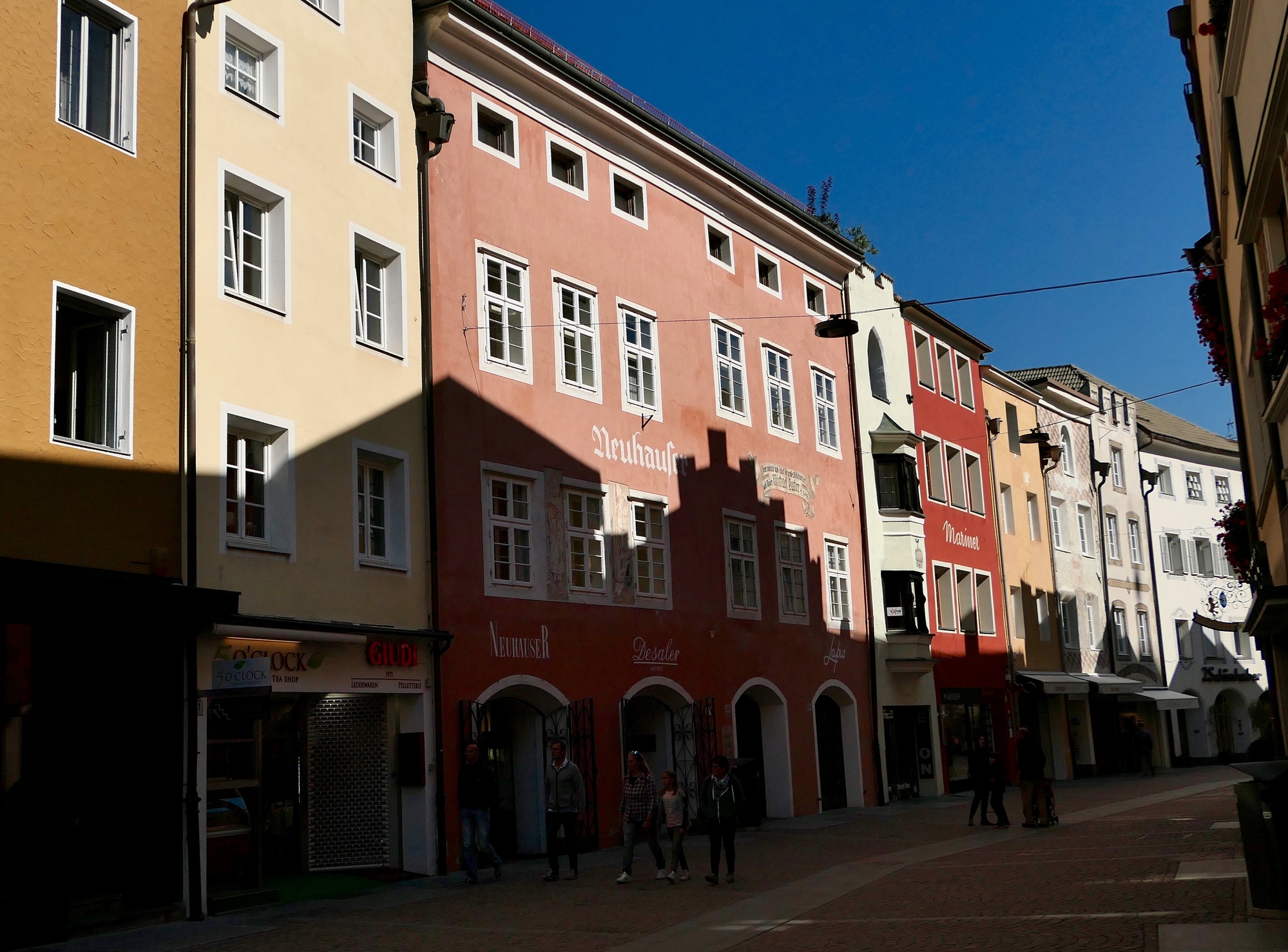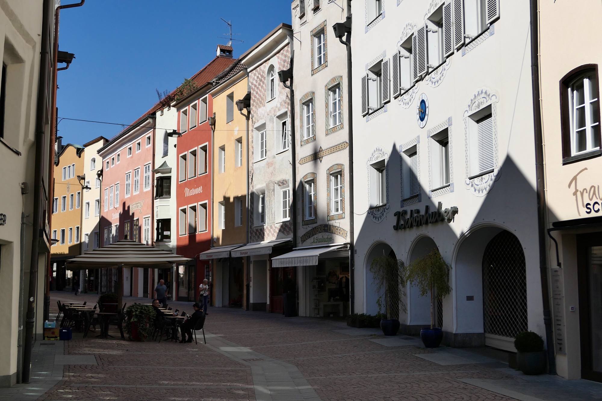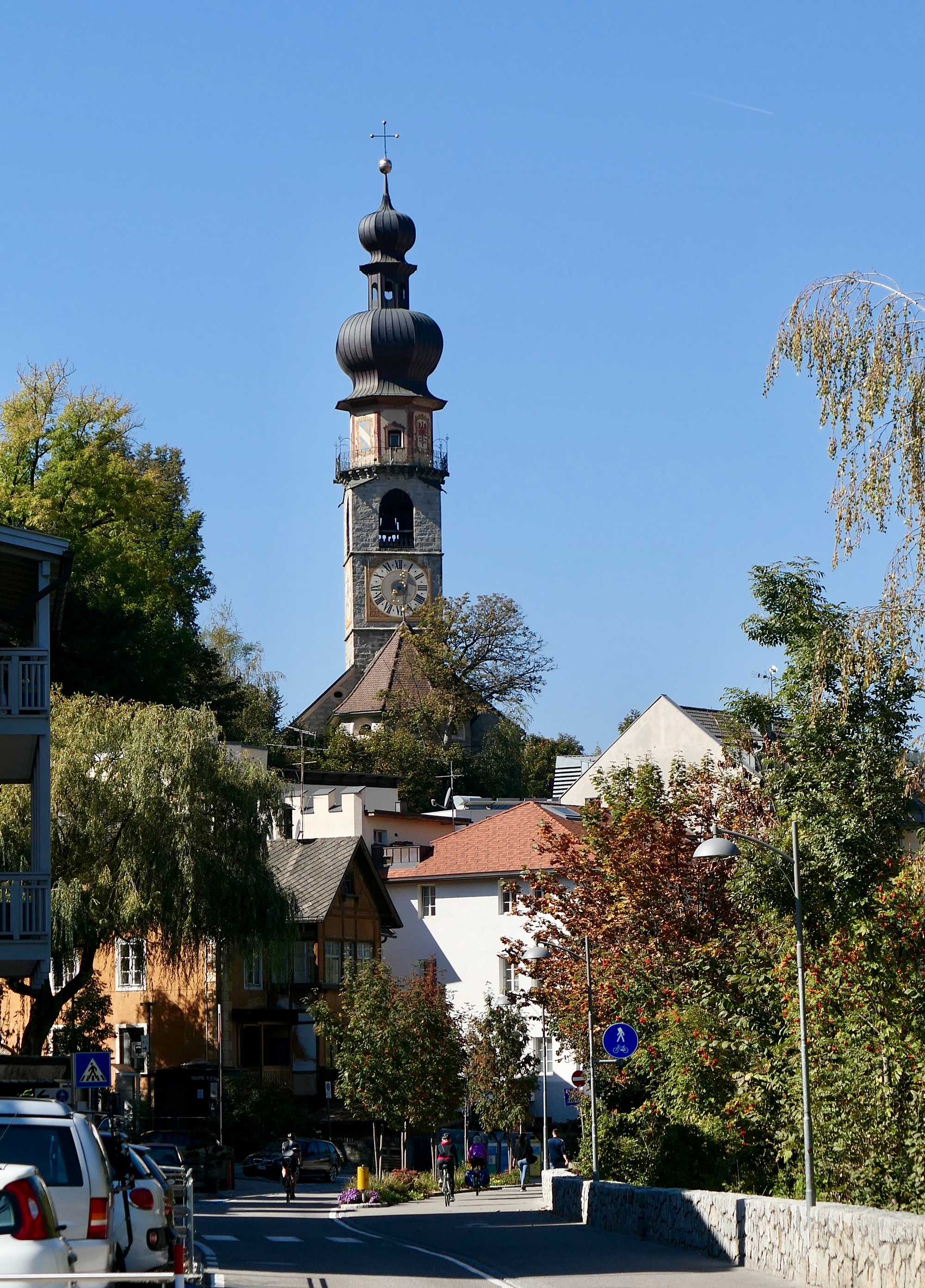 We’d love to stay here all morning, but finally we tear ourselves away and continue downstream along the Rienz for another lazy fifteen miles until we come to Brunico/Bruneck, another beautiful Tyrolean town with a well preserved historical core. If the time and distances had worked out for us, we’d have been quite happy to stay here for a night or two. As it is, we can at least spare time to enjoy our lunch here, leaning against the sunny south all of the Ursuline Church.