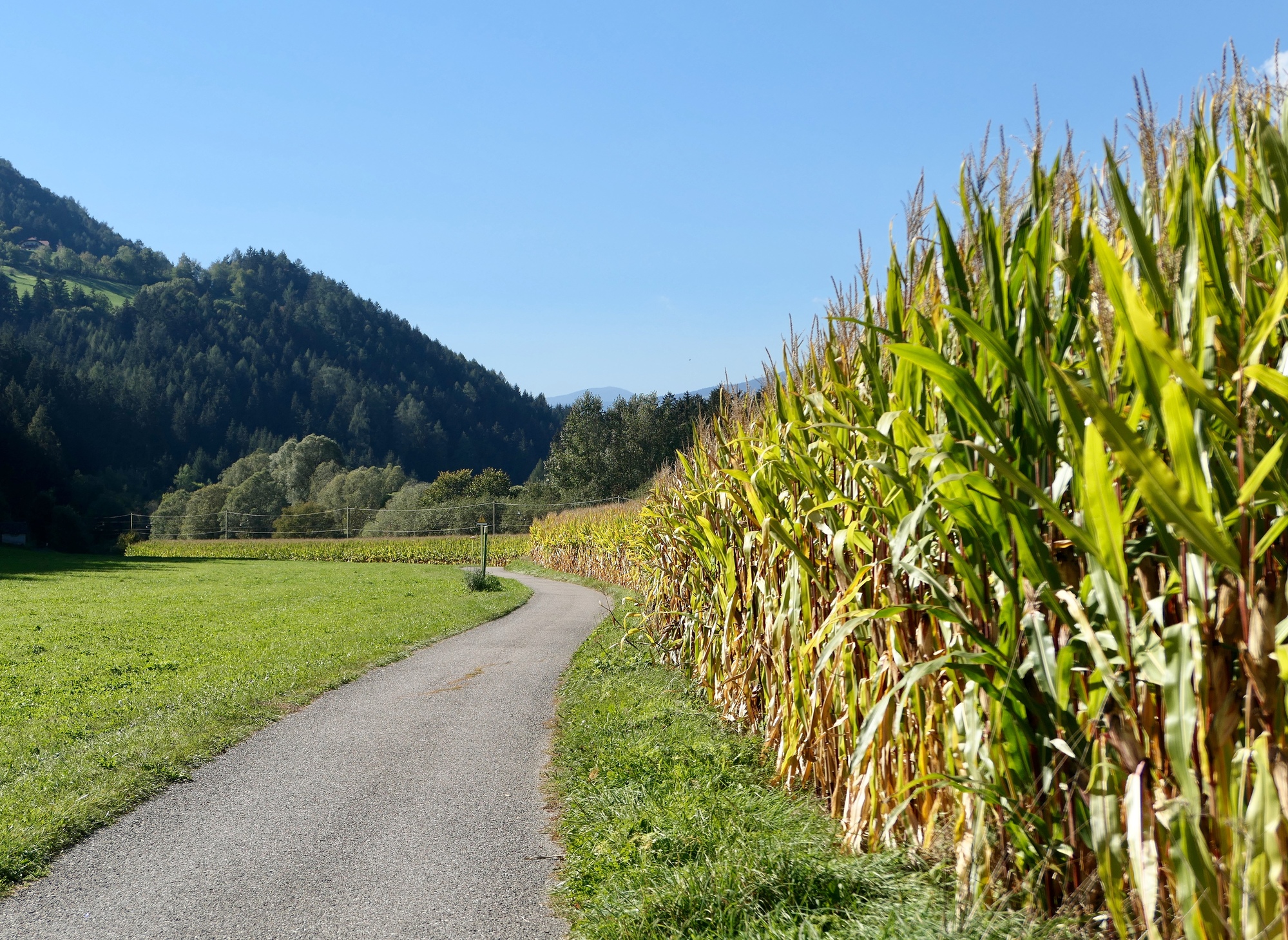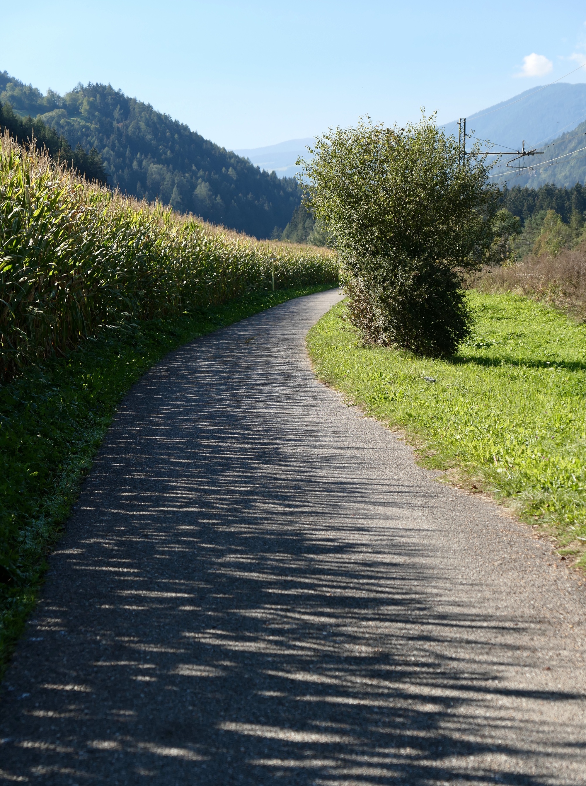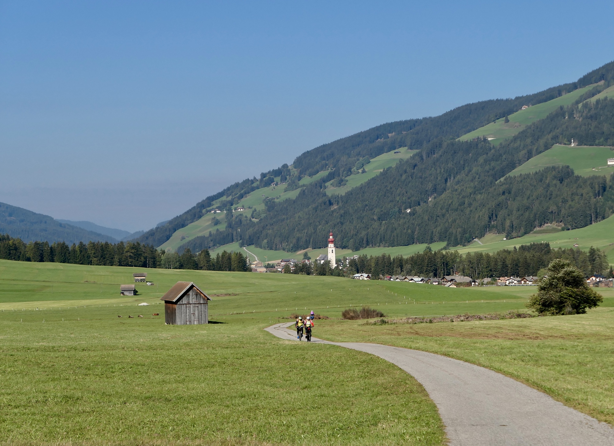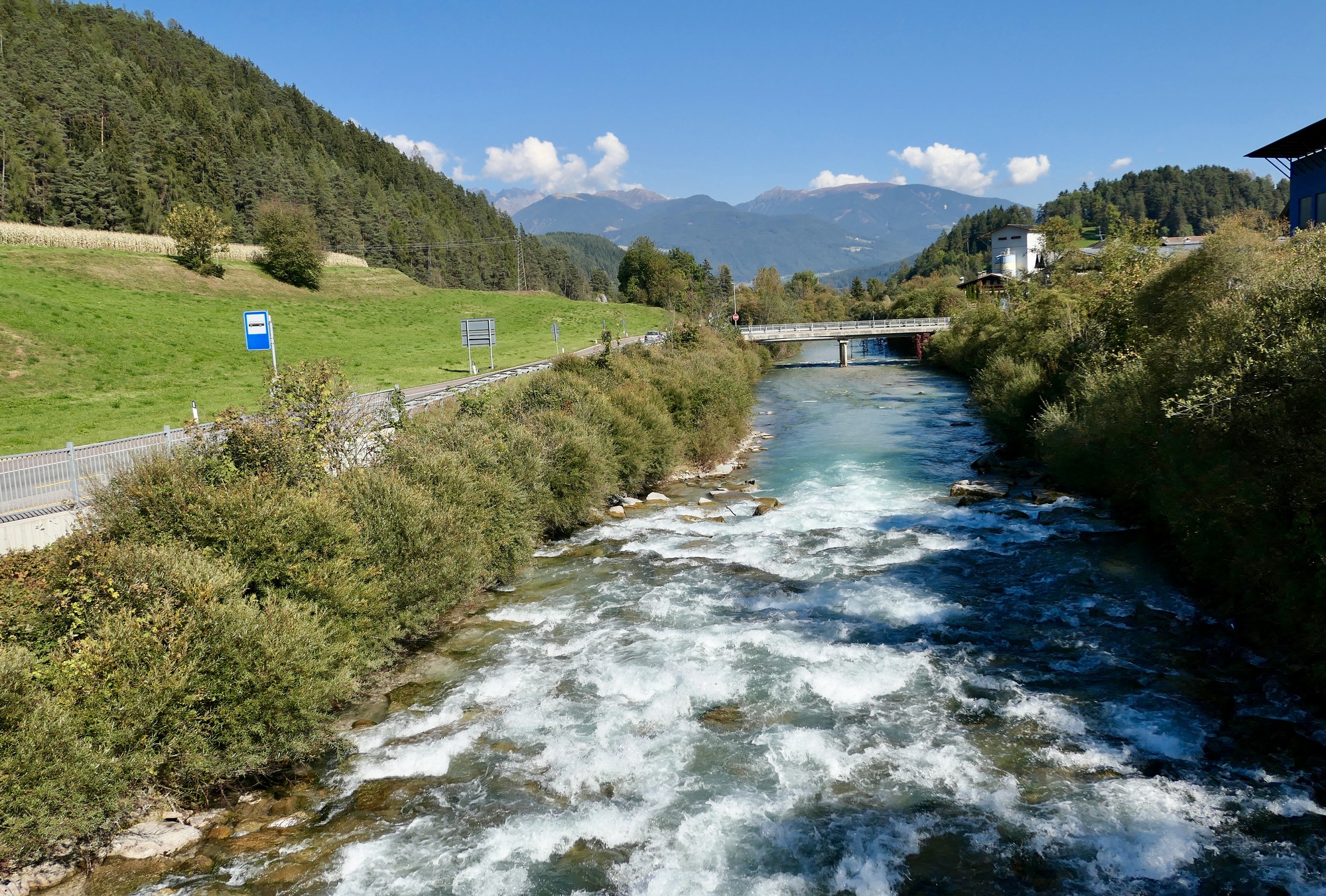 Leaving Brunico, we cycle beside the Rienz, much enlarged since merging here with the Ahr.