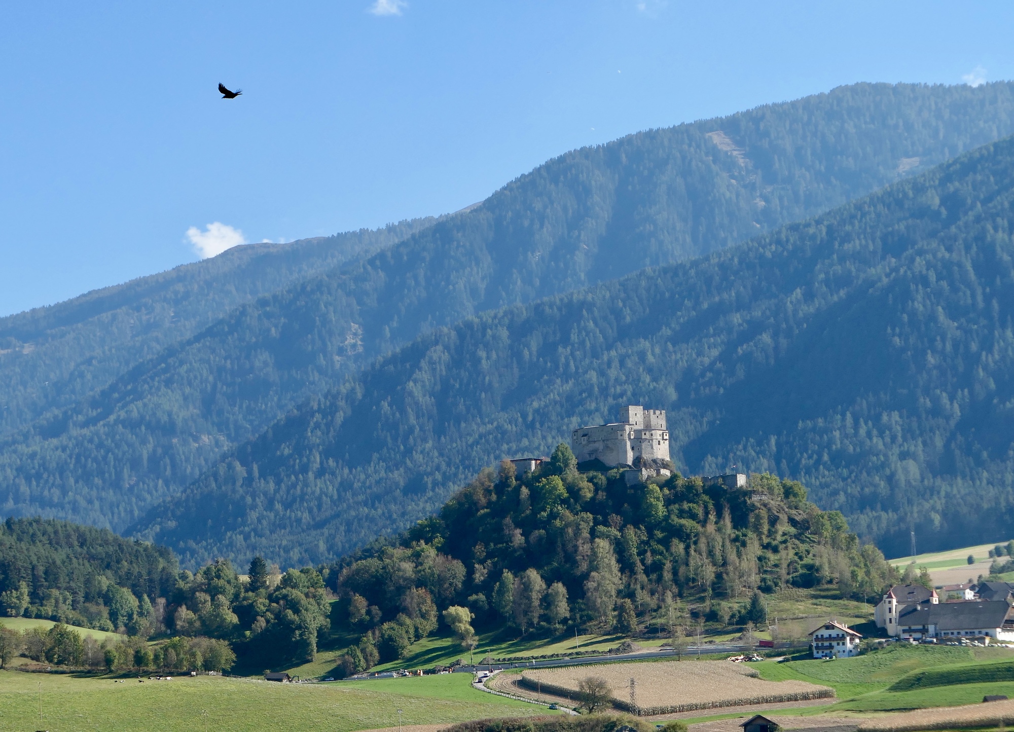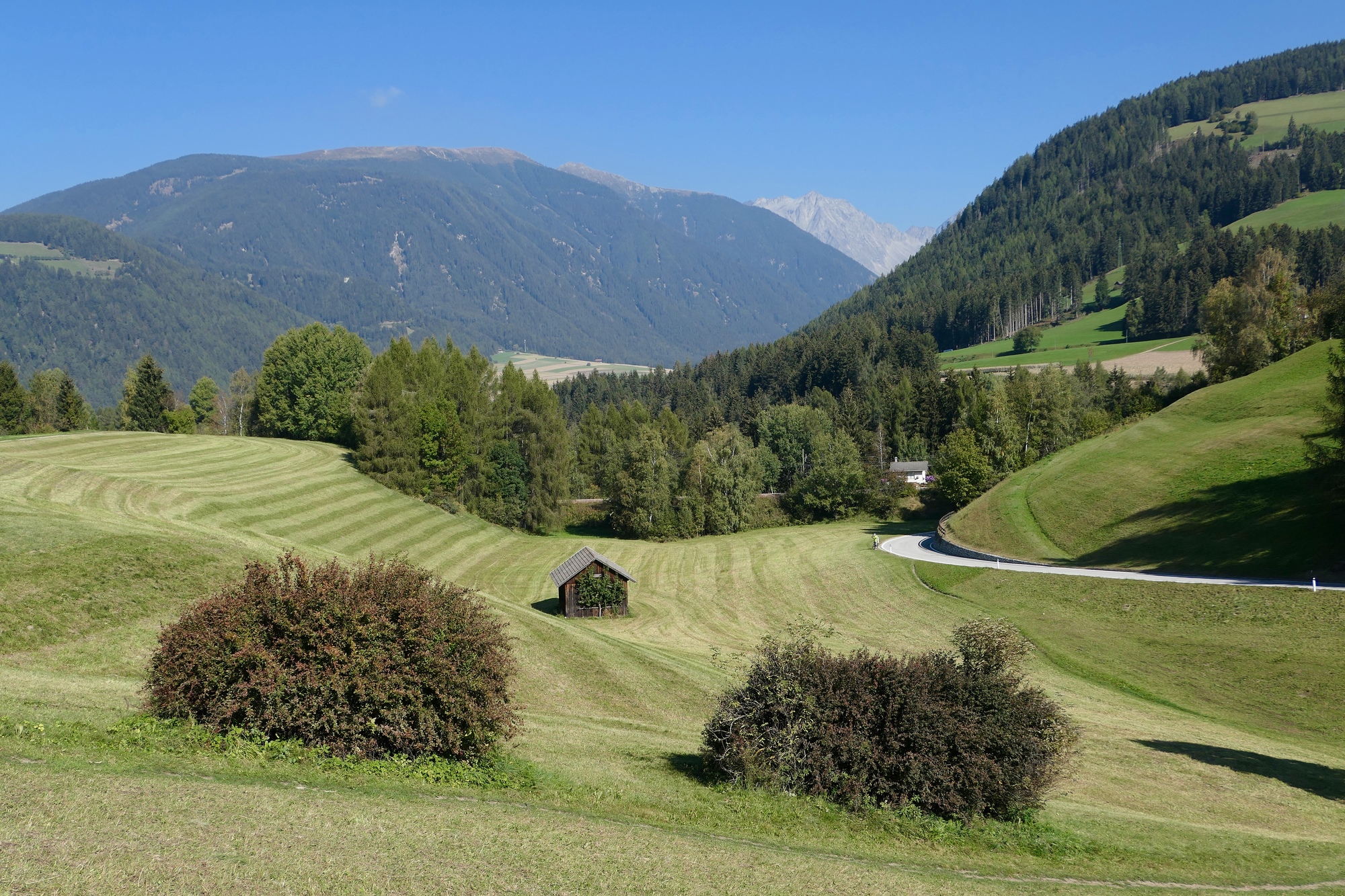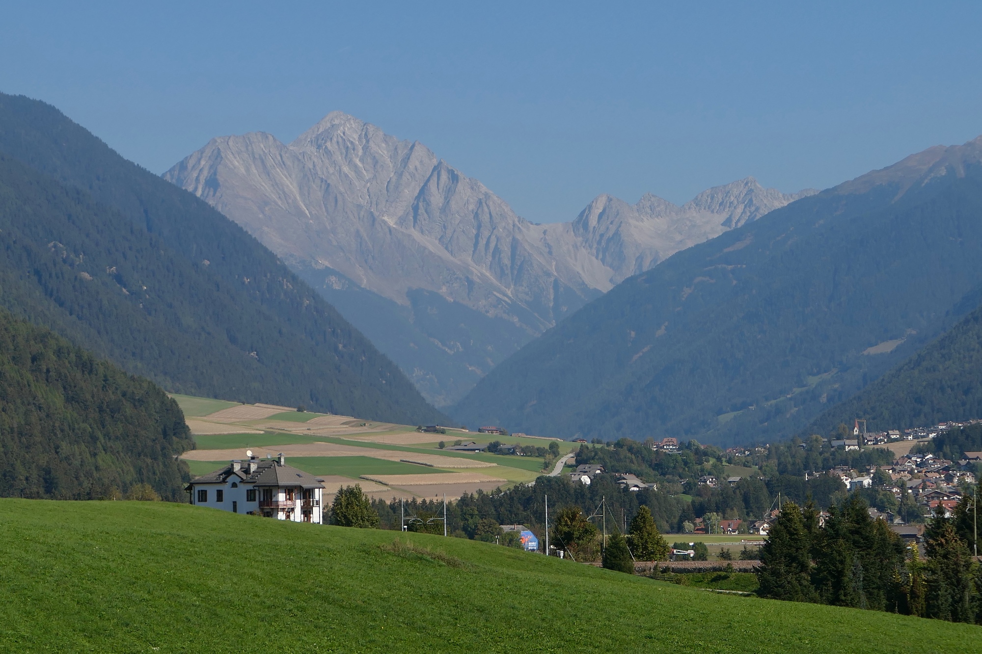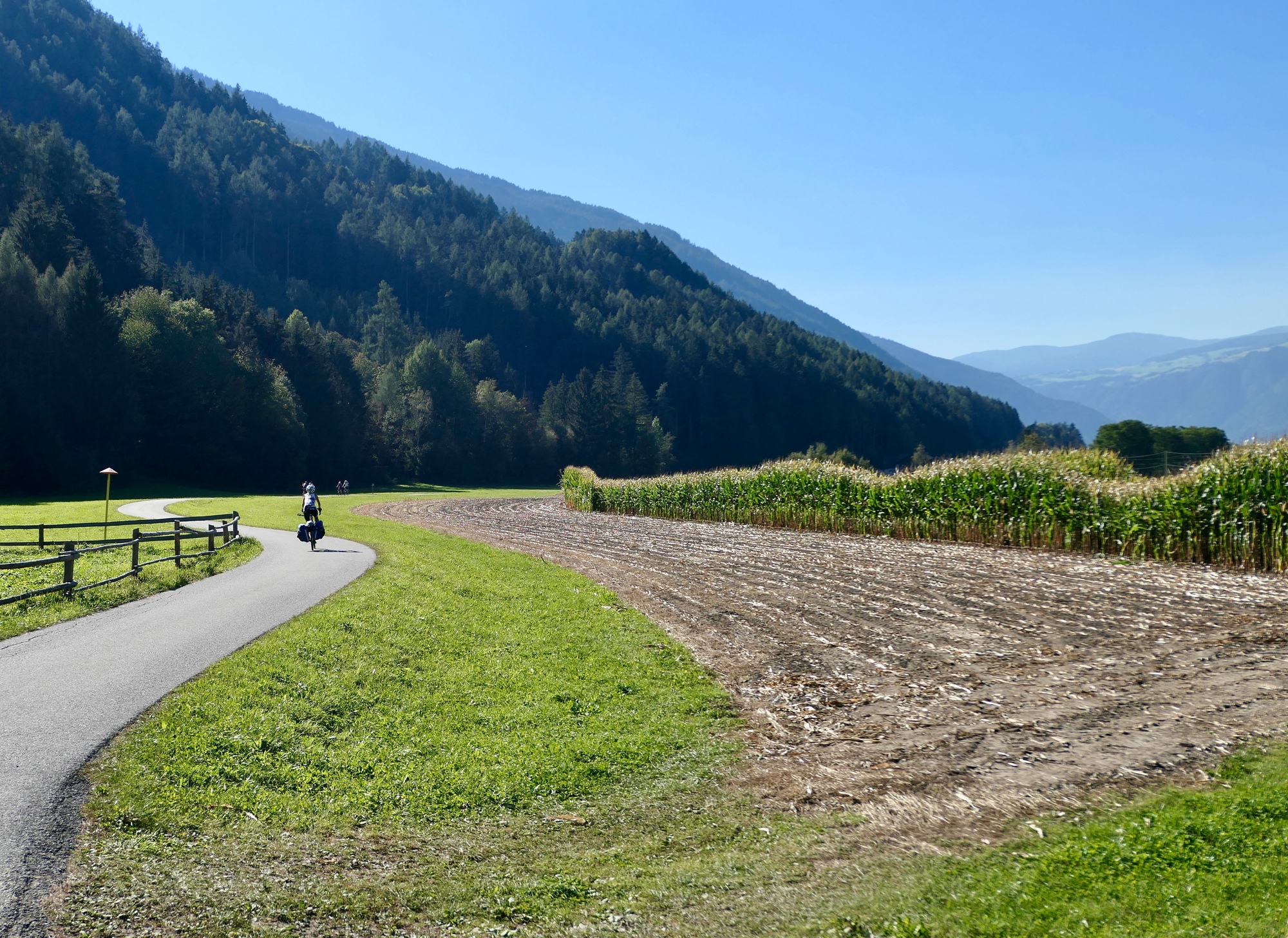 Riding west toward Brunico, we come to the Antholzer valley that we biked up two days back. The High Tauerns peek around the corner.